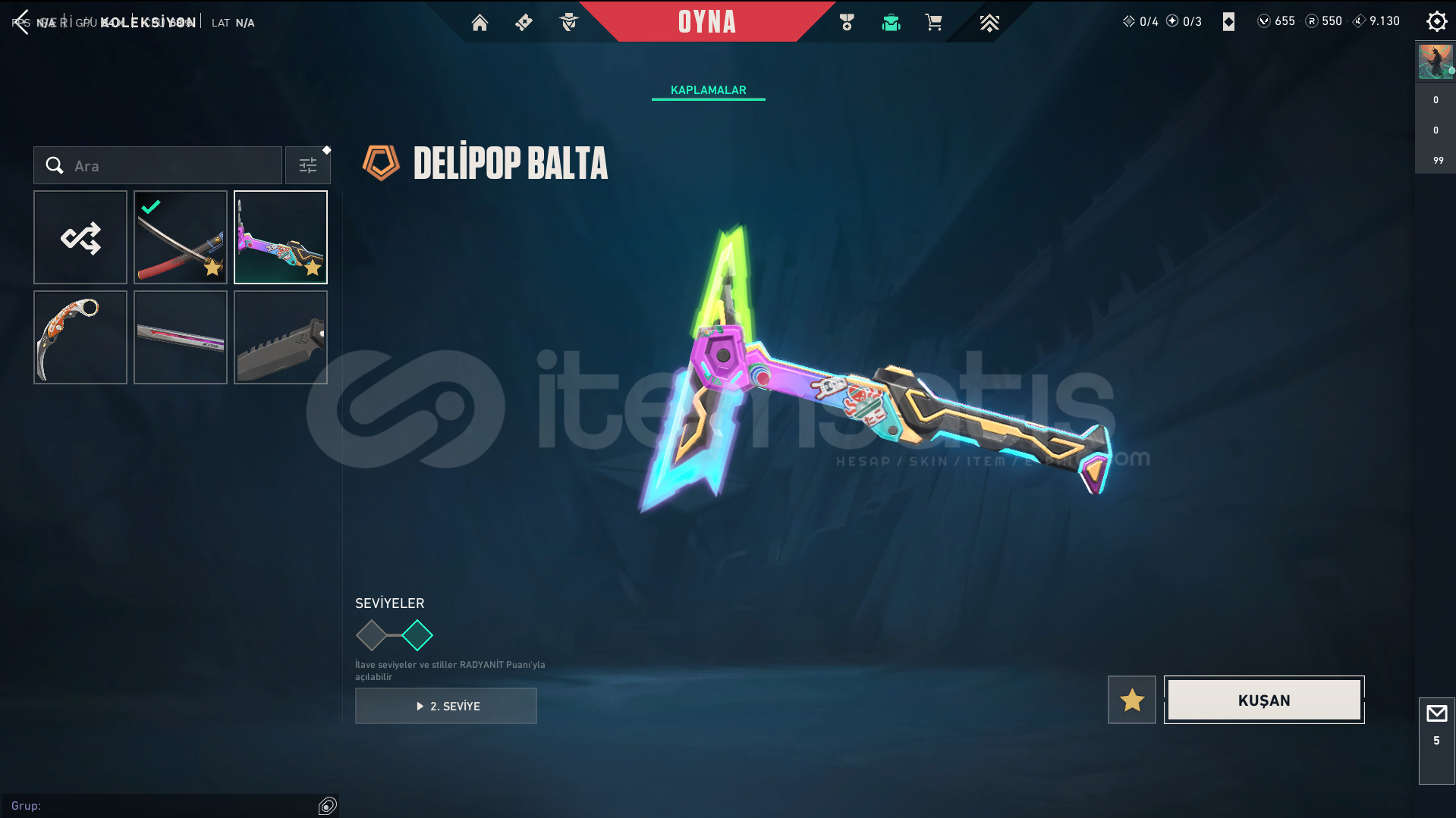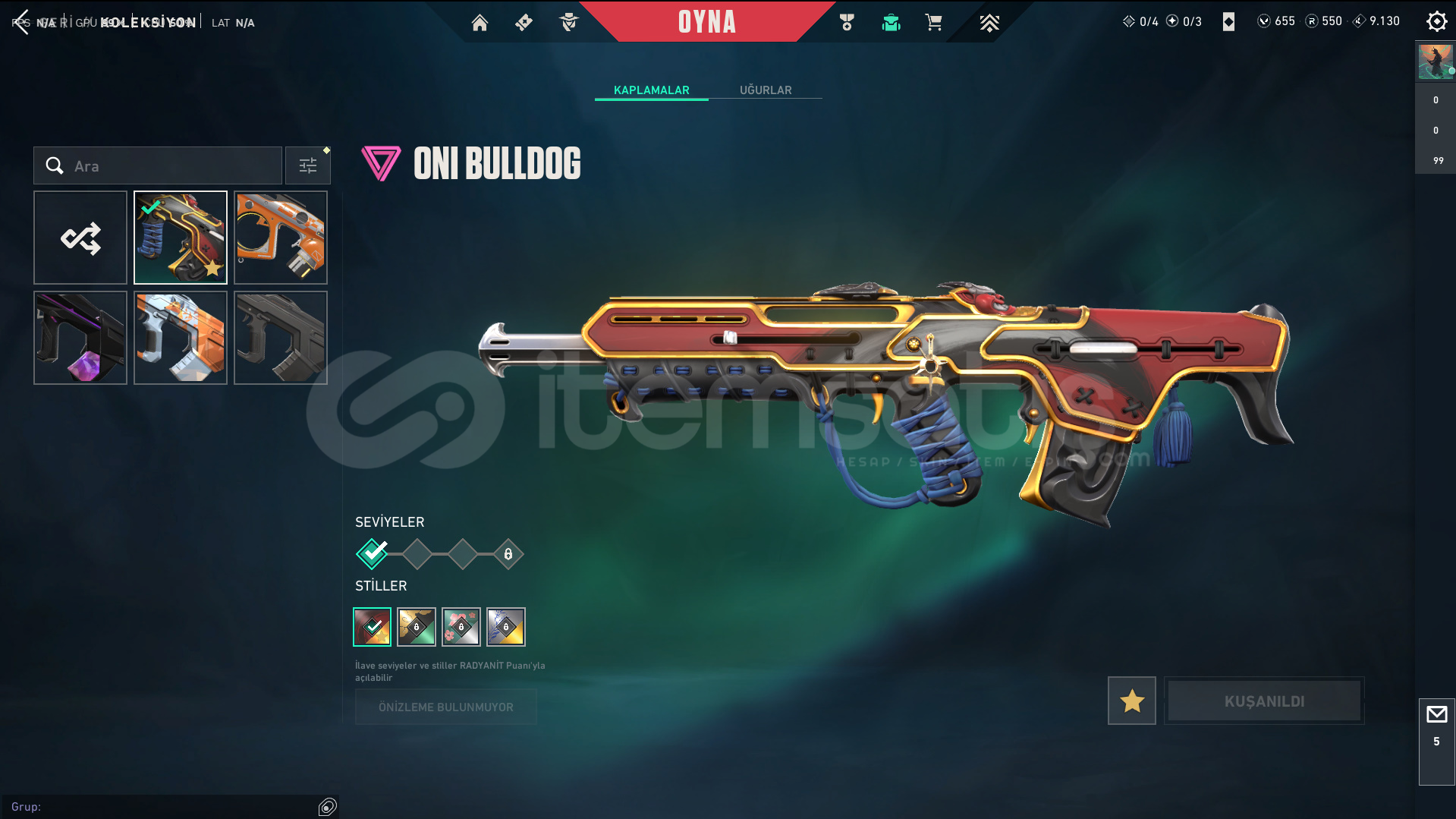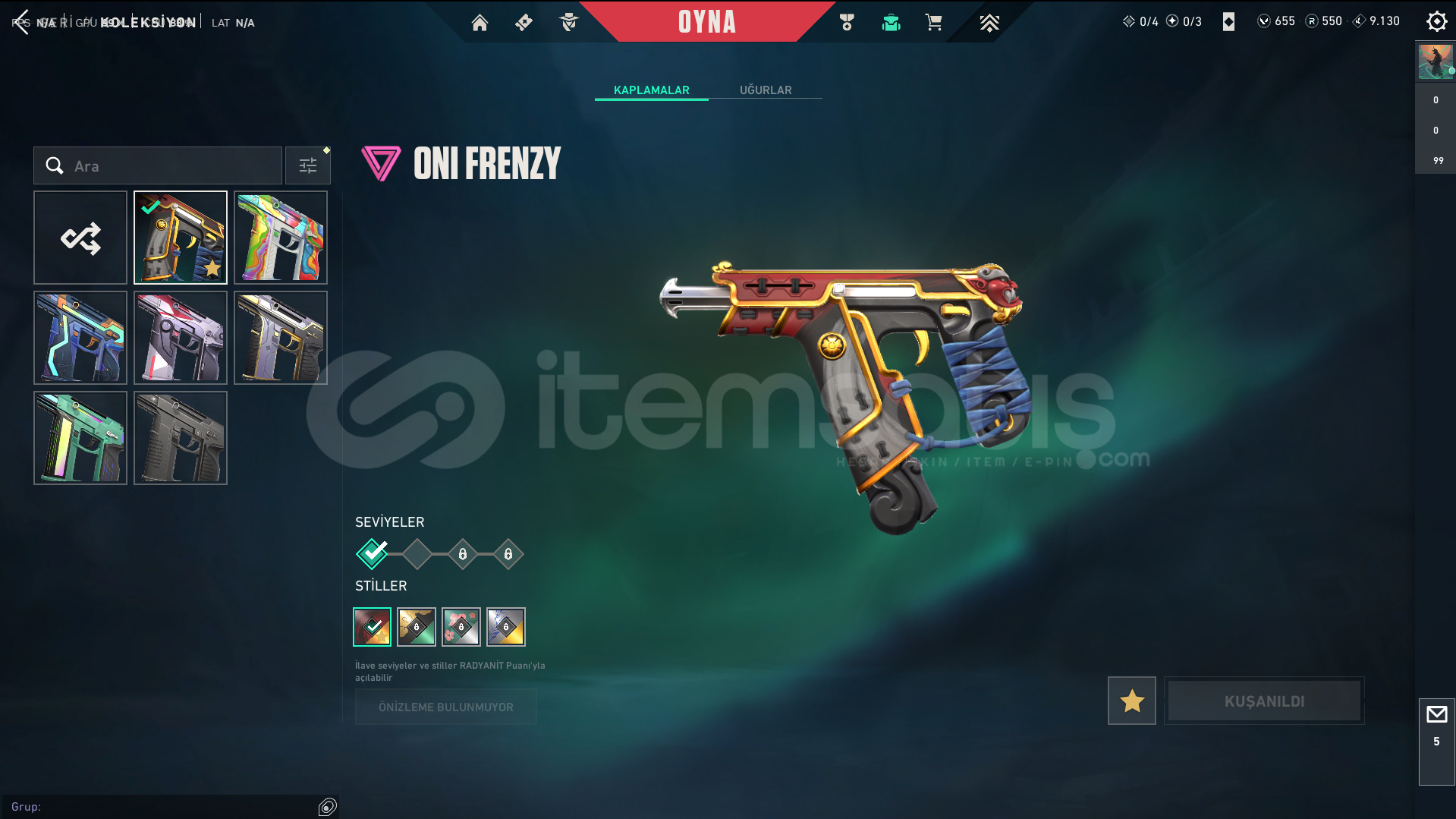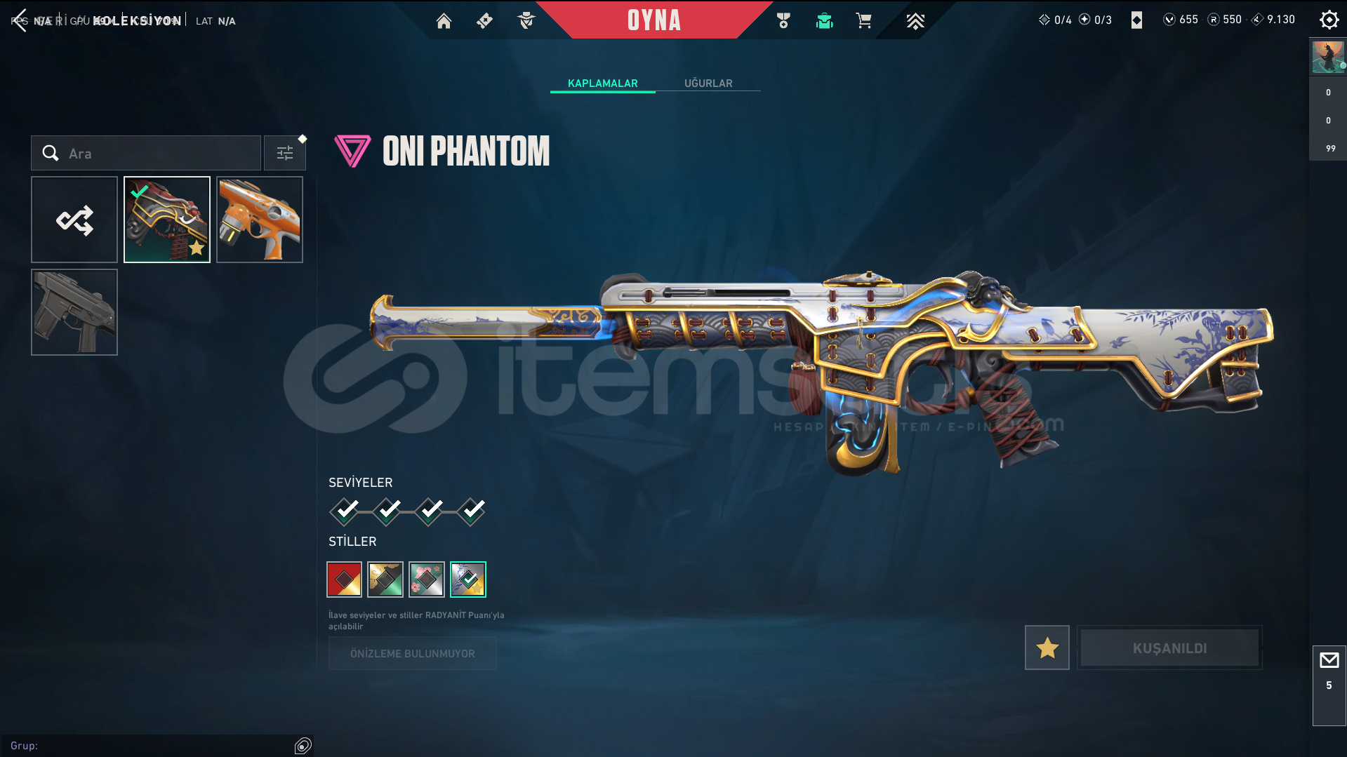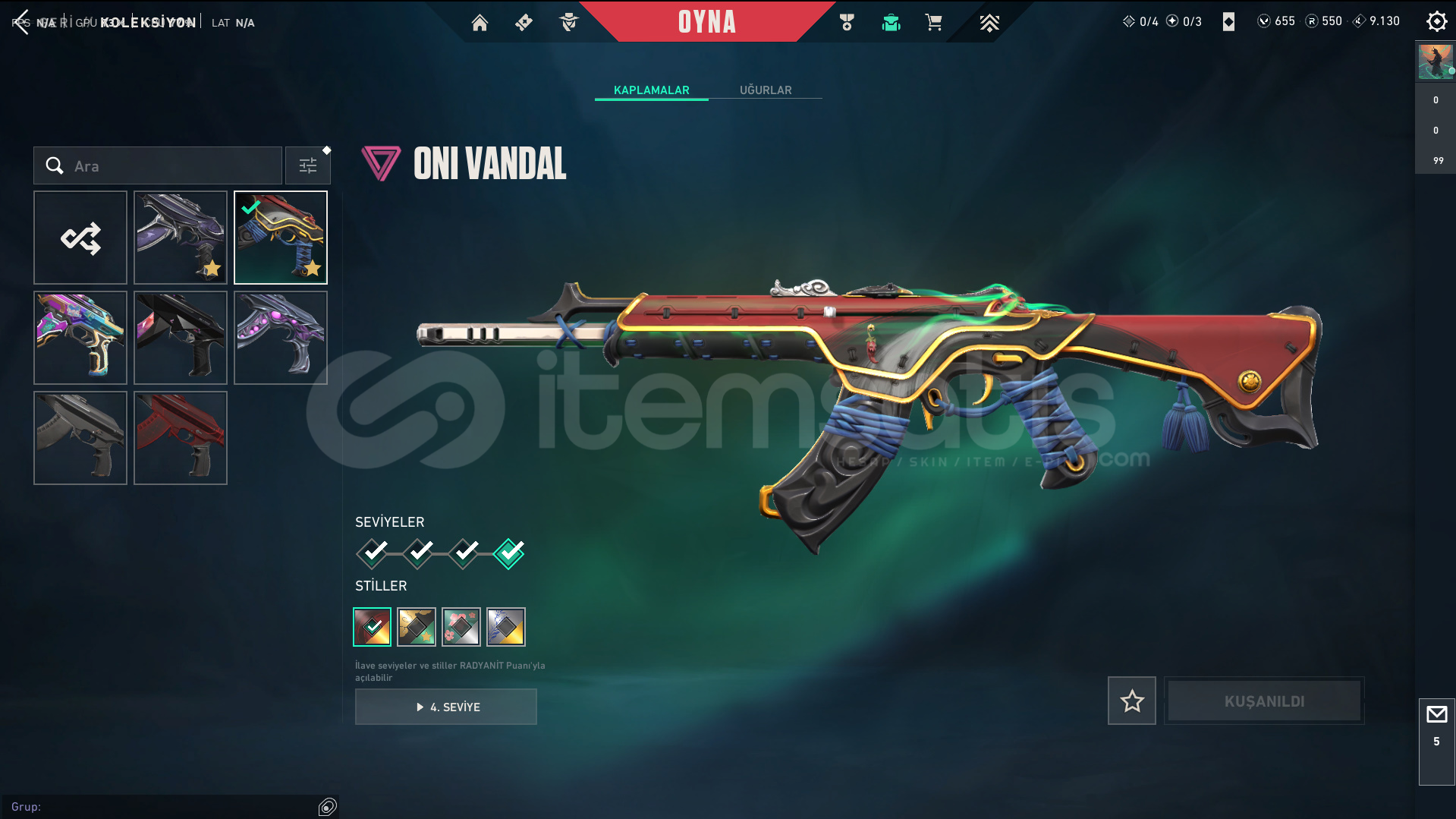 Skinler: Glitchpop Vandal - Oni Vandal - Reaver Vandal / Oni Phantom / Oni Frenzy / Aemondir Sheriff / Oni Ares / Oni Bulldog / Onimaru Kunitsuna - Glitchpop Axe - K/TAC Blade - Velocity Karambit VE DAHA SAYAMADIKLARIM İLE BİRLİKTE TOPLAM 60 SKİN MEVCUTTUR.