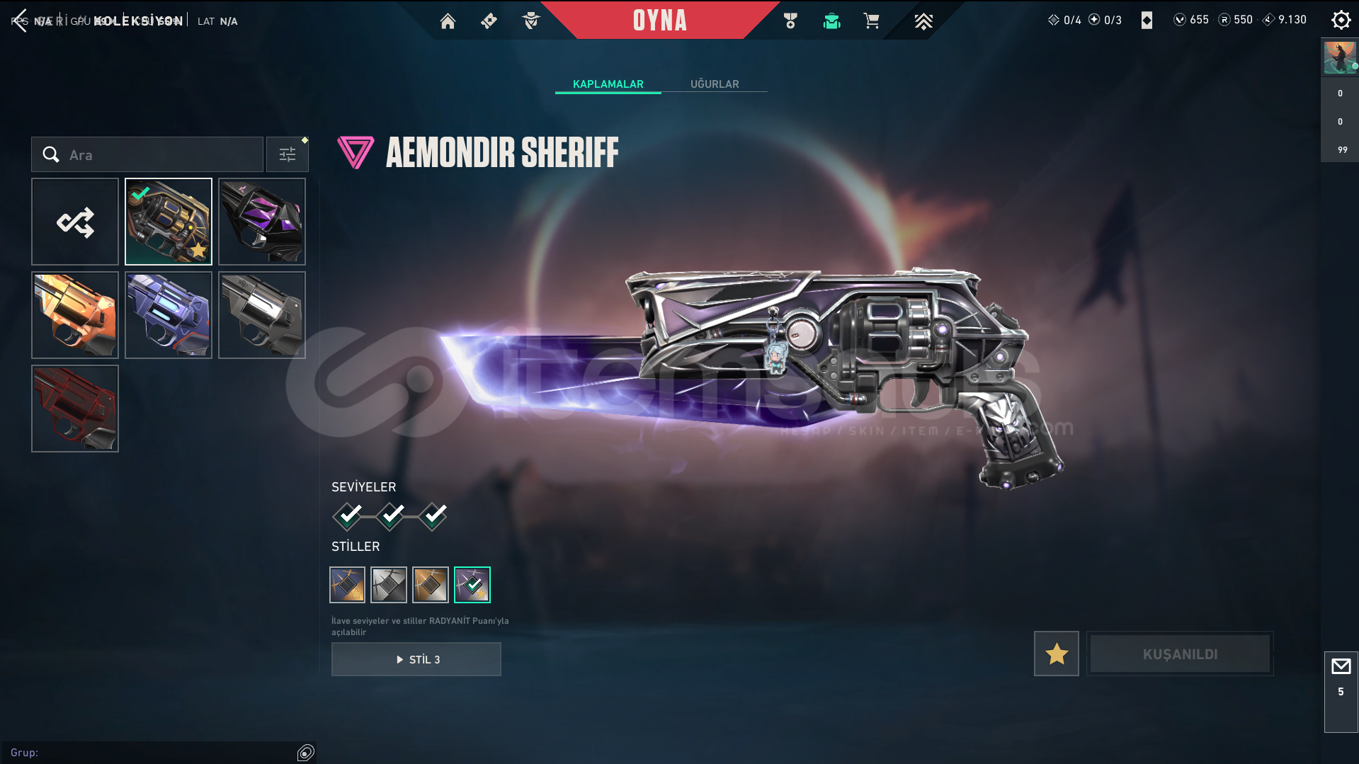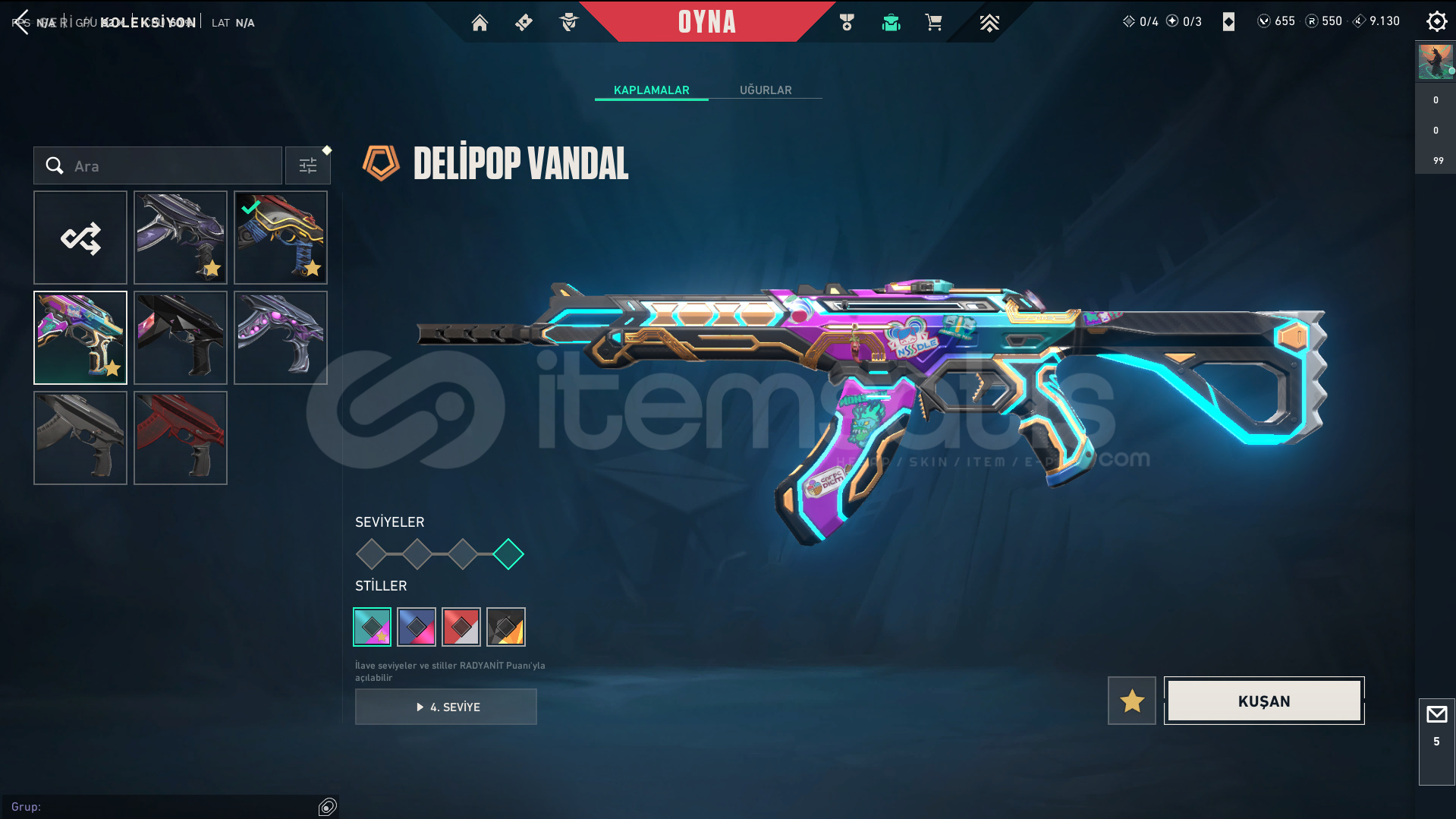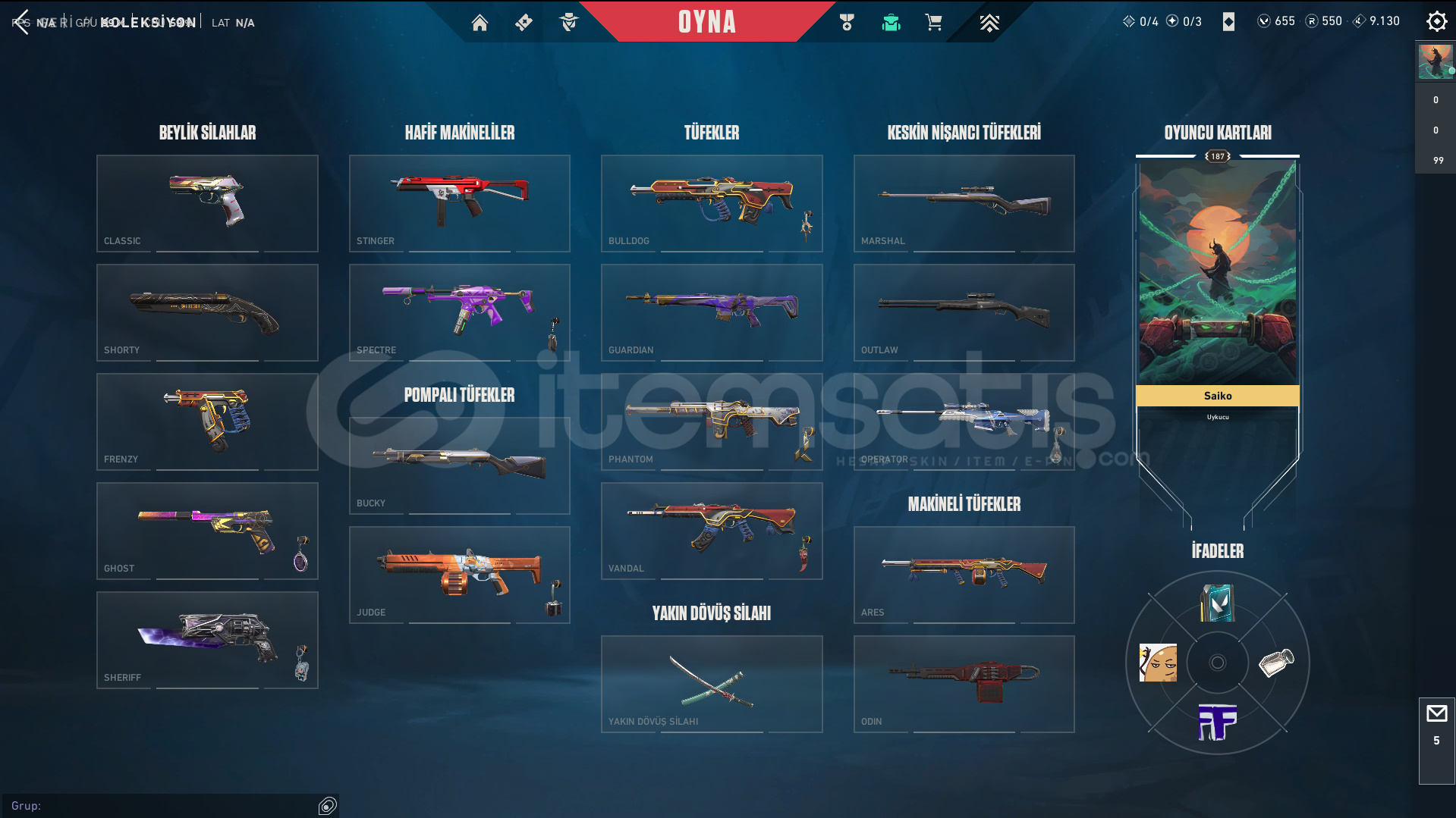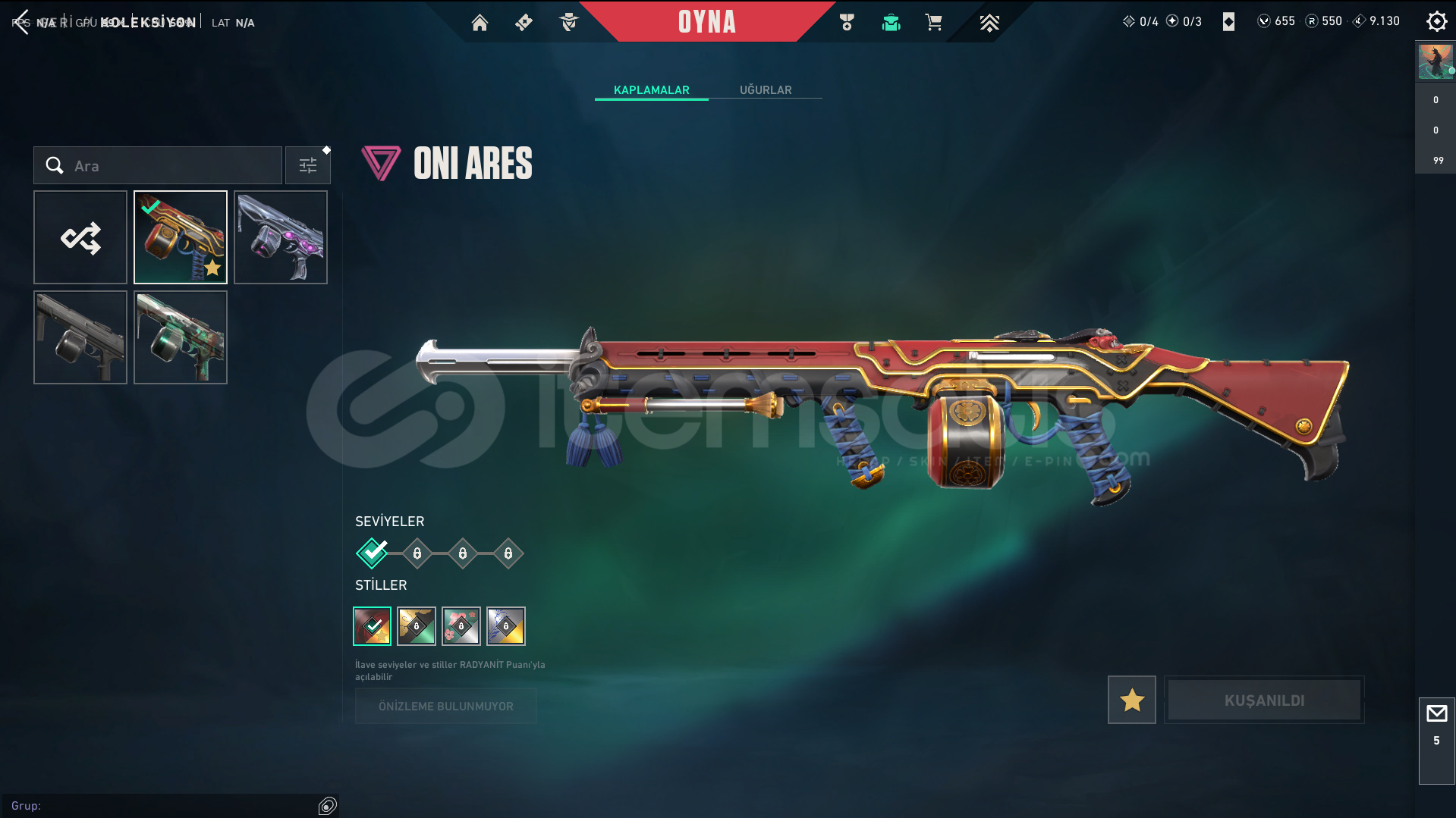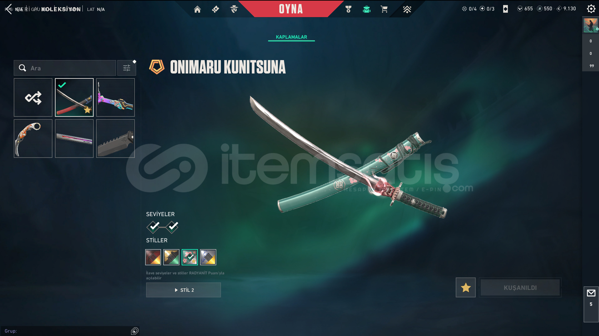 Skinler: Glitchpop Vandal - Oni Vandal - Reaver Vandal / Oni Phantom / Oni Frenzy / Aemondir Sheriff / Oni Ares / Oni Bulldog / Onimaru Kunitsuna - Glitchpop Axe - K/TAC Blade - Velocity Karambit VE DAHA SAYAMADIKLARIM İLE BİRLİKTE TOPLAM 60 SKİN MEVCUTTUR.