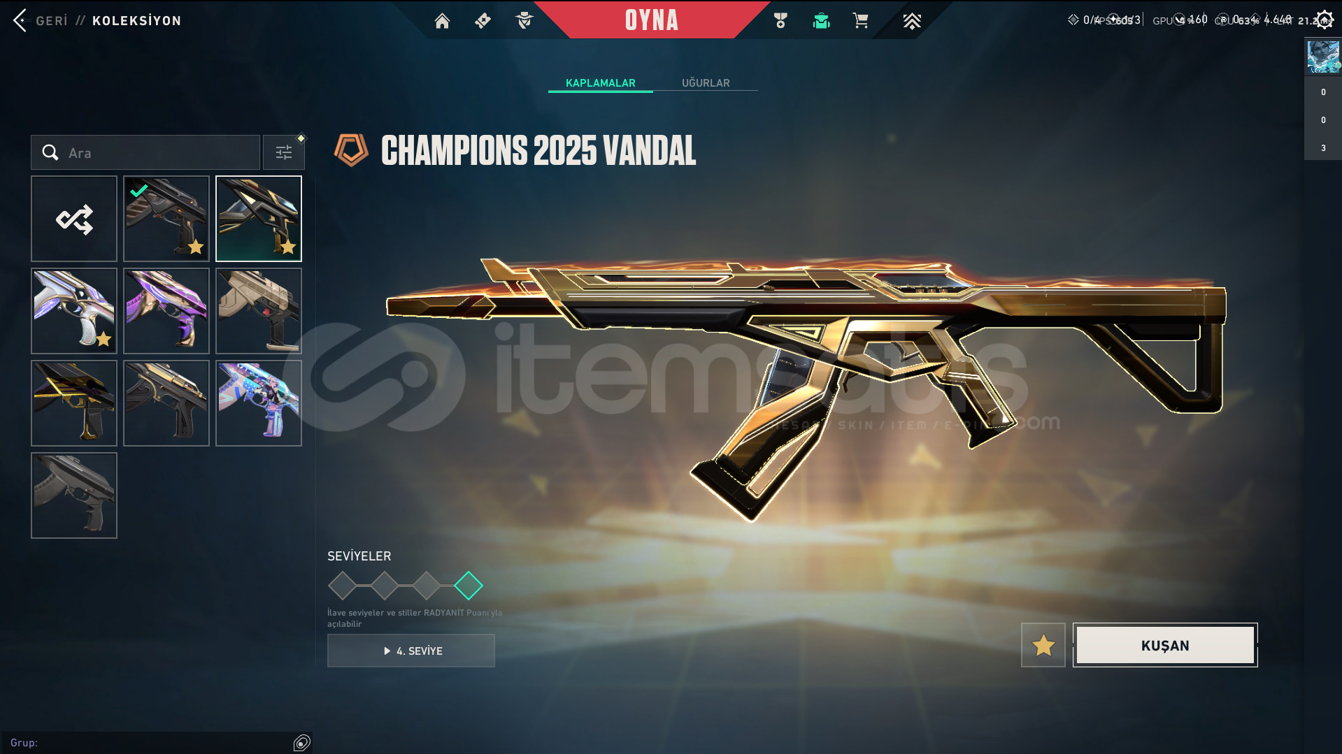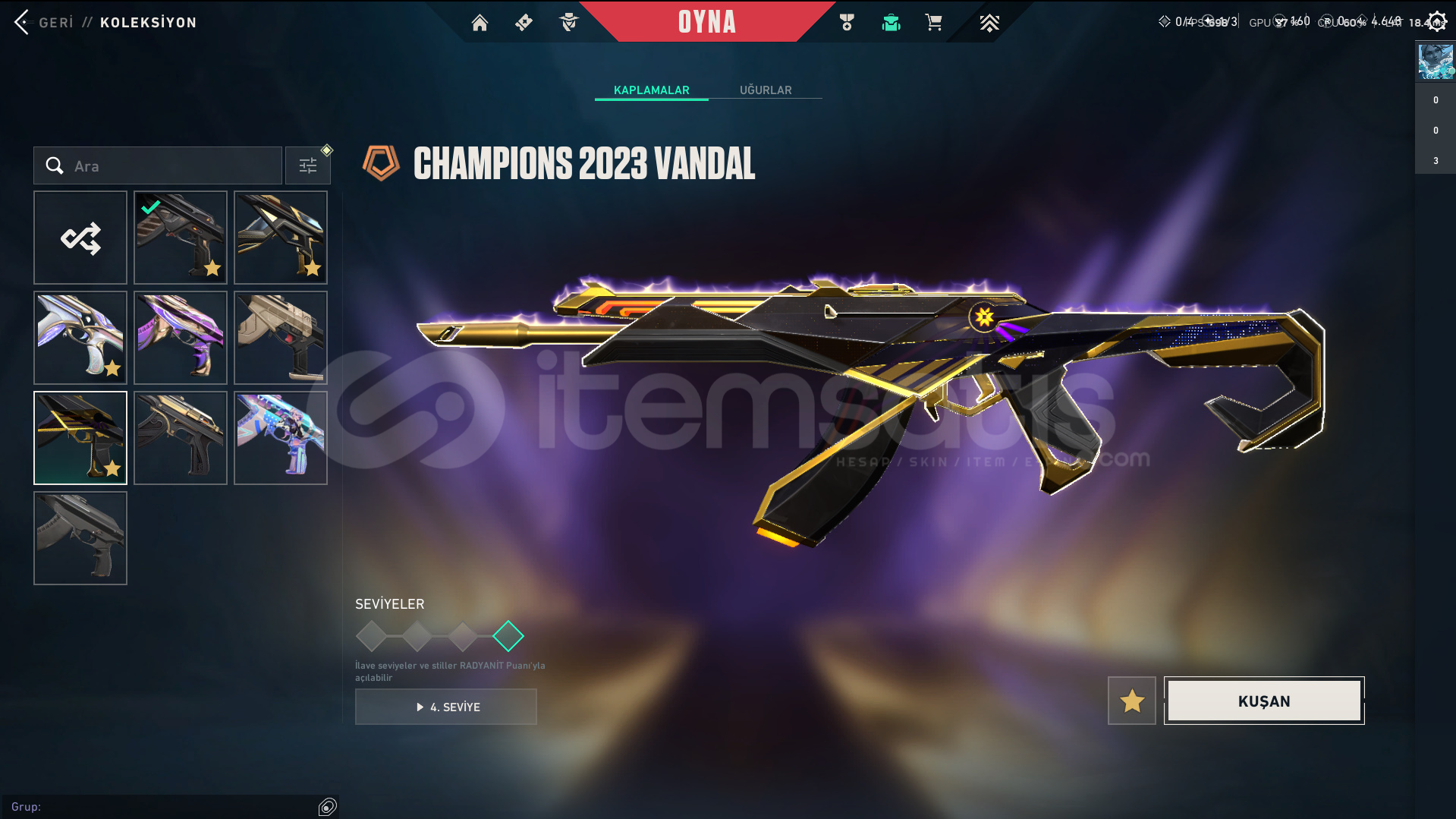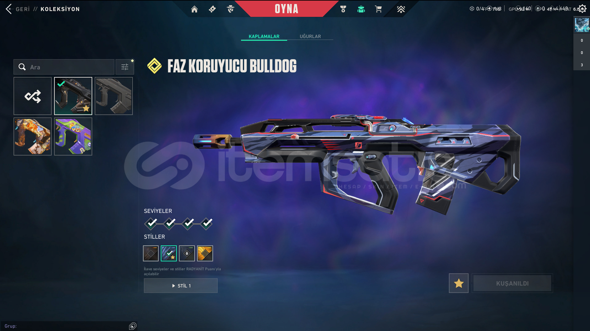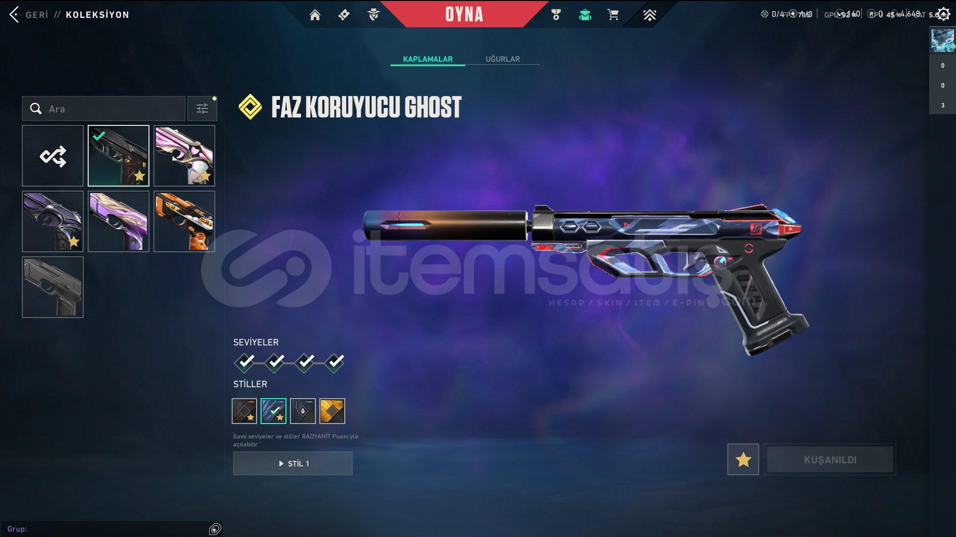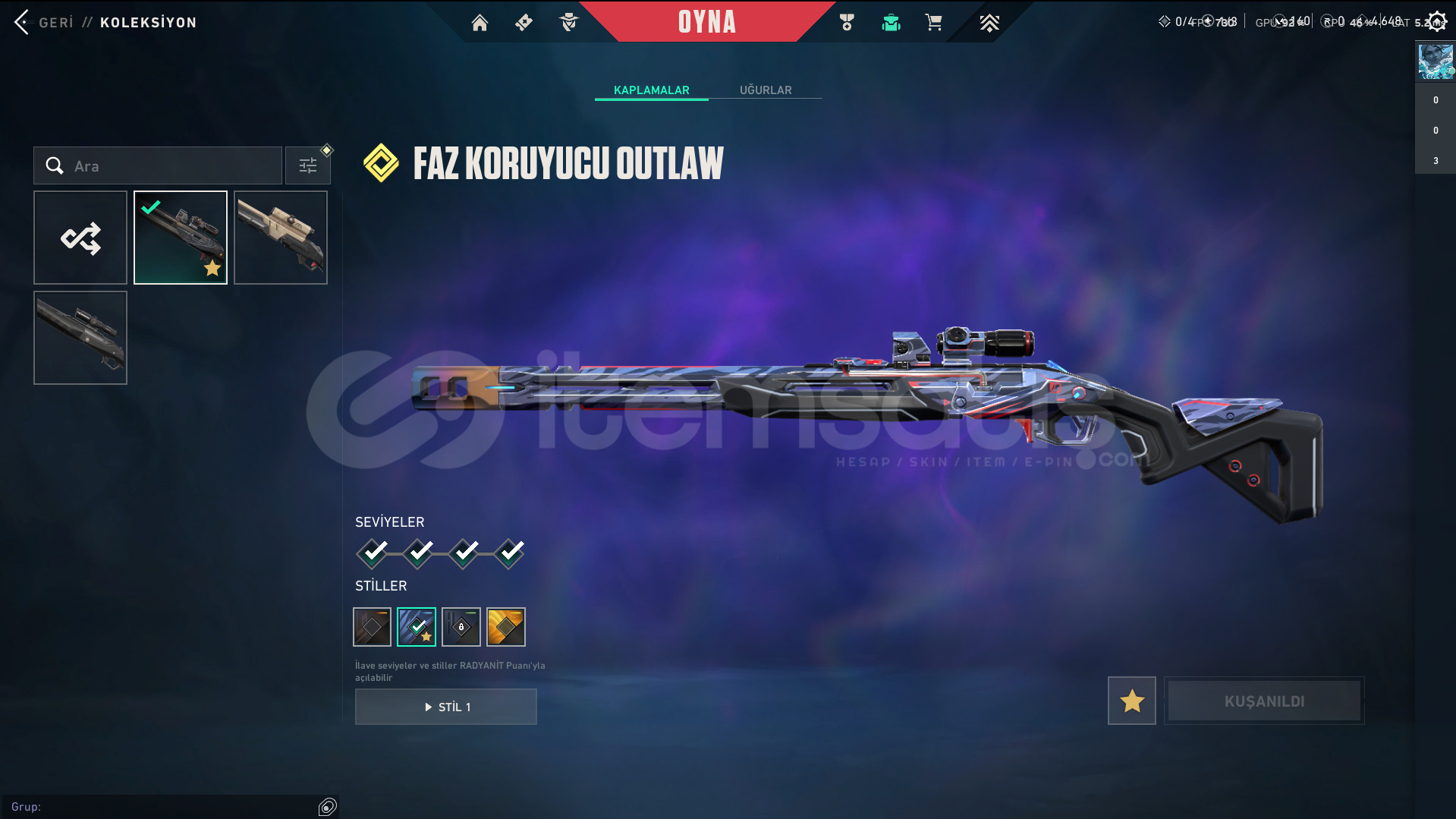 Skinler: Evori Dreamwings Vandal - Phaseguard Vandal - Champions 2025 Vandal - Champions 2023 Vandal / Ruination Phantom / Reaver Ghost - Phaseguard Ghost - Evori Dreamwings Ghost / Singularity Sheriff / Phaseguard Bulldog / Phaseguard Outlaw / Evori Dreamwings Spectre / Evori Dreamwings Odin / ATLAS // CMD Baton - Evori's Spellcaster - Interhelm Sword - Champions 2025 Butterfly Knife - Phaseguard Splitter VE DAHA SAYAMADIKLARIM İLE BİRLİKTE TOPLAM 64 SKİN MEVCUTTUR.