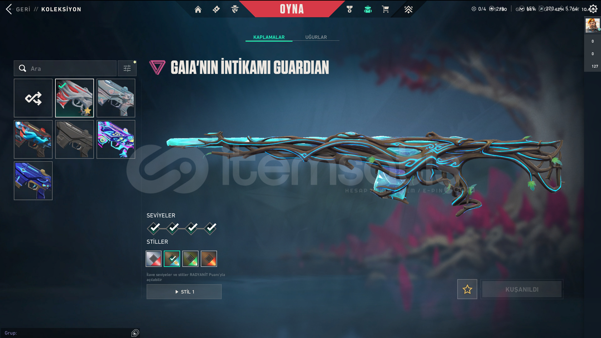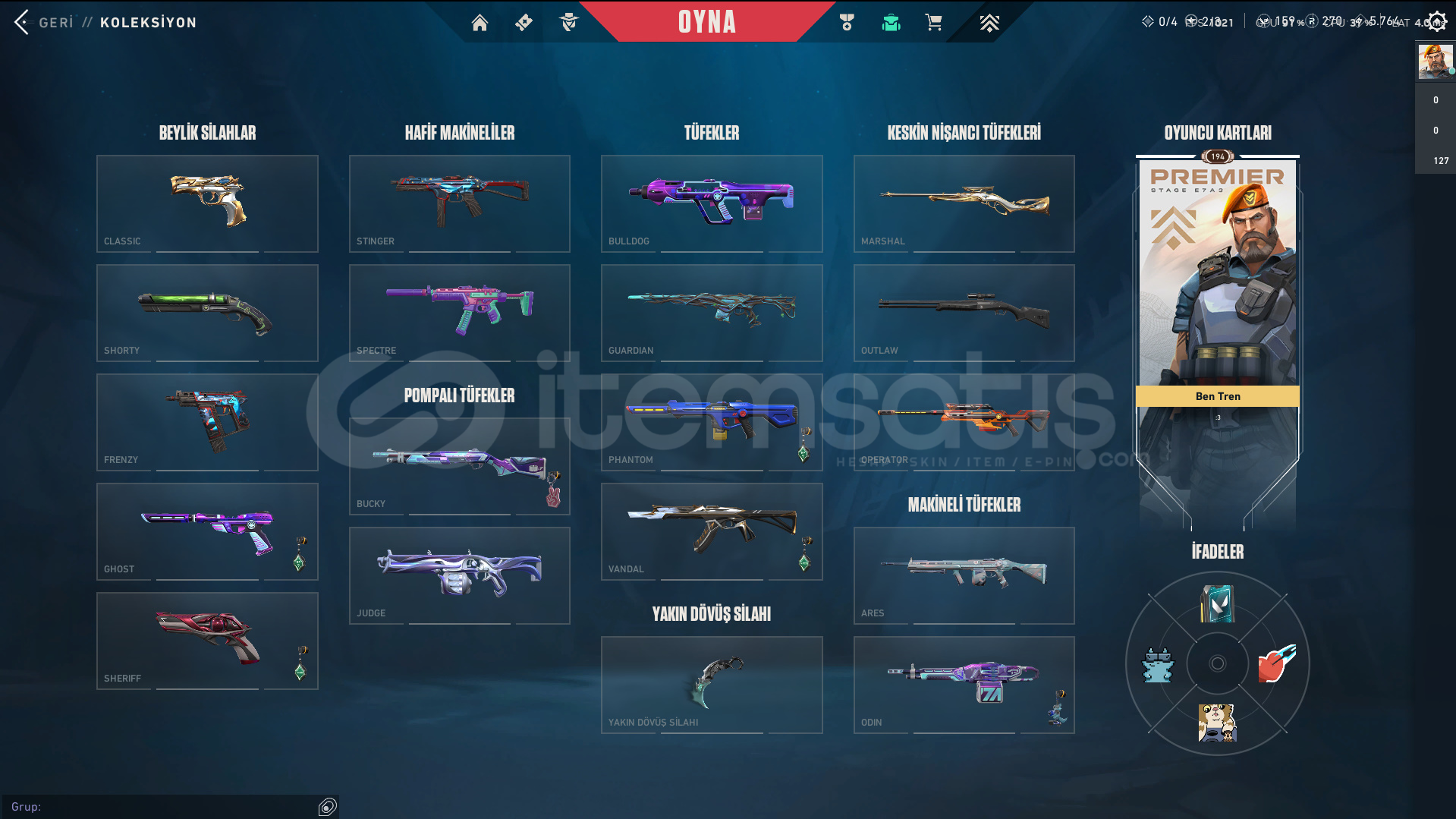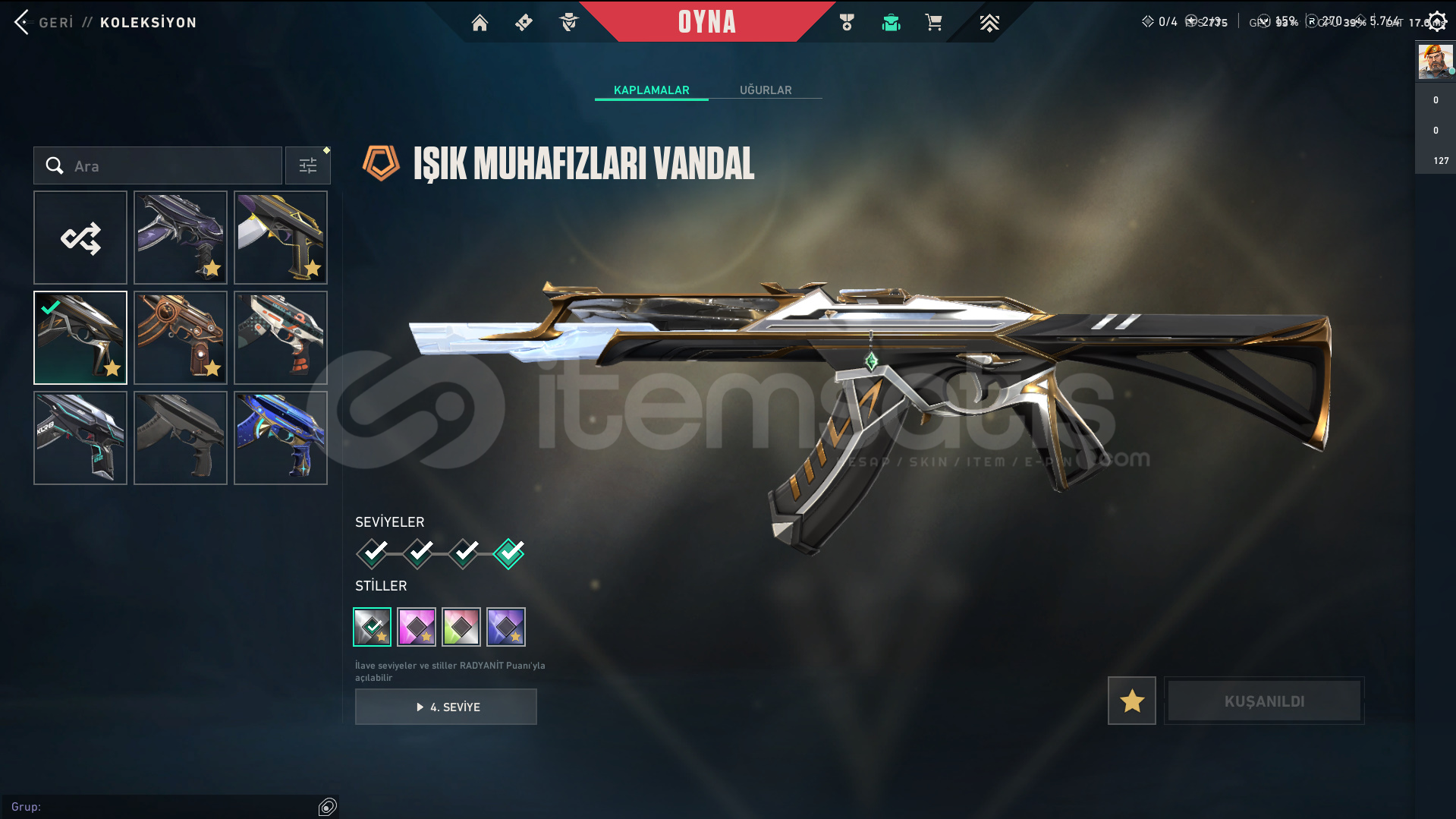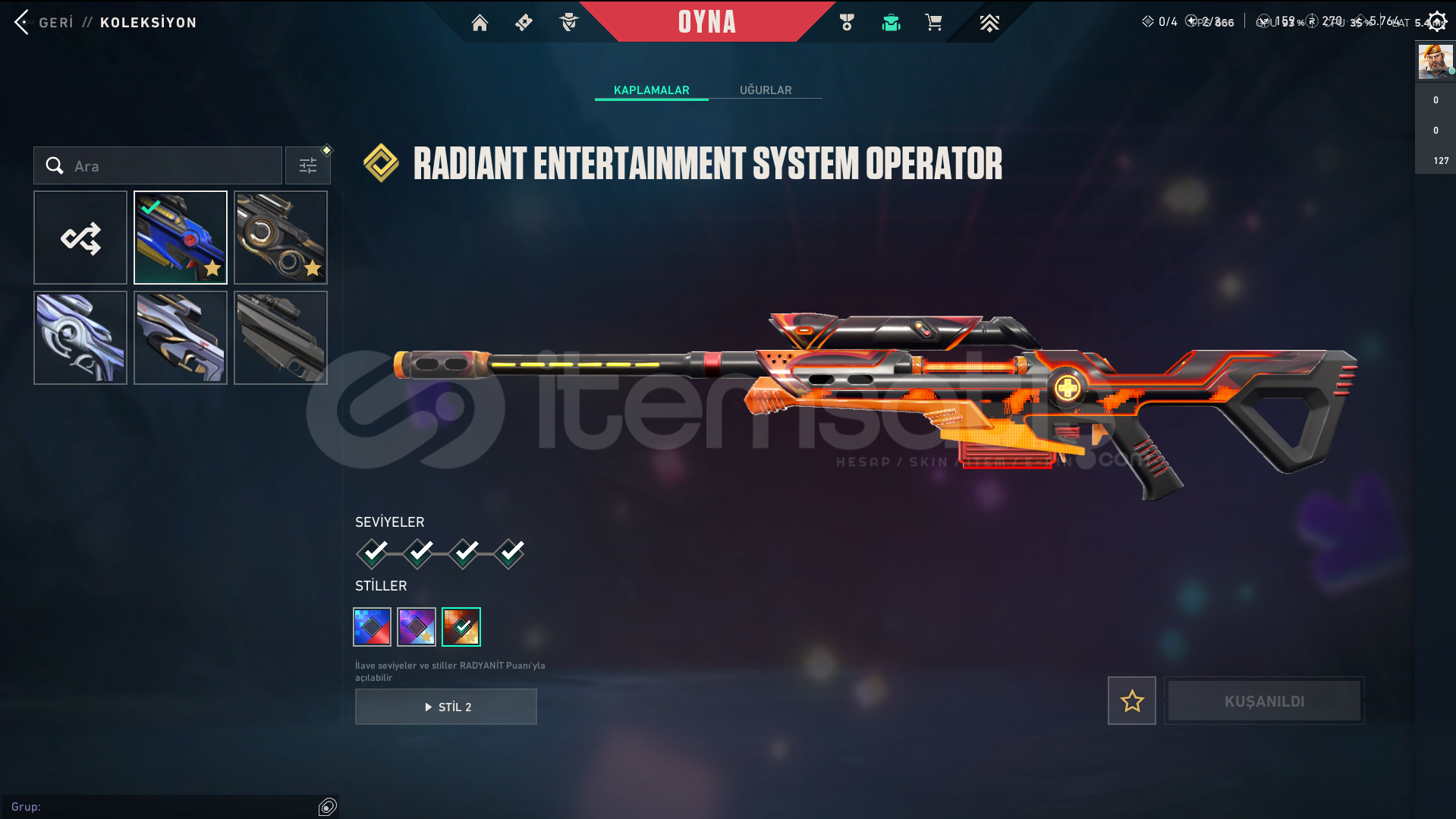 Skinler: Sentinels of Light Vandal - Magepunk Vandal - Prime Vandal - Reaver Vandal / Oni Phantom - Radiant Entertainment System Phantom / Radiant Entertainment System Ghost / Radiant Entertainment System Bulldog / Radiant Entertainment System Operator / BlastX Spectre / Forsaken Classic / Gaia's Vengeance Guardian / Origin Operator / Sovereign Marshal / Magepunk Sheriff / Tilde Knife - Power Fist - RGX 11z Pro Blade - Onimaru Kunitsuna - Iridian Thorn Blade - Reaver Karambit - Venturi Knife - Xenohunter Knife - Bound VE DAHA SAYAMADIKLARIM İLE BİRLİKTE TOPLAM 77 SKİN MEVCUTTUR.