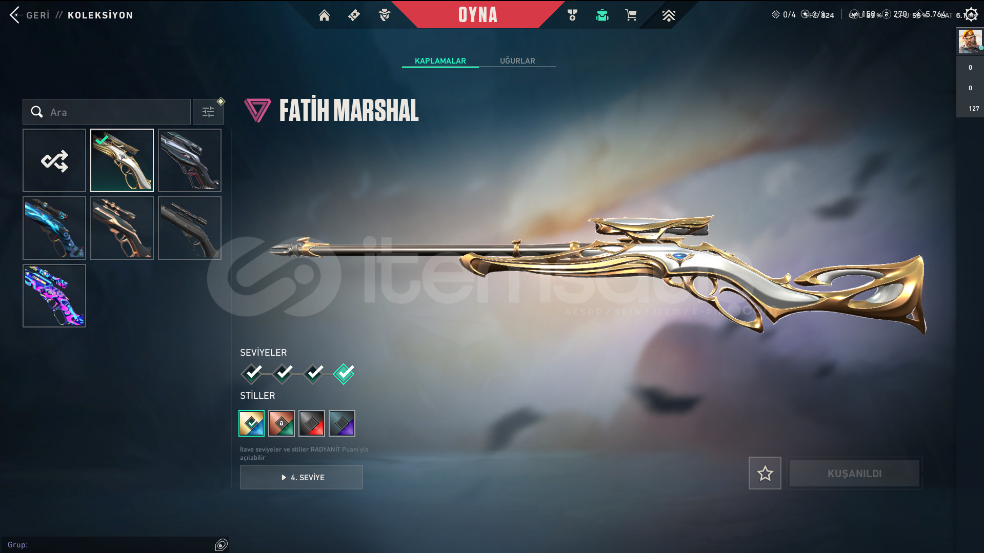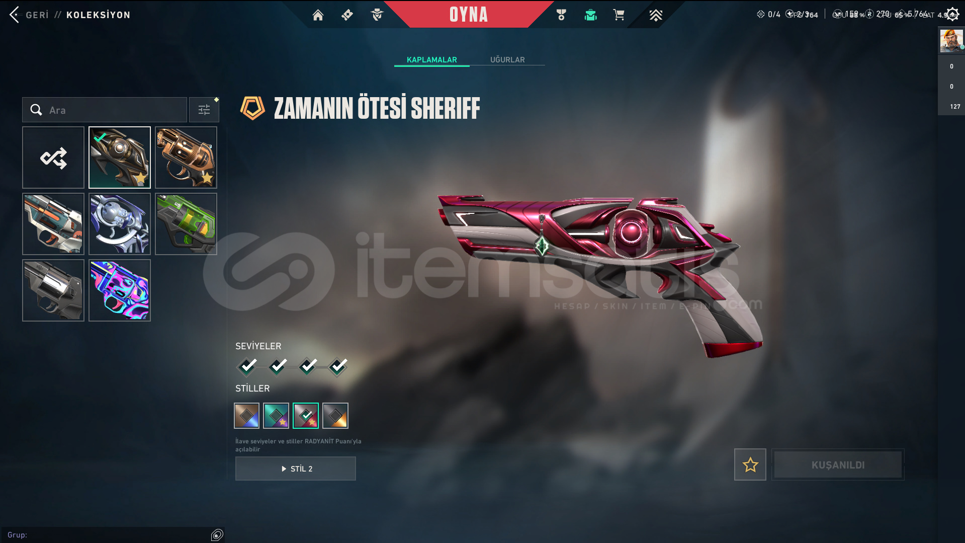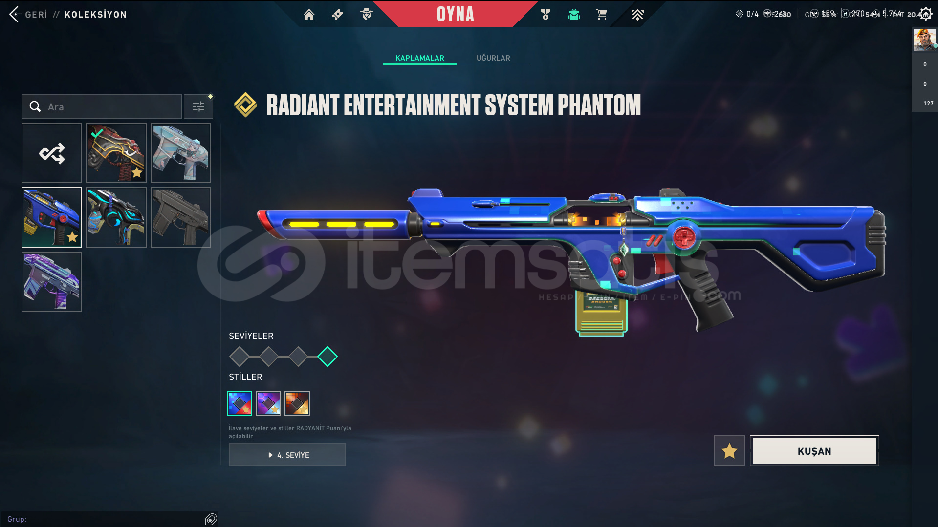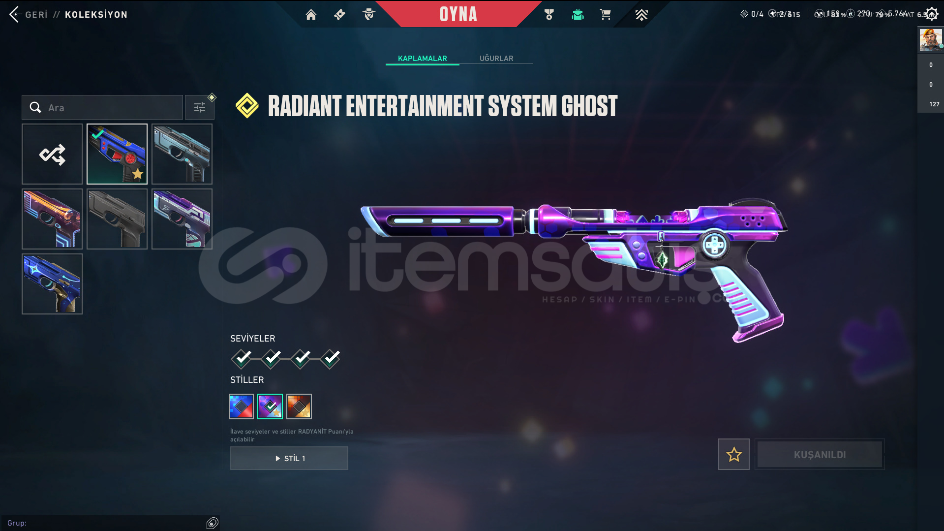 Skinler: Sentinels of Light Vandal - Magepunk Vandal - Prime Vandal - Reaver Vandal / Oni Phantom - Radiant Entertainment System Phantom / Radiant Entertainment System Ghost / Radiant Entertainment System Bulldog / Radiant Entertainment System Operator / BlastX Spectre / Forsaken Classic / Gaia's Vengeance Guardian / Origin Operator / Sovereign Marshal / Magepunk Sheriff / Tilde Knife - Power Fist - RGX 11z Pro Blade - Onimaru Kunitsuna - Iridian Thorn Blade - Reaver Karambit - Venturi Knife - Xenohunter Knife - Bound VE DAHA SAYAMADIKLARIM İLE BİRLİKTE TOPLAM 77 SKİN MEVCUTTUR.
