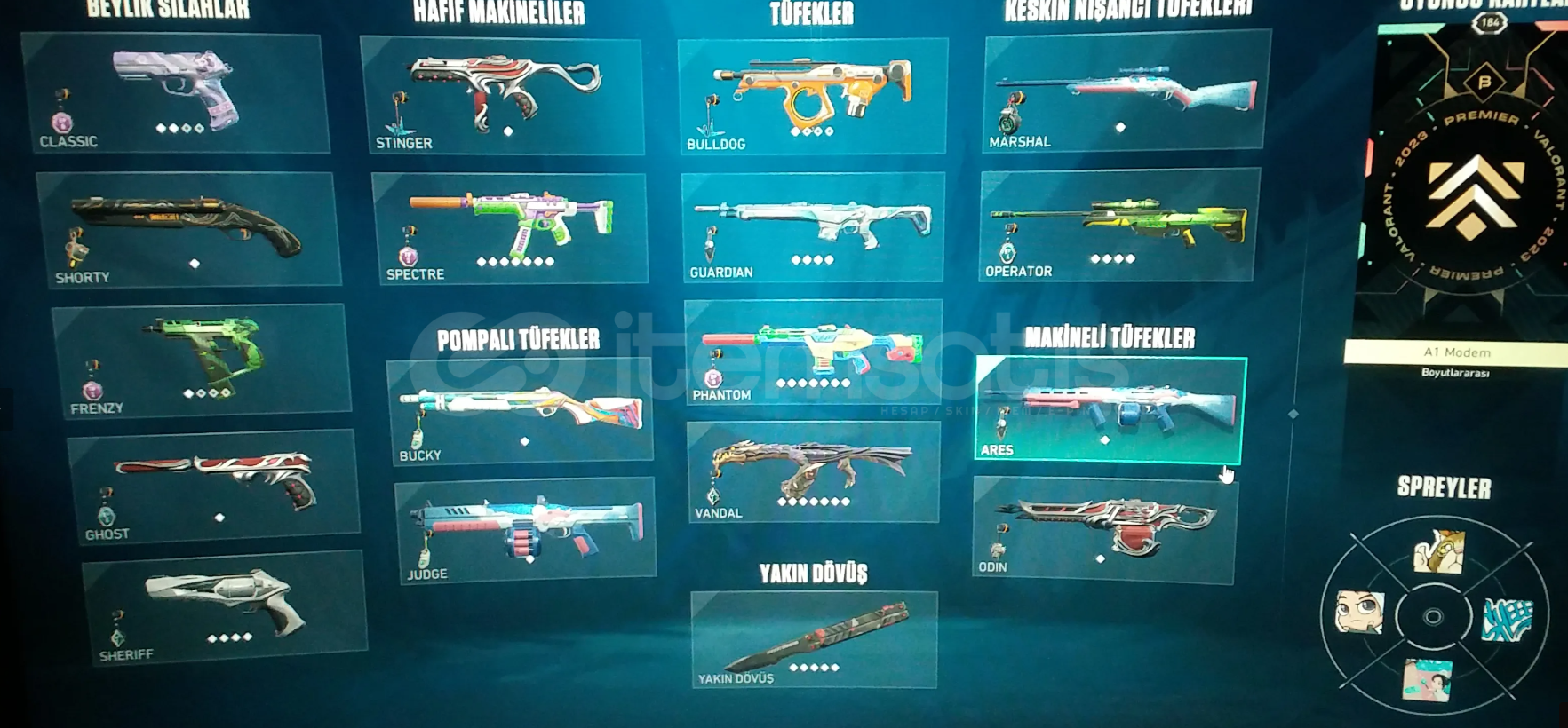 Beylik SilahlarClassic – Prism II ClassicShorty – Ruination ShortyFrenzy – Glitchpop FrenzyGhost – Sovereign GhostSheriff – Ion Sheriff💥 Hafif MakinelilerStinger – Prelude to Chaos StingerSpectre – Glitchpop Spectre🔫 TüfeklerBulldog – Prime BulldogGuardian – Ion GuardianPhantom – BlastX PhantomVandal – Ruination Vandal🎯 Keskin Nişancı TüfekleriMarshal – Sovereign MarshalOperator &n...