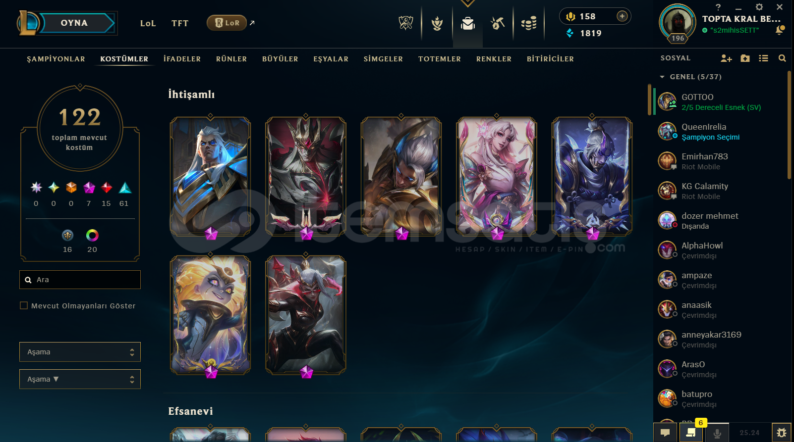 • HESAPTA 122 SKİN BULUNMAKTADIR ÇOĞU DEĞERLİ İHTİŞAMLI EFSANEVİ DESTANSI VE HATIRA KOSTÜMLERİ BULUNMAKTADIR