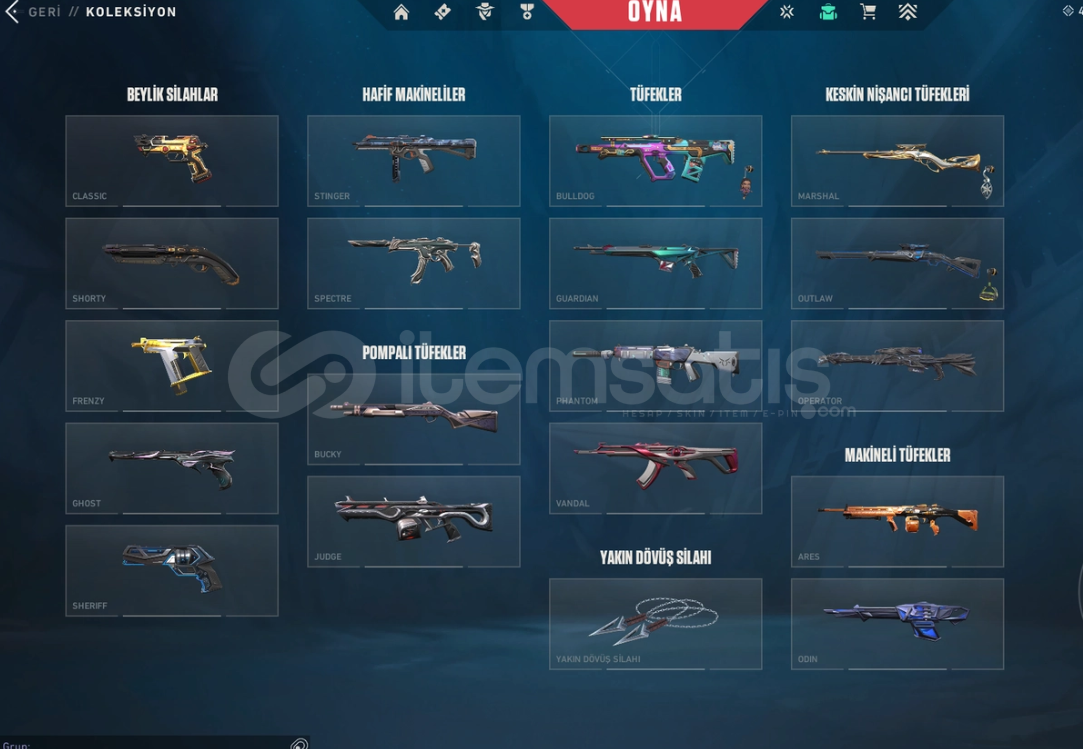 Classic: Asil/DelipopShorty: KaosFrenzy: AsilGhost: FatihSheriff: RGX/ YağmacıStınger: KaosSpectre: YitikBulldog: DelipopGuardian: AsilPhantom: Asilv2/ Delipop/Seri tetikVandal: Faz koruyucu /Asil /Evori rüyakantlar /Felaketin kalbi /İyon /Kaosun başlangıcı /Onı /Zamanın ötesiMarshal: FatihOutlaw: RGXOperatör: Ejder ateşi /Evrim Operatör/Yitik OperatörBıçak: Uzaylı avcısı Bıçak/5 Yea...