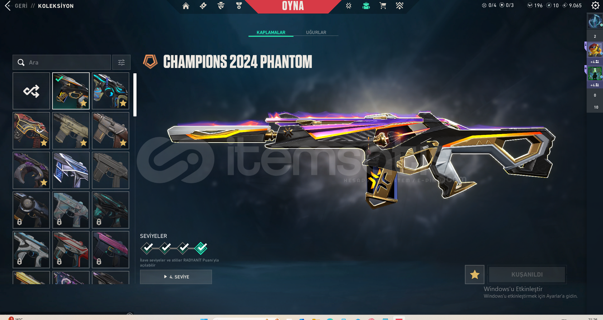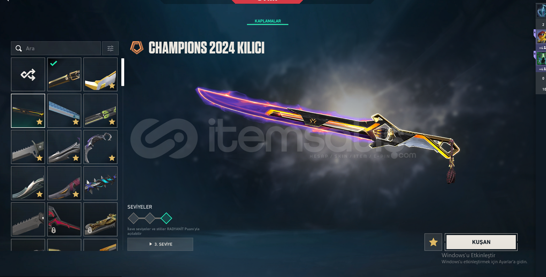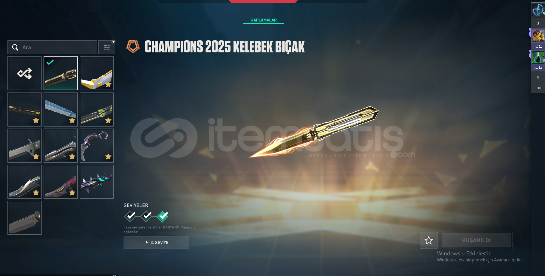 Hesapta Champions 2024-2025 koleksiyonu bulunur Kelebek ve kılıcı ile bulunur vandal yok fakat phantom hesapta mevcuttur.