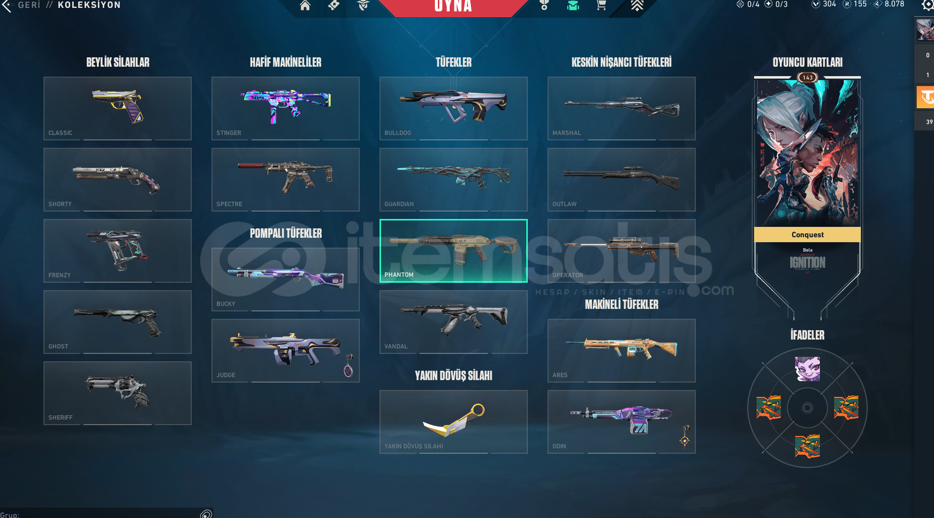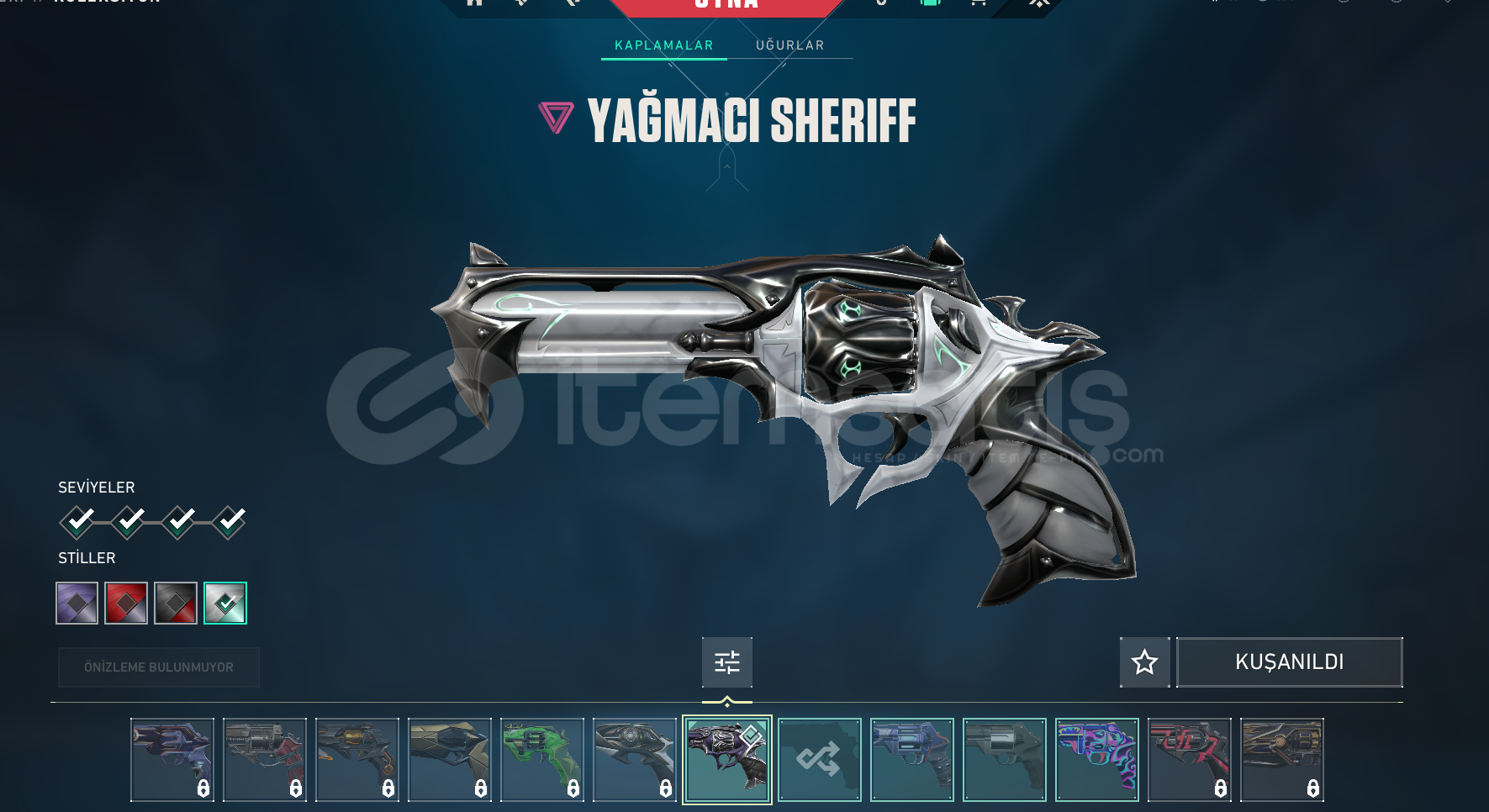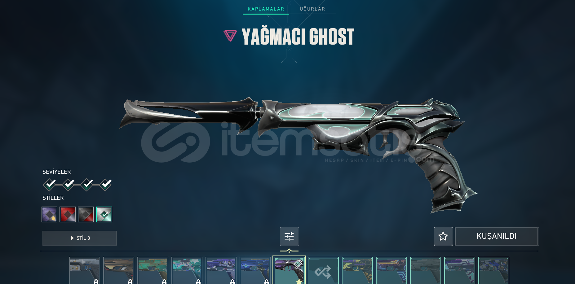 BU HESABIN İÇİNDE HER ŞEY VAR ! ASİL KARAMBİT ASİL CLASSİCPRİZME III CLASSİCYAĞMACI GHOSTYAĞMACI SHERİFF VİRAN SPECTREGAİA GUARDİANASİL PHANTOMÖZEL HAREKAT PHANTOMİYON PHANTOMYAĞMACI VANDALONİ VANDALSİHİRPUNK OPERATÖROUTLAW HARİC HER SKİNDE BATTLEPASS SKİNİ ! EKSTRA 304 VP ! HER AJAN AÇIK ! TONLARCA SPREY KART VE ÜNVAN ! %100 GÜVENİL&...