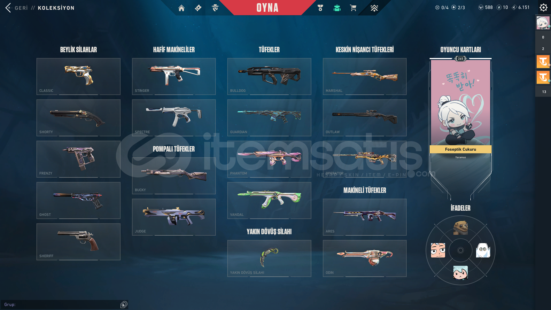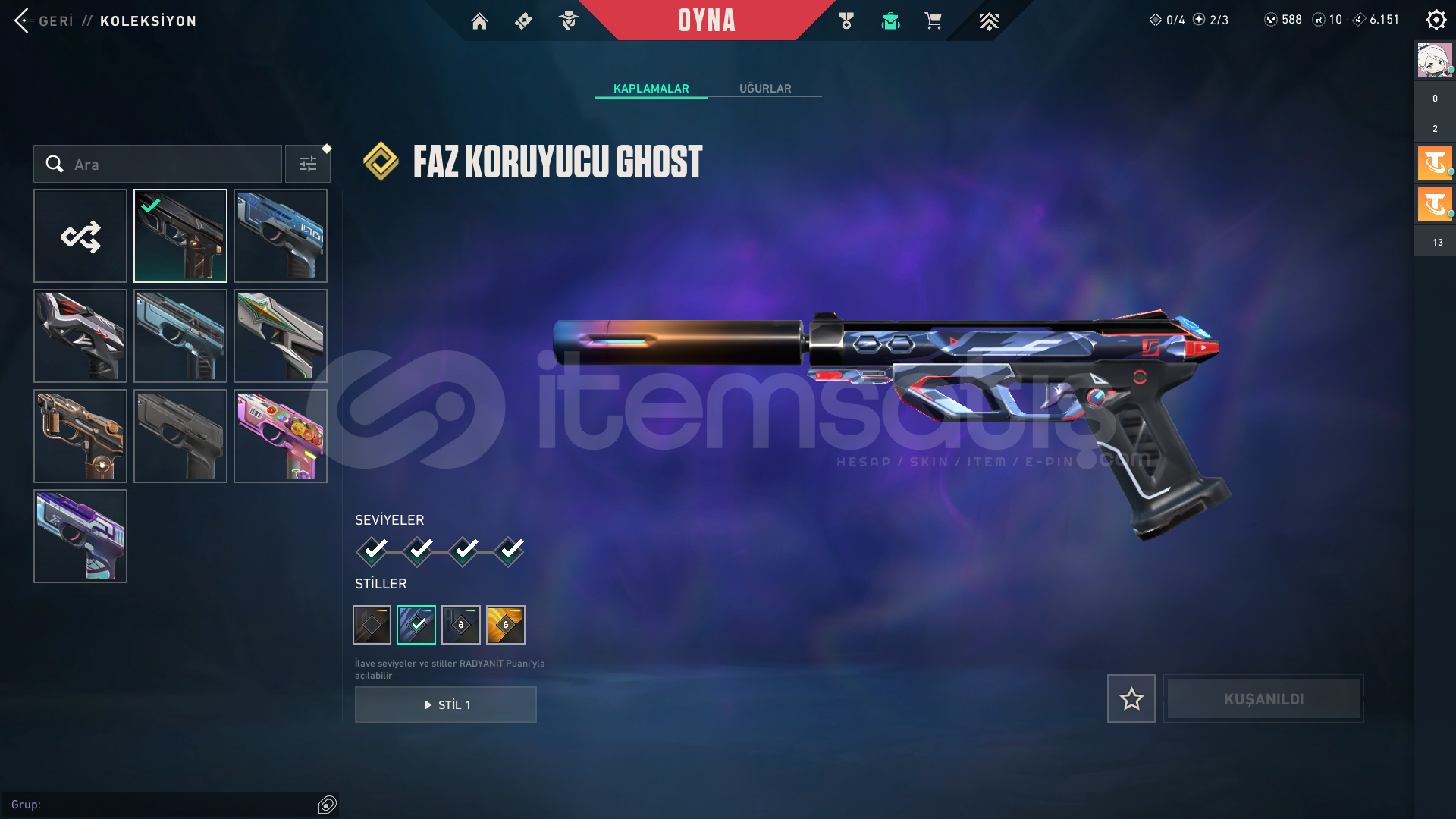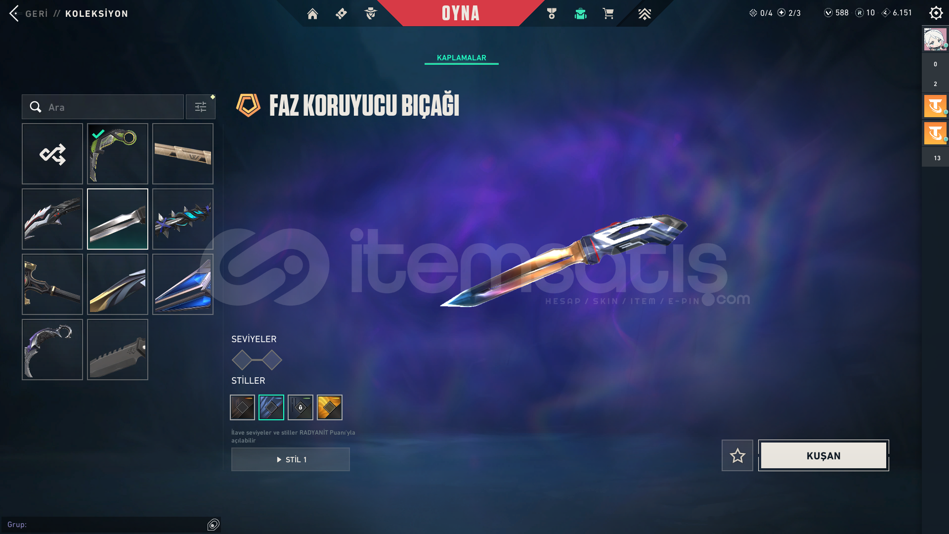 3 Bıçak var. RGX Karambit, Yağmacı Karambit,Faz Koruyucu Bıçak ve birçok battlepass bıçağı. Hesabın peak rankı Dia3 99kpdir. Şuanki Rankı Gold1. Elo Hellde değil rahat çıkılabilir. Faz Koruyucu seti komple alınmıştır. Faz koruyucunun tamamı mevcut.