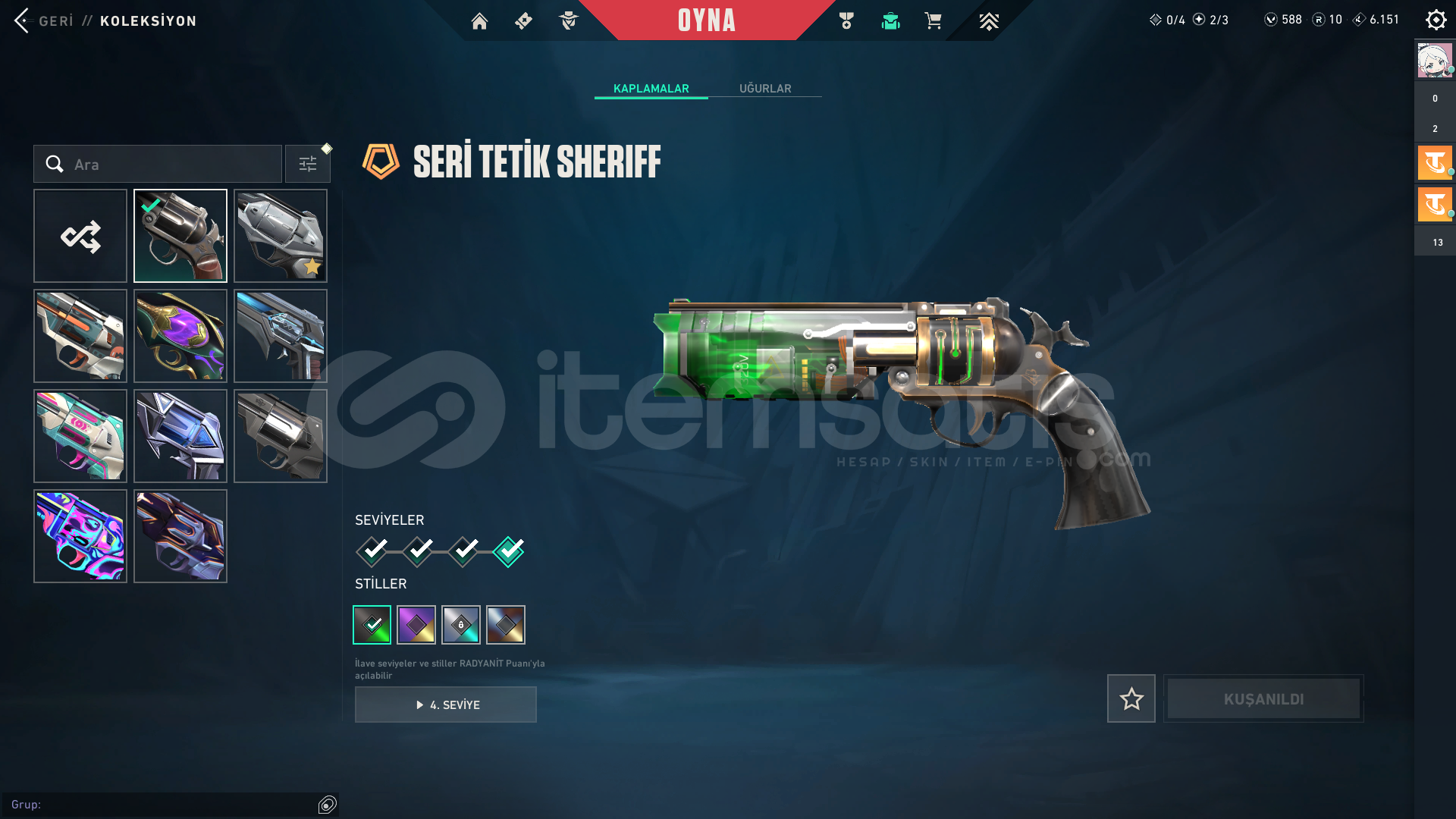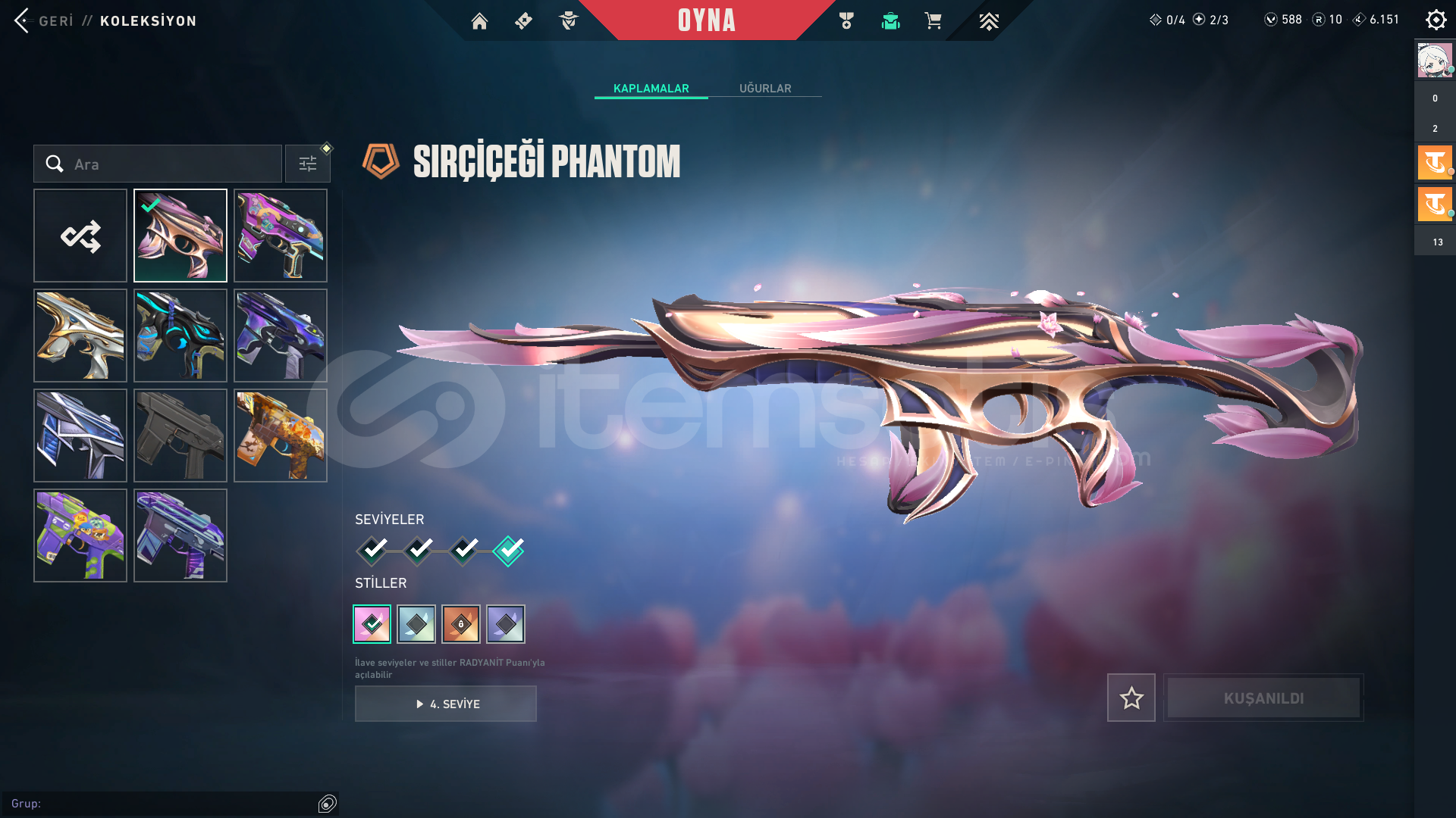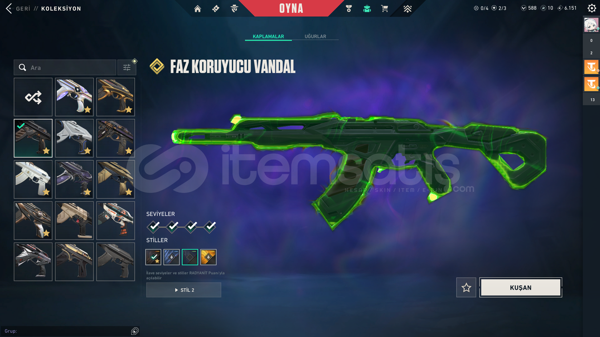3 Bıçak var. RGX Karambit, Yağmacı Karambit,Faz Koruyucu Bıçak ve birçok battlepass bıçağı. Hesabın peak rankı Dia3 99kpdir. Şuanki Rankı Gold1. Elo Hellde değil rahat çıkılabilir. Faz Koruyucu seti komple alınmıştır. Faz koruyucunun tamamı mevcut.