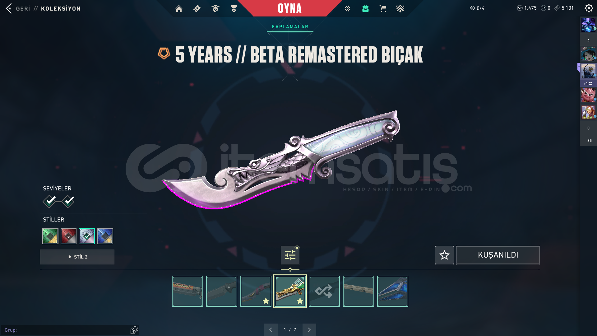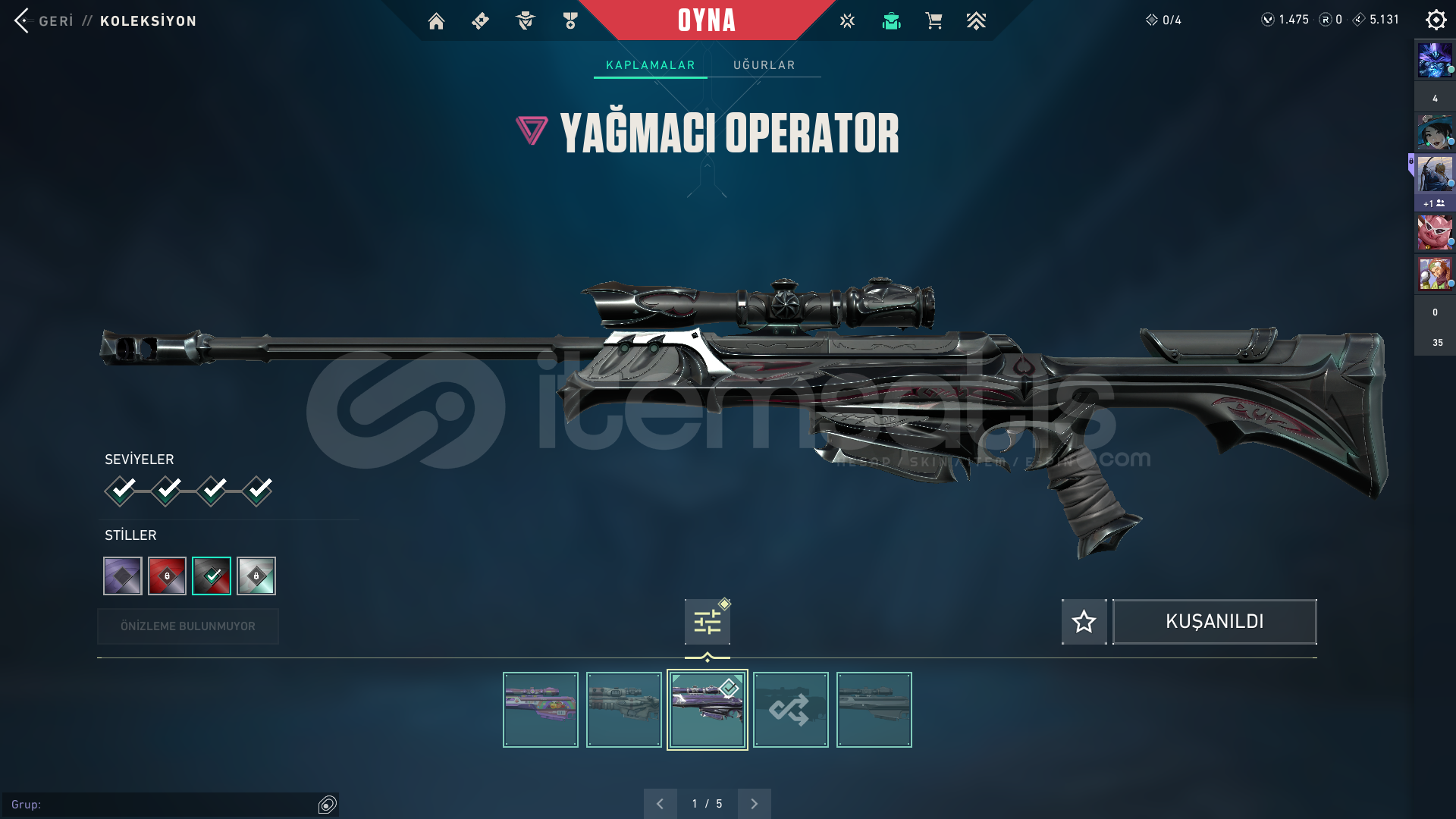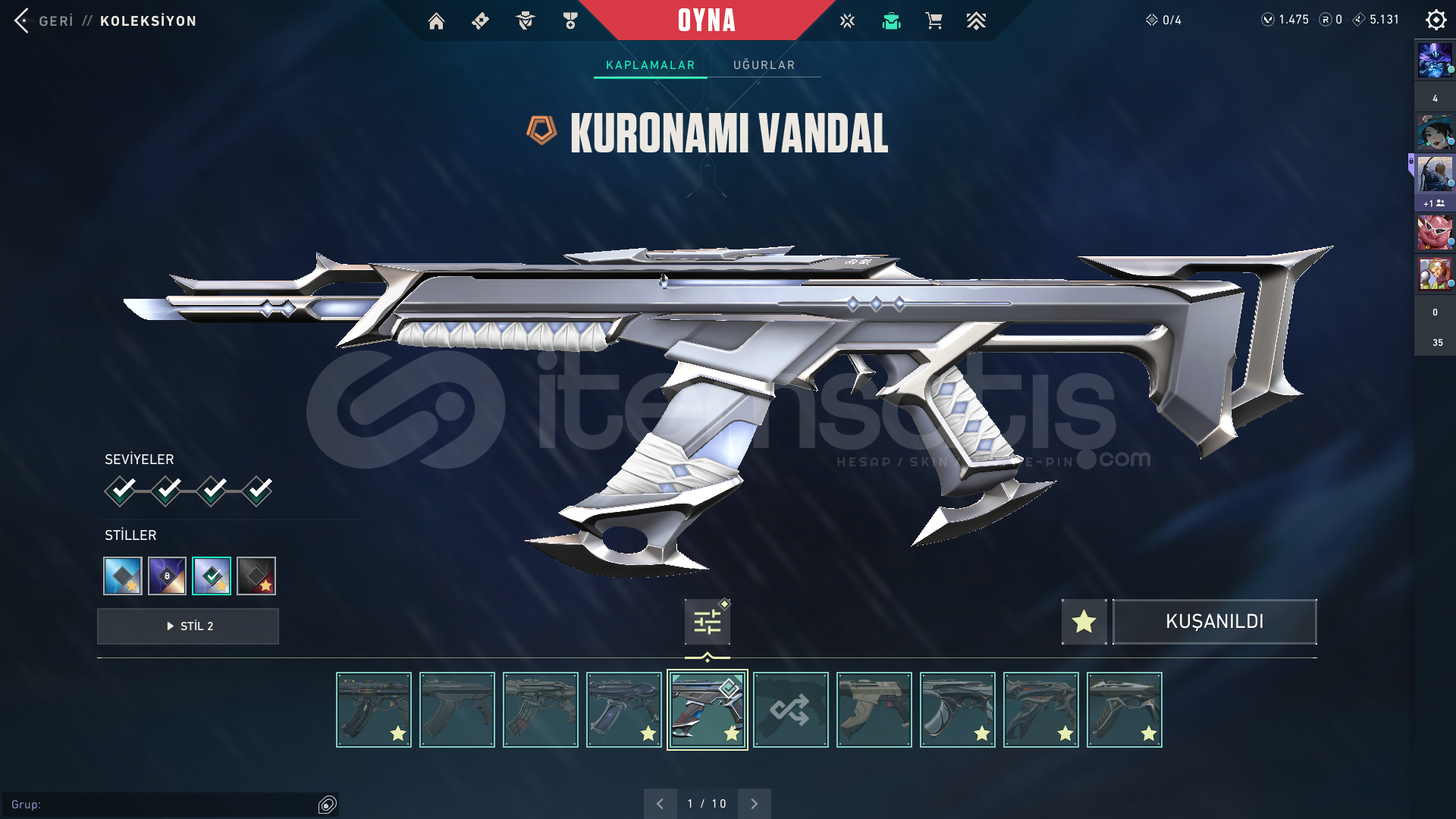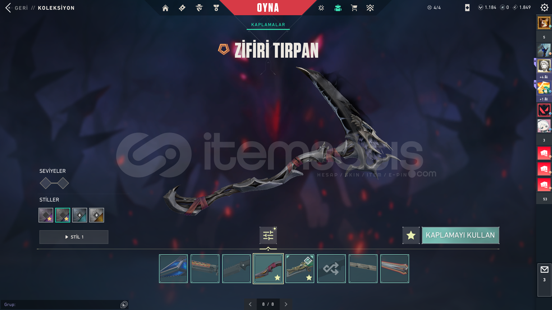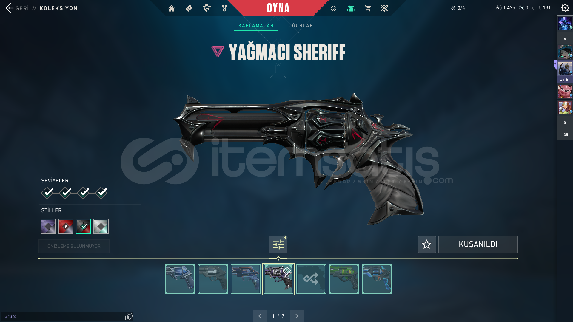 Işık muhafızları vandalEvrim vandalYağmacı vandalAsil vandalFelaketin kalbiKaos vandal Kuronomi vandalChampions 2025 vandal...Champions 2024 phantomZifiri phantom...Yağmacı guardian...Zifiri bulldog...Gaia bucky...Helezon spectra...Zifiri marshal...Yağmacı operatör...Yıkım elçisi odin...Yağmacı şheriff ...Ulupençe ghost...Fatih frenzy...Zifiri classic...5 yers beta remastered bıçak...