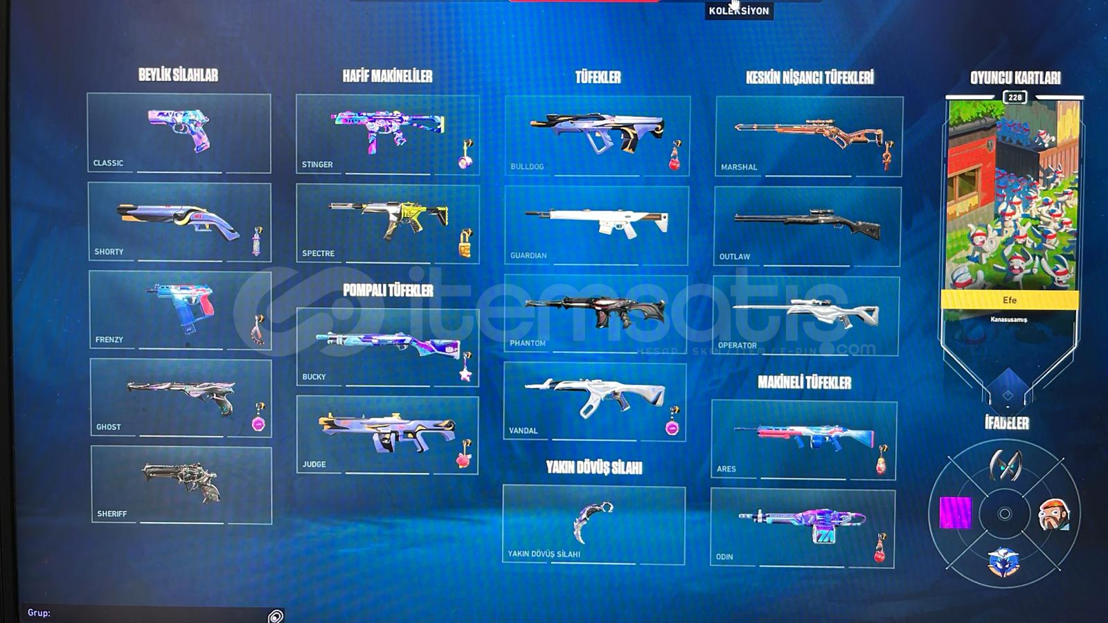 hesap doludur çoğu silahlarda skinler vardır + battle pass skinleri 4 bıçak 12 özel skin 30 pass skini vardır hesap 228 lvdir