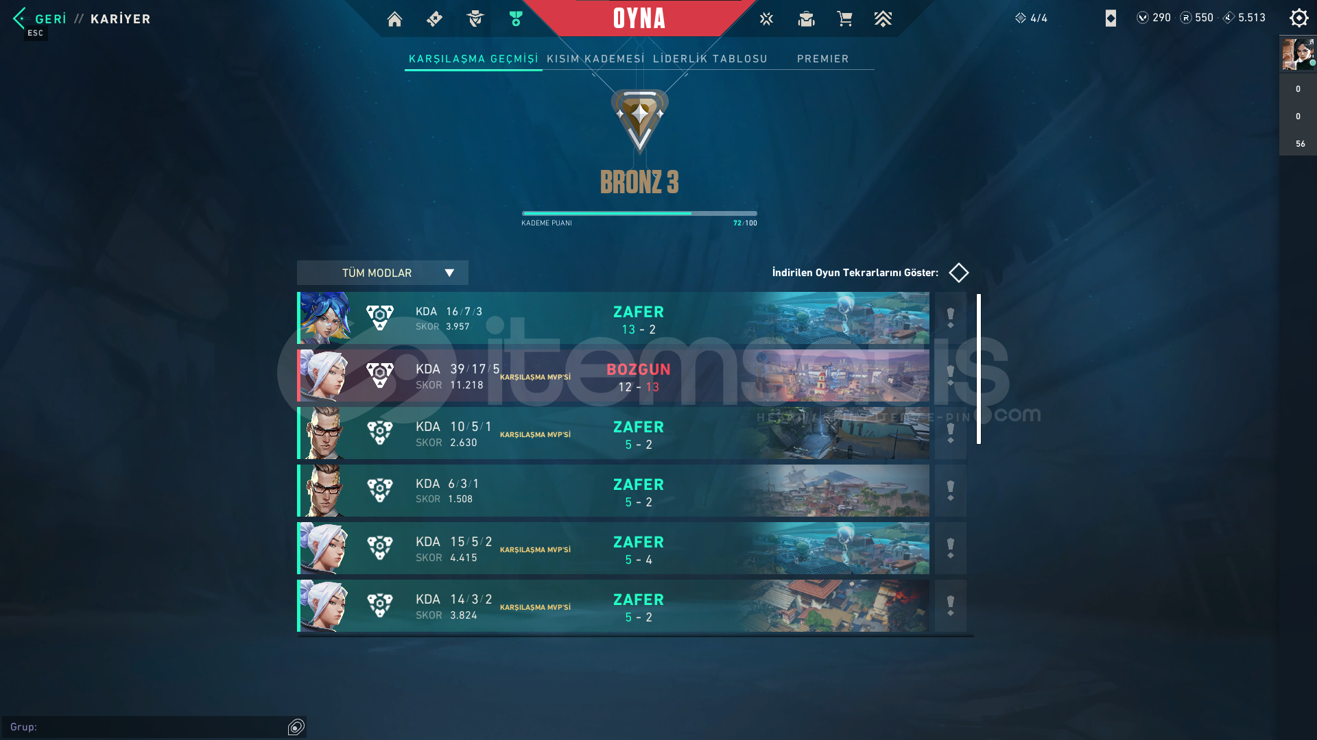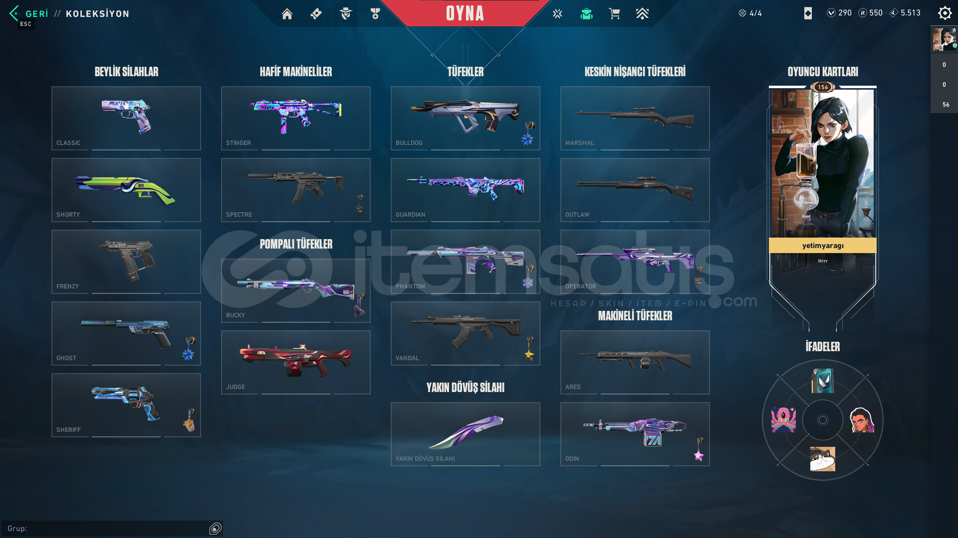 ⚙️ Hesap Bilgileri:Hesap Seviyesi: 156Radianite Points (RP): 550Sunucu: EU (Avrupa)Hesap tamamen aktif, sorunsuz.🔫 Silah Koleksiyonu:Phantom: Mor temalı özel skinGuardian: Efektli mor-mavi skinOperator: Aynı setten mor temalı skinVandal: Klasik siyah model (skin uygulanmamış)Judge: Kırmızı özel skinClassic, Shorty, Sheriff, Ghost: Renkli skin setleriYakın Dövüş Silahı: Mor-beyaz efektli özel b...