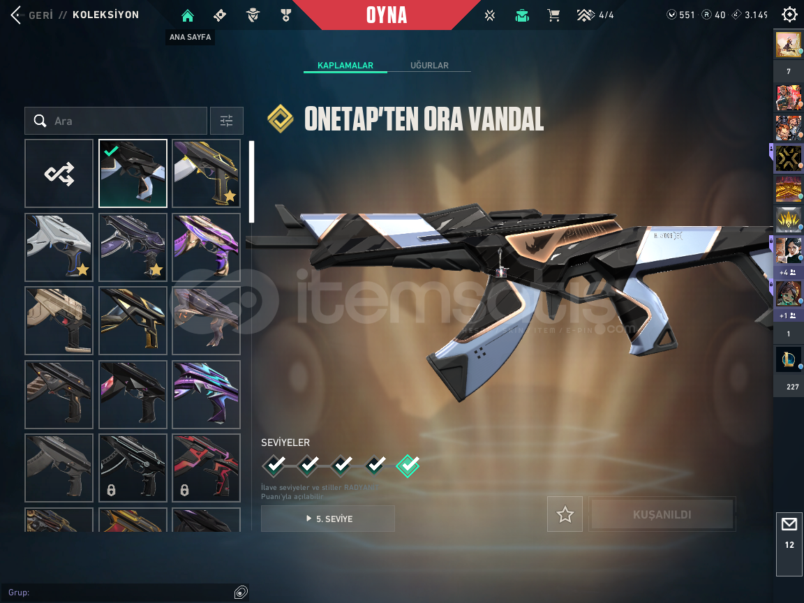 Hesapta delipop bulldog spectrum guardian asil vandal yagmacı vandal faz koruyucu vandal iyon vandal champions vandal ejder vandal one tapden ora vandal operator iyon spectre sırçiçeği ares yağmacı bıçak semavi yelpaze oni phantom blastx phantom yağmacı sheriff faz korucu ghost ve yerçekimsel uranyum nöröateşleyici classic gibi skinler bulunmaktadır.Tr sunucudur rankı gold 2 dir,HESABIN MAİLİ DEĞİŞMEMEKTEDİR.
