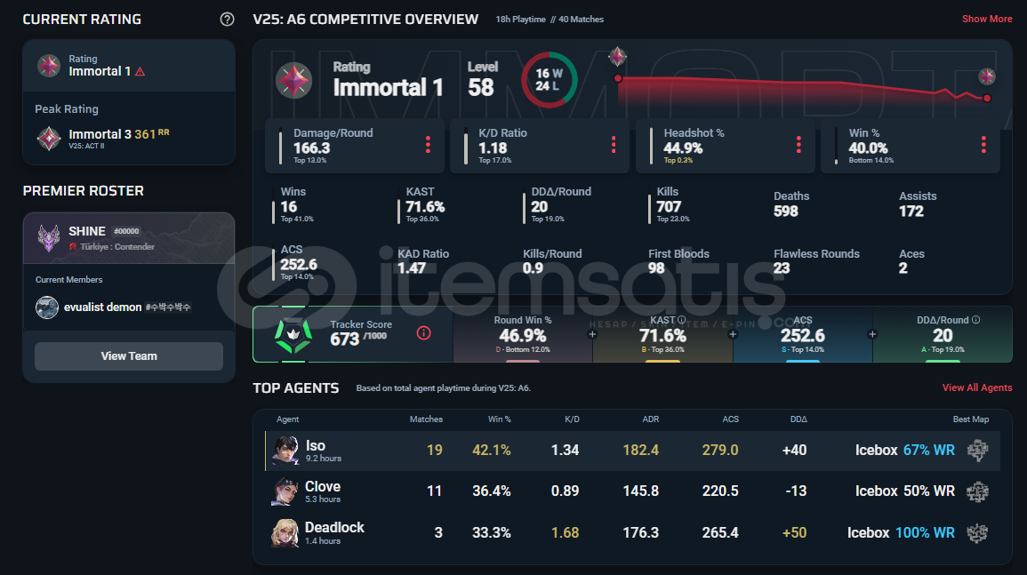 HESAP HAKKINDA BİLGİHesap şuan güncel olarak immortal 1'dir. - v25 immo uğurluğu vardır.Bu bölüm (act) bittikten sonra immortal uğurluğu gelecektir.Uğurluk isteyenler mainlemek için alabilir.Pazarlık mevcuttur fiyat tekliflerinizi yazabilirsiniz orta yolu buluruz :)Hesap peak rankı 361rr peak - ayın 28'inde isim değişme hakkı geliyor.!!ÖNEMLİ!!Mail ile birlikte teslim edilecektir video kayd...