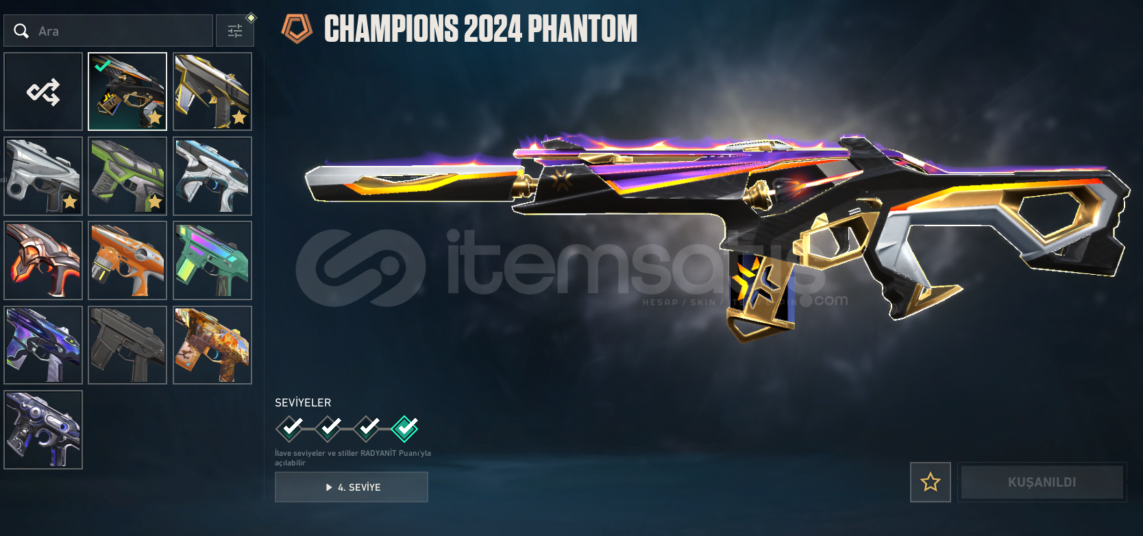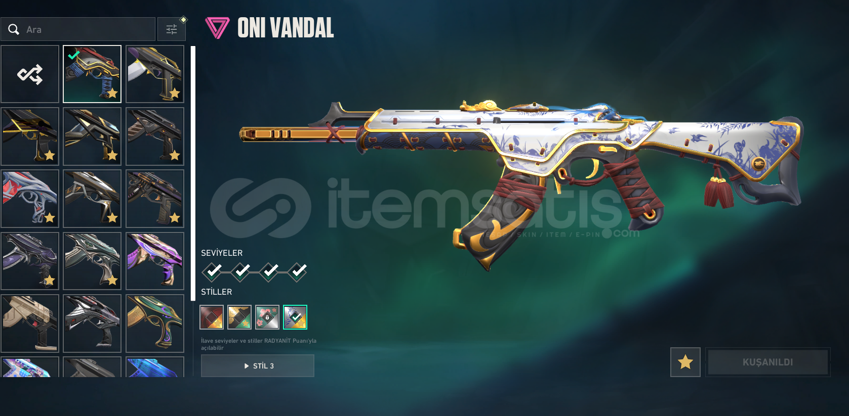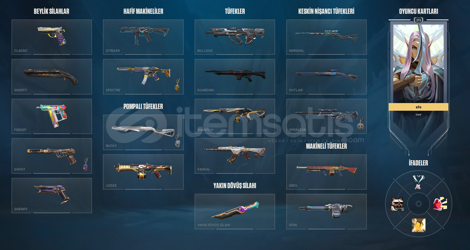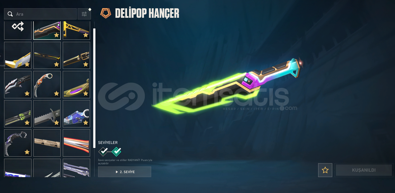 Bıçak:Uzaylı avcısı, Champions 2024 katana, Asil balta, Asil karambit, Yağmacı karambit, Valorant go 1.cilt kunai, RGX kelebek, Champions 2025 kelebek, Delipop Hançer