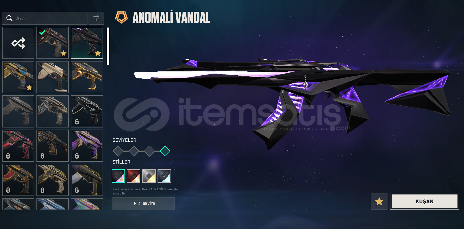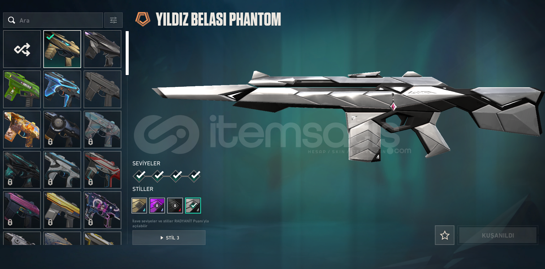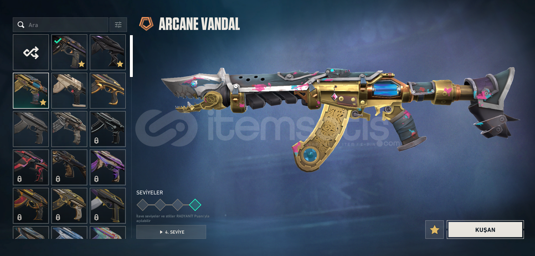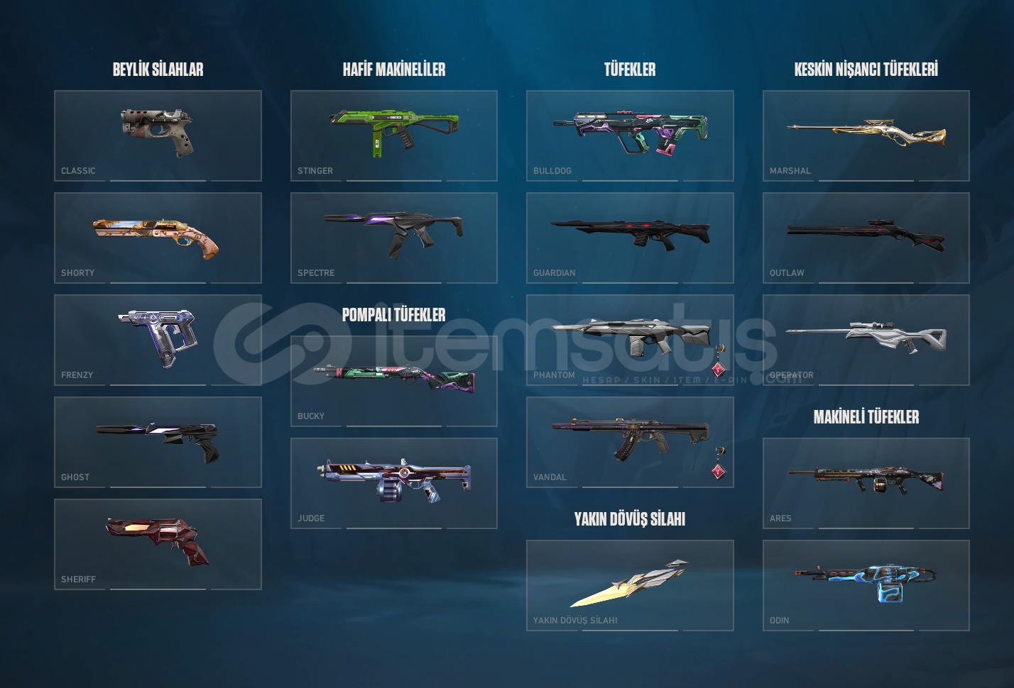 4 VANDAL(KAOS-ANOMALİ-ARCANE-CESUR YÜREK)2 PHANTOM(YILDIZ BELASI-ANOMALİ)2 BIÇAK(YILDIZPARÇALAYAN- ANOMALİ)ANOMALİ GHOSTANOMALİ ŞERİFANOMALİ SPECTREYILDIZ BELASI GUARDİANFATİH MARSHALYILDIZ BELASI OUTLAWİYON OPERATÖRVE BİRÇOK BATTLEPASS SKİNİ