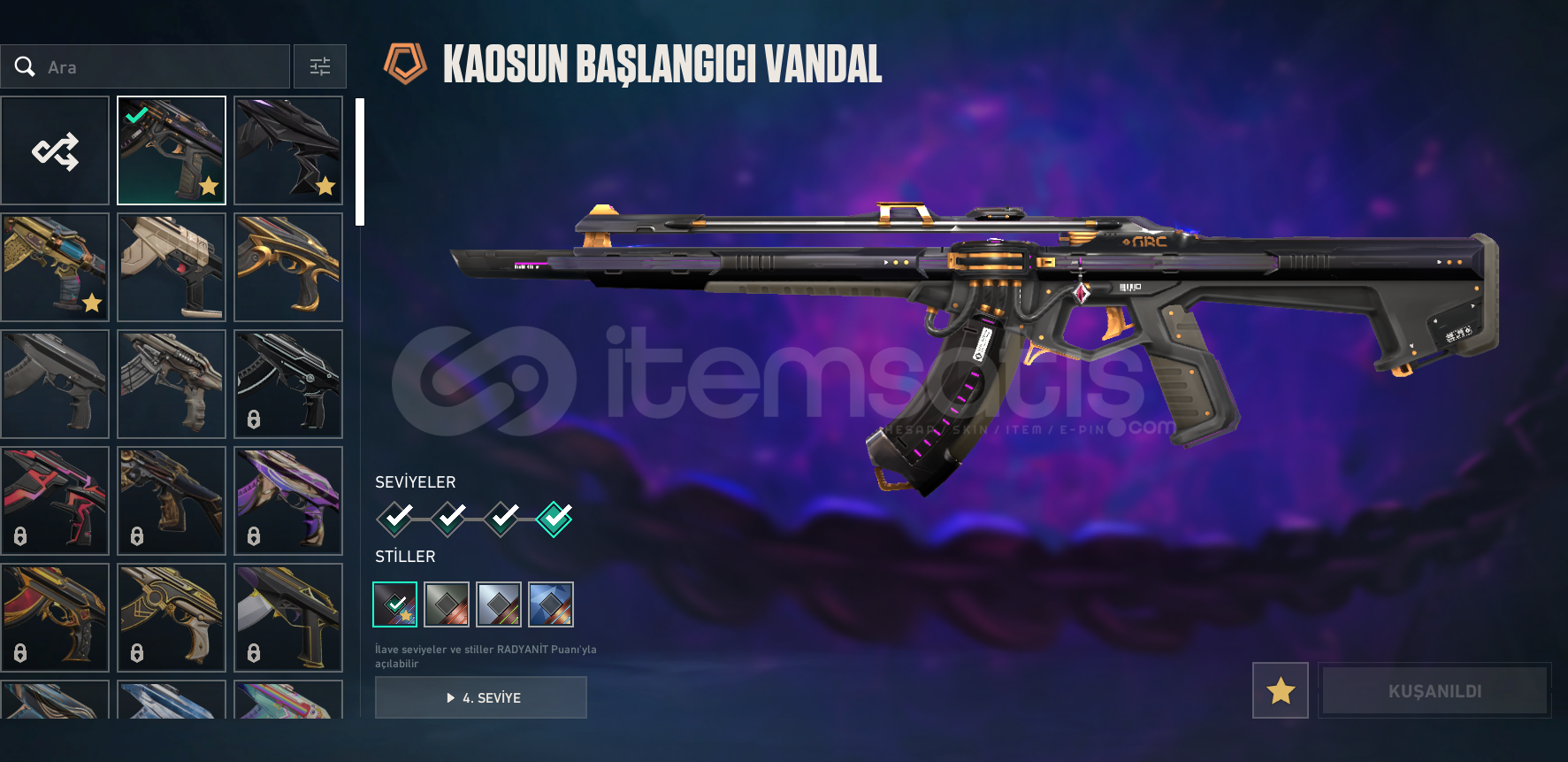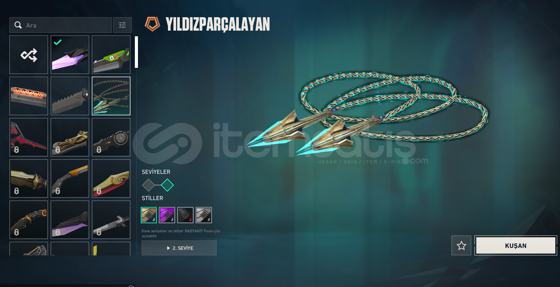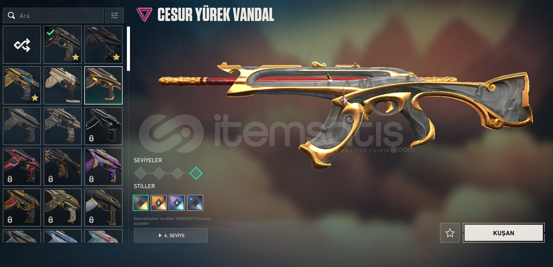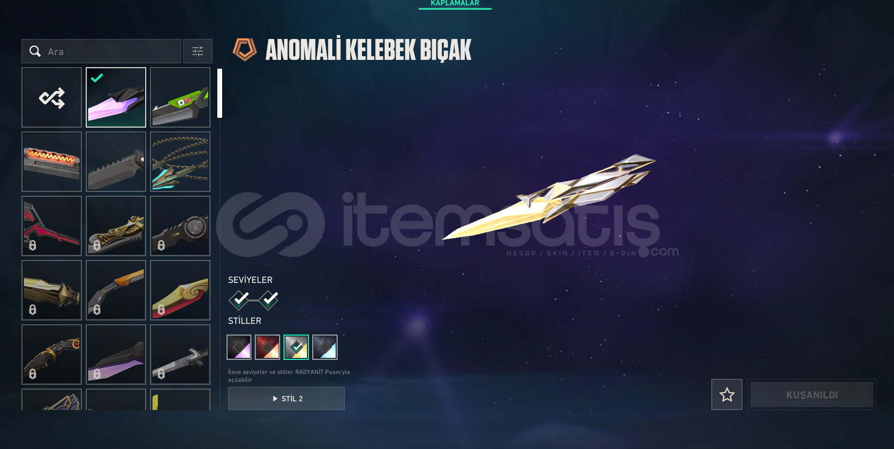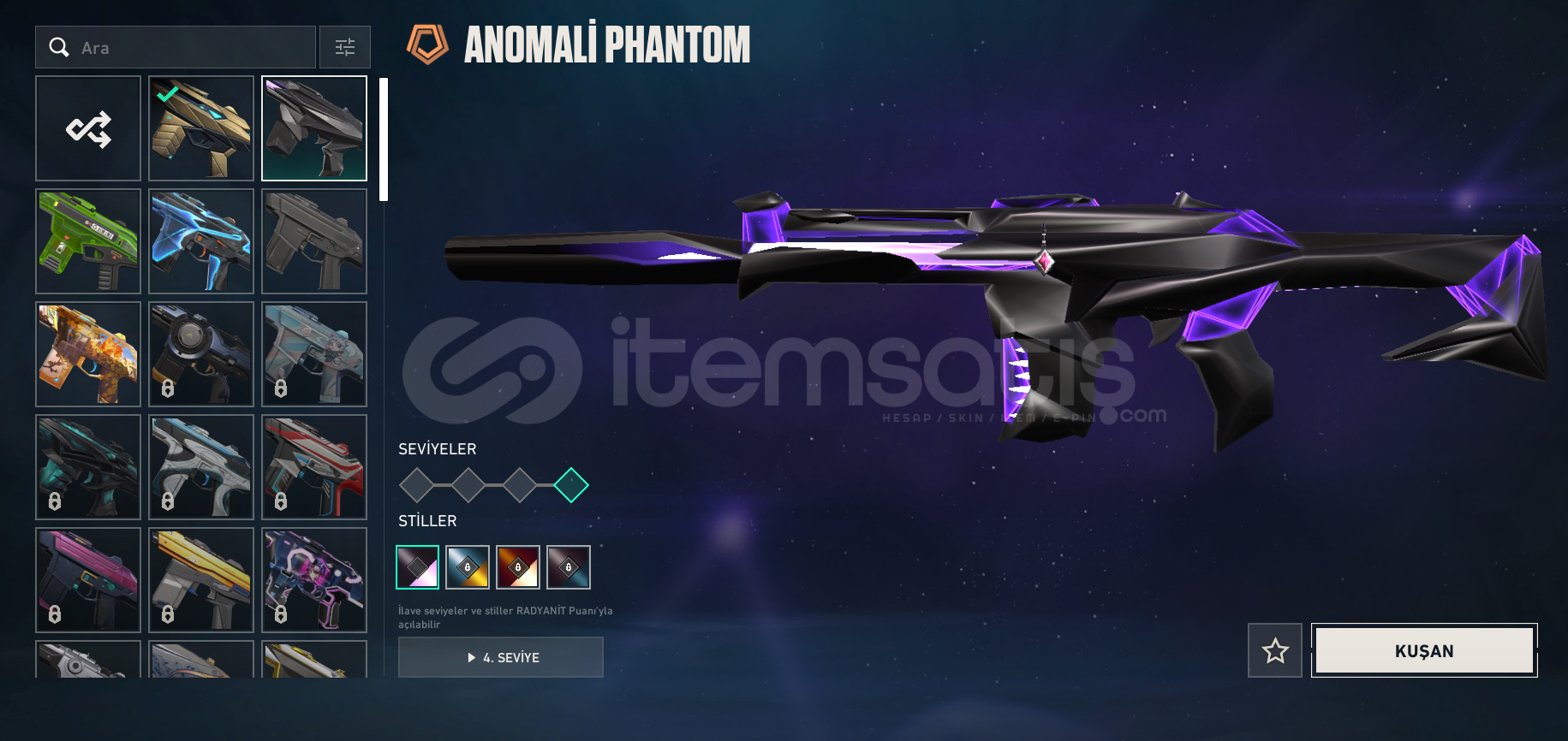 4 VANDAL(KAOS-ANOMALİ-ARCANE-CESUR YÜREK)2 PHANTOM(YILDIZ BELASI-ANOMALİ)2 BIÇAK(YILDIZPARÇALAYAN- ANOMALİ)ANOMALİ GHOSTANOMALİ ŞERİFANOMALİ SPECTREYILDIZ BELASI GUARDİANFATİH MARSHALYILDIZ BELASI OUTLAWİYON OPERATÖRVE BİRÇOK BATTLEPASS SKİNİ