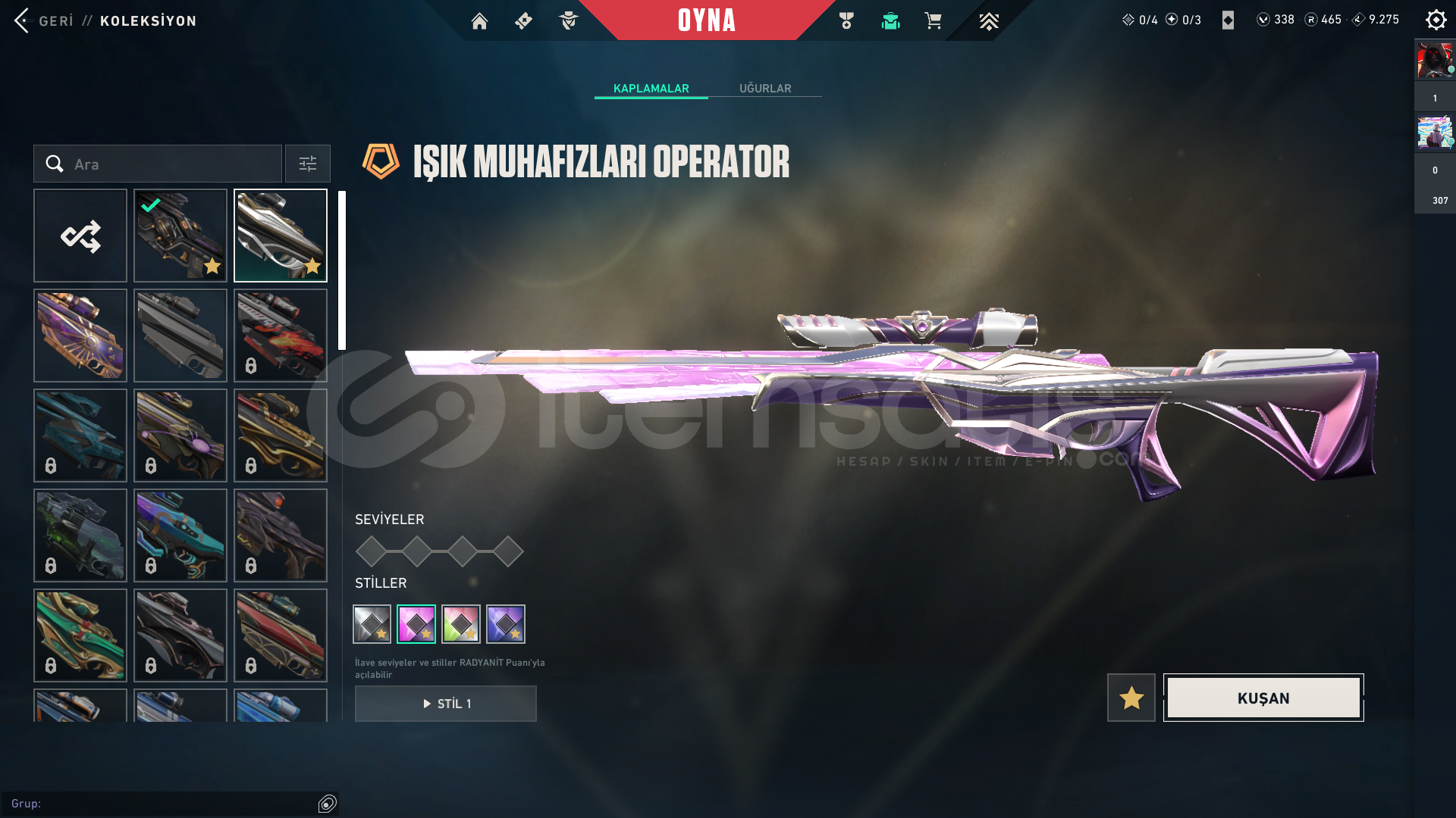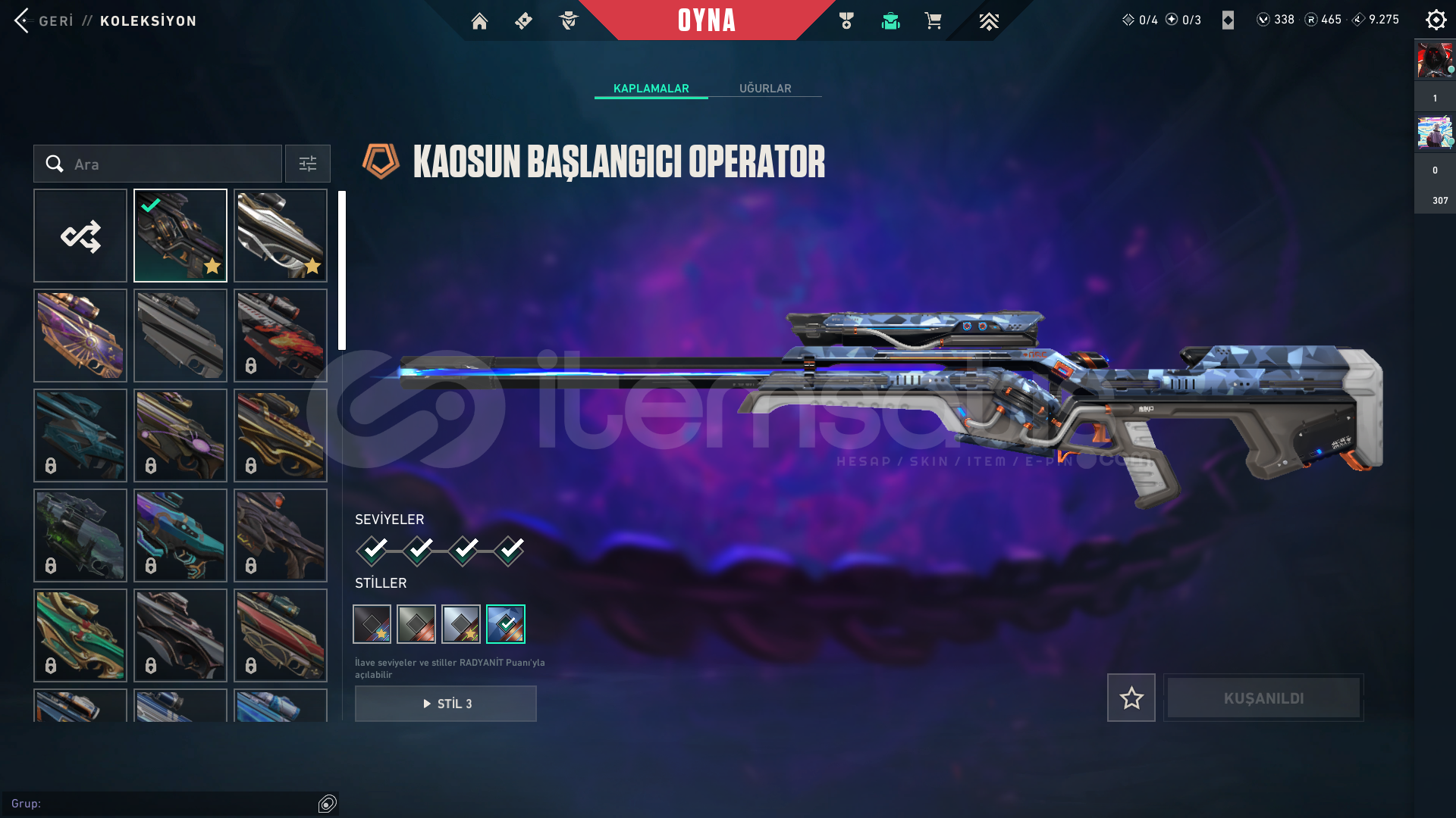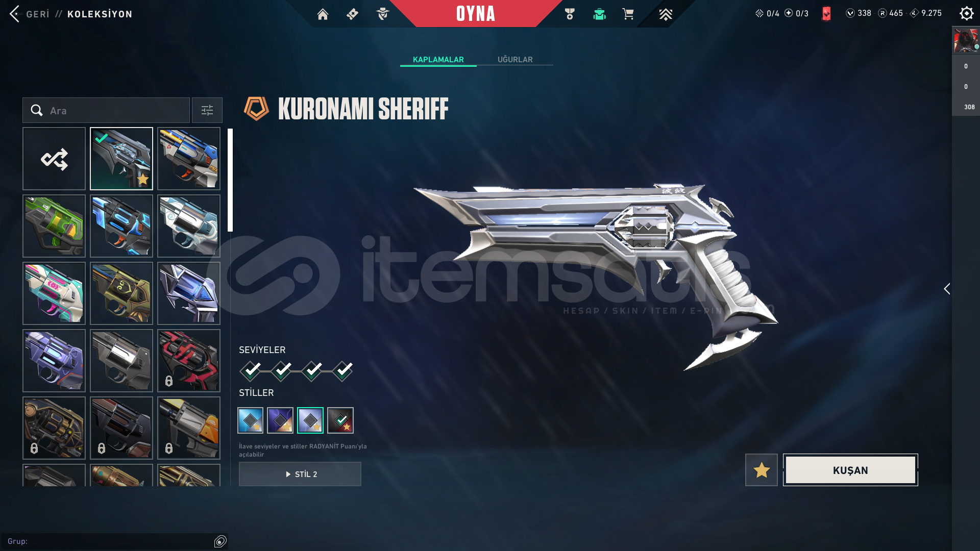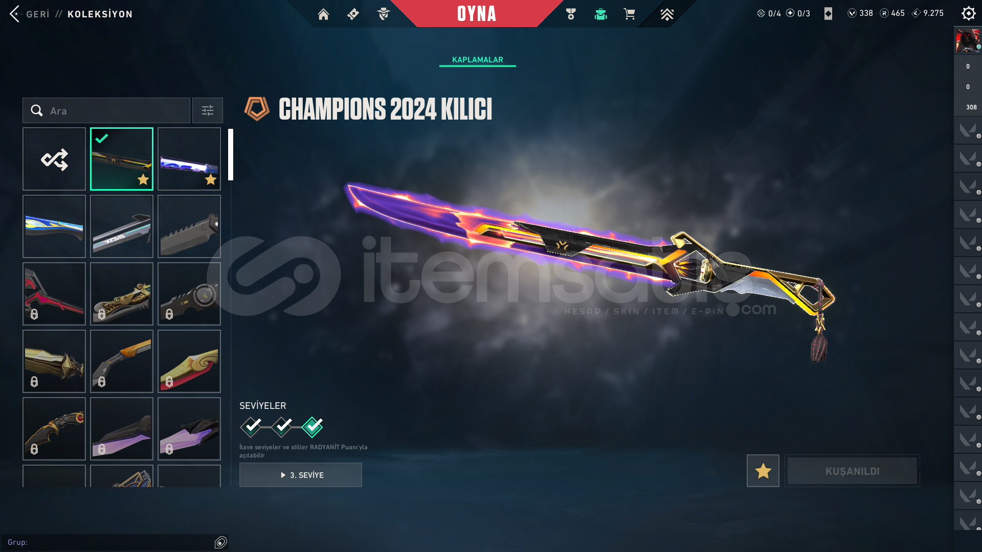 KOLEKSİYONER HESABI! BU HESAP BİR ARŞİV! Aradığınız neredeyse her skin bu hesapta! 343 Seviye, dopdolu bir envanter. Bu fırsat kaçmaz!Hesap Genel Bilgileri ;• Seviye: 343• Rank: Platinum 1• Kingdom Kredisi: 9275• VP: 338• Radyanit: 465• BIÇAKLAR (Toplam 4 Adet!)• Champıons 2024 Kılıcı• Popstar Işık Çubuğu• Düşkıran• Hız Tu...