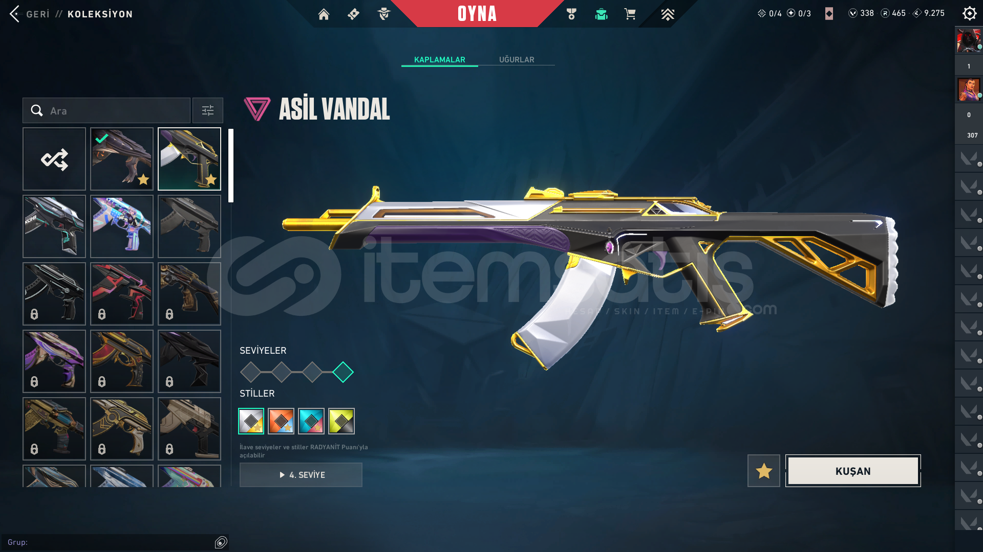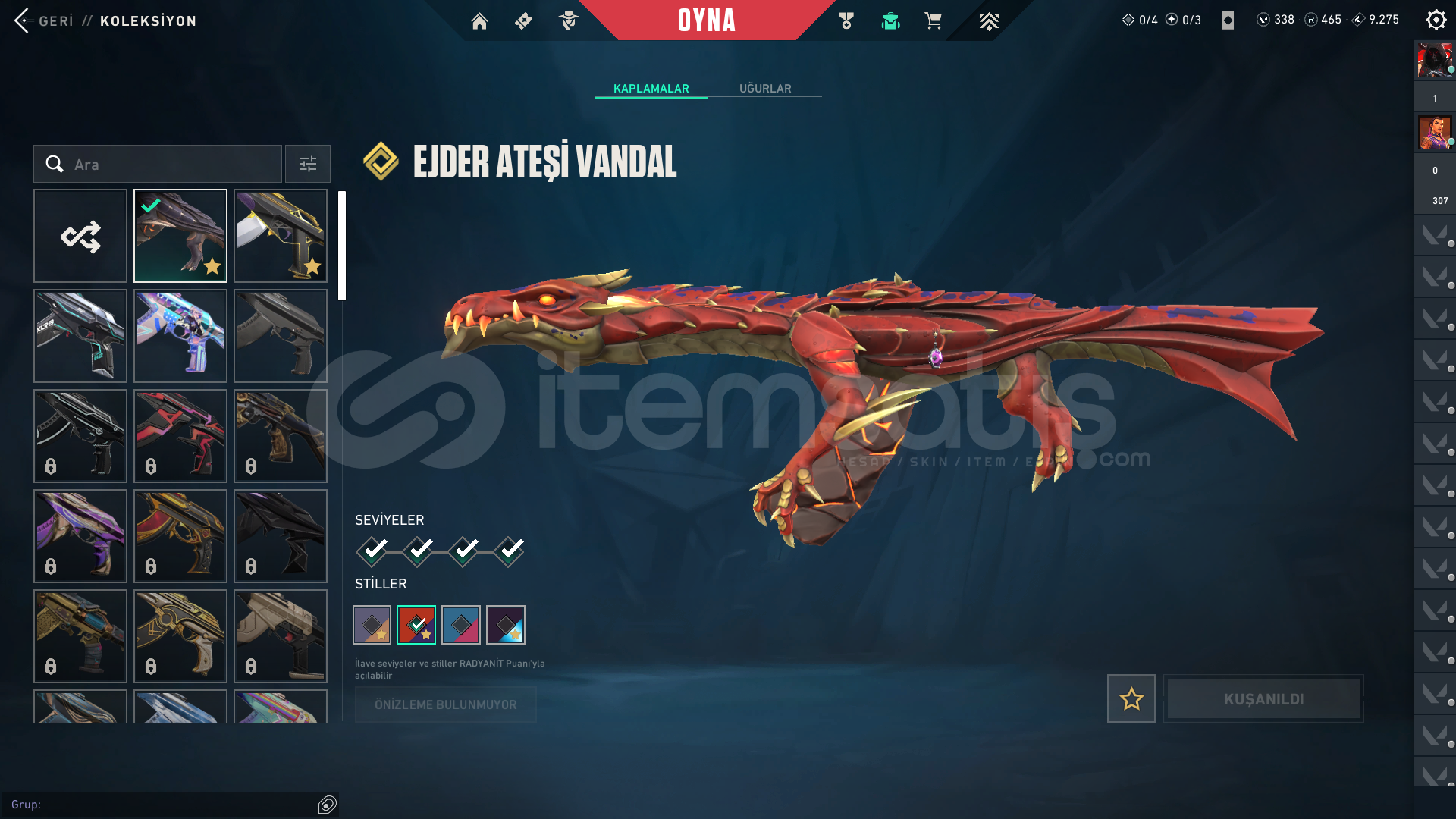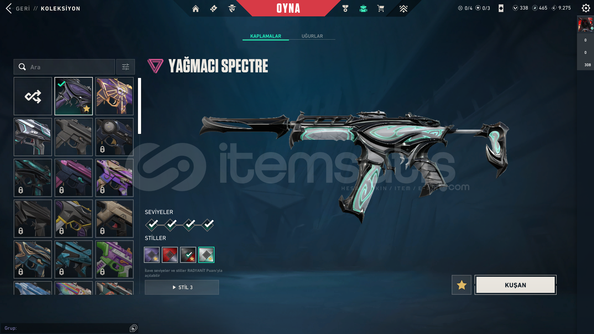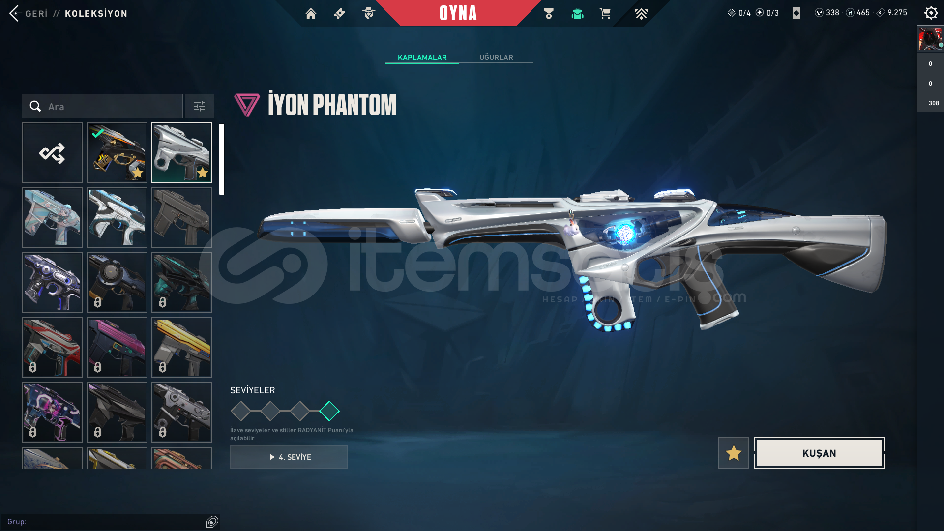 KOLEKSİYONER HESABI! BU HESAP BİR ARŞİV! Aradığınız neredeyse her skin bu hesapta! 343 Seviye, dopdolu bir envanter. Bu fırsat kaçmaz!Hesap Genel Bilgileri ;• Seviye: 343• Rank: Platinum 1• Kingdom Kredisi: 9275• VP: 338• Radyanit: 465• BIÇAKLAR (Toplam 4 Adet!)• Champıons 2024 Kılıcı• Popstar Işık Çubuğu• Düşkıran• Hız Tu...