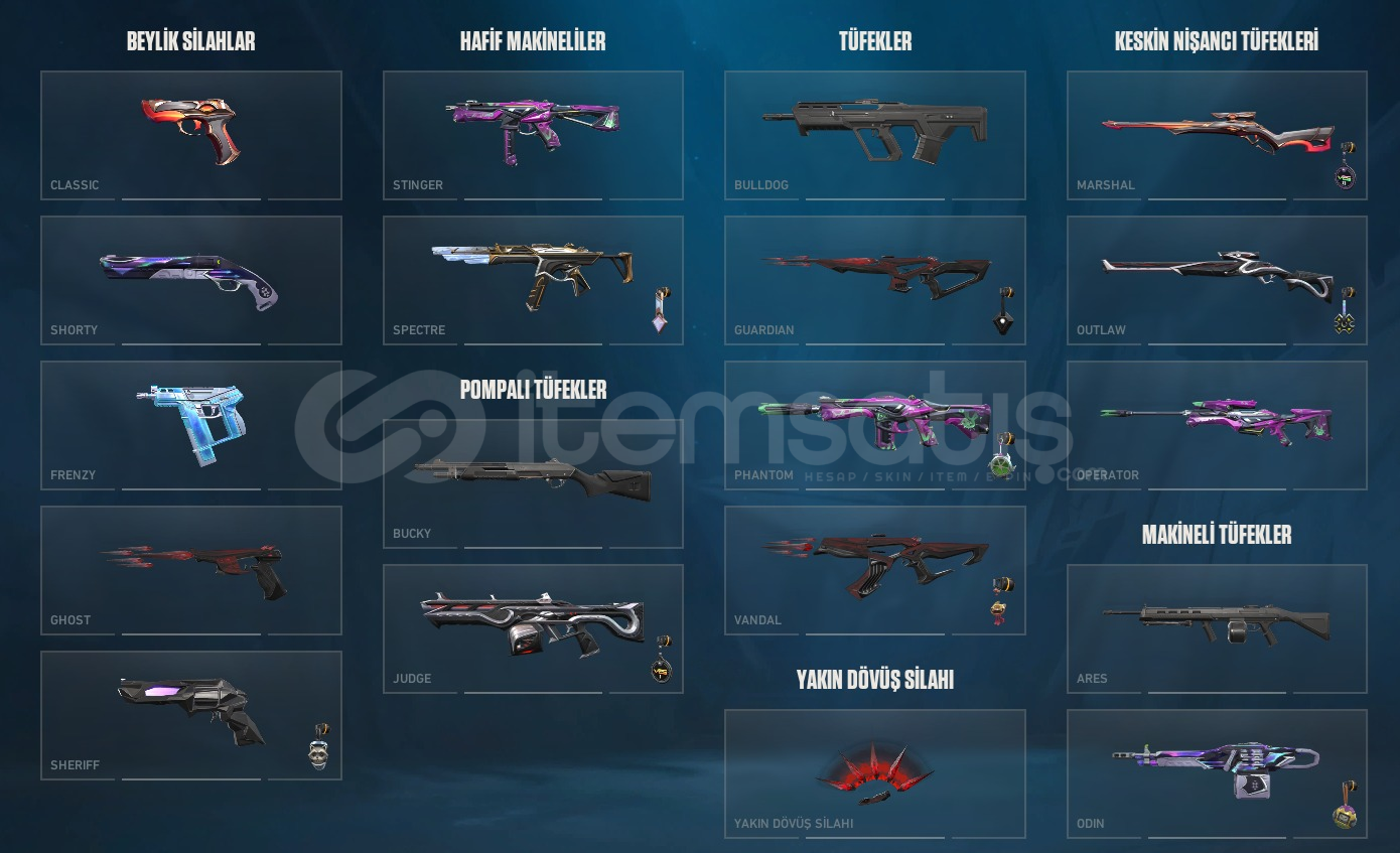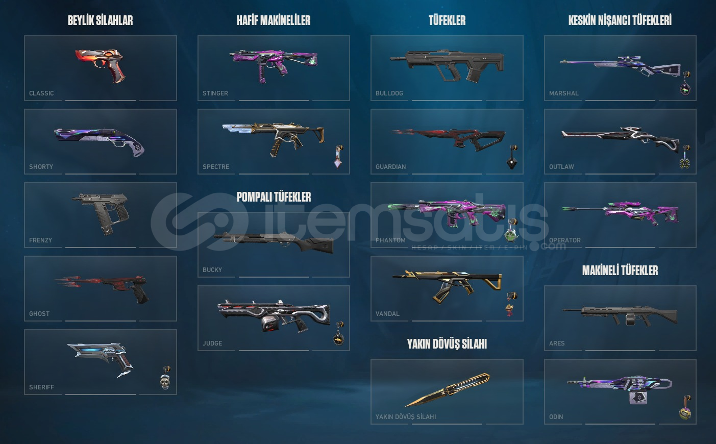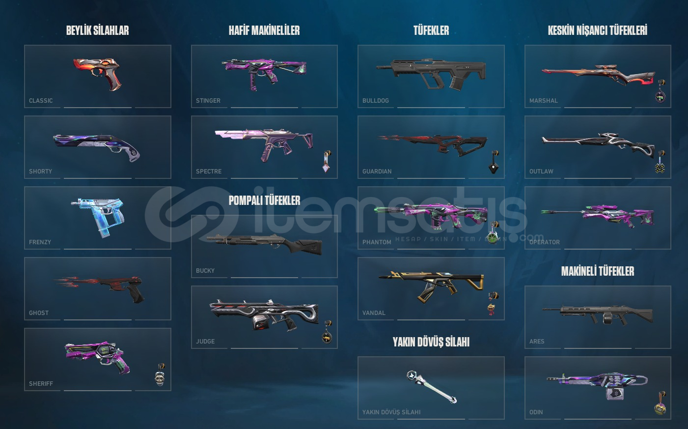 3 Set Bulunmakta:* Cyrax Set* Champions 2025 Set* Ponçik Ecel Set3 Setin de bıçağa kadar bolca silah skini var  Harici Silahlar:* Ejder Ateşi Vandal* Kuronami Sheriff* Anomali Sheriff* Işık Muhafızları Spectre* Evori'nin Büyülü AsasıToplamda 2 bp satın alınmıştır hesap 135 leveldir