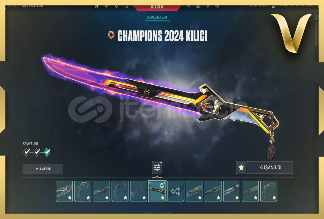 BIÇAKLAR (11): CHAMPİONS 2024 KILICI ( TEKRAR GELMEYECEK ) , VCT 2025 KARAMBİT ( TEKRAR GELMEYECEK ) , VCT LOCK IN ( TEKRAR GELMEYECEK ) , 5 YEARS BETA REMASTERED ( TEKRAR GELMEYECEK ) , CHAMPİONS 2025 KELEBEK ( TEKRAR GELMEYECEK ) , YAĞMACI KARAMBİT , SIRÇİÇEĞİ KUNAİ , YILDIZBELASI , FAZ KORUYUCU BIÇAĞI , ÖZEL HAREKAT KELEBEK , RGX KARAMBİT