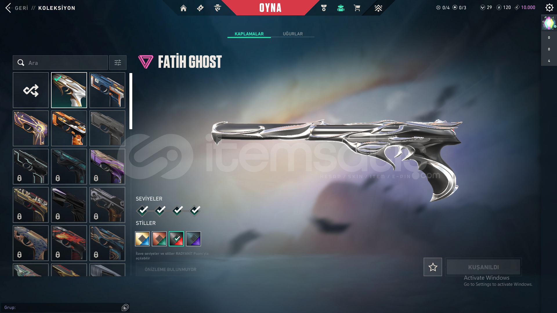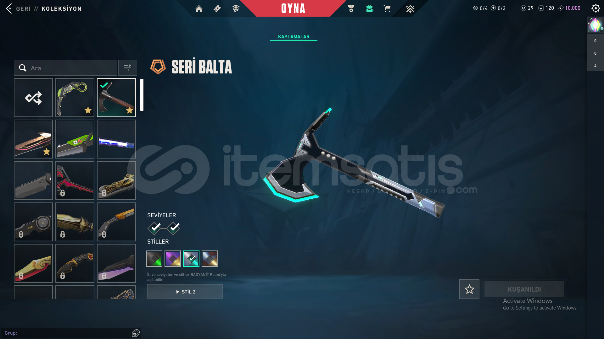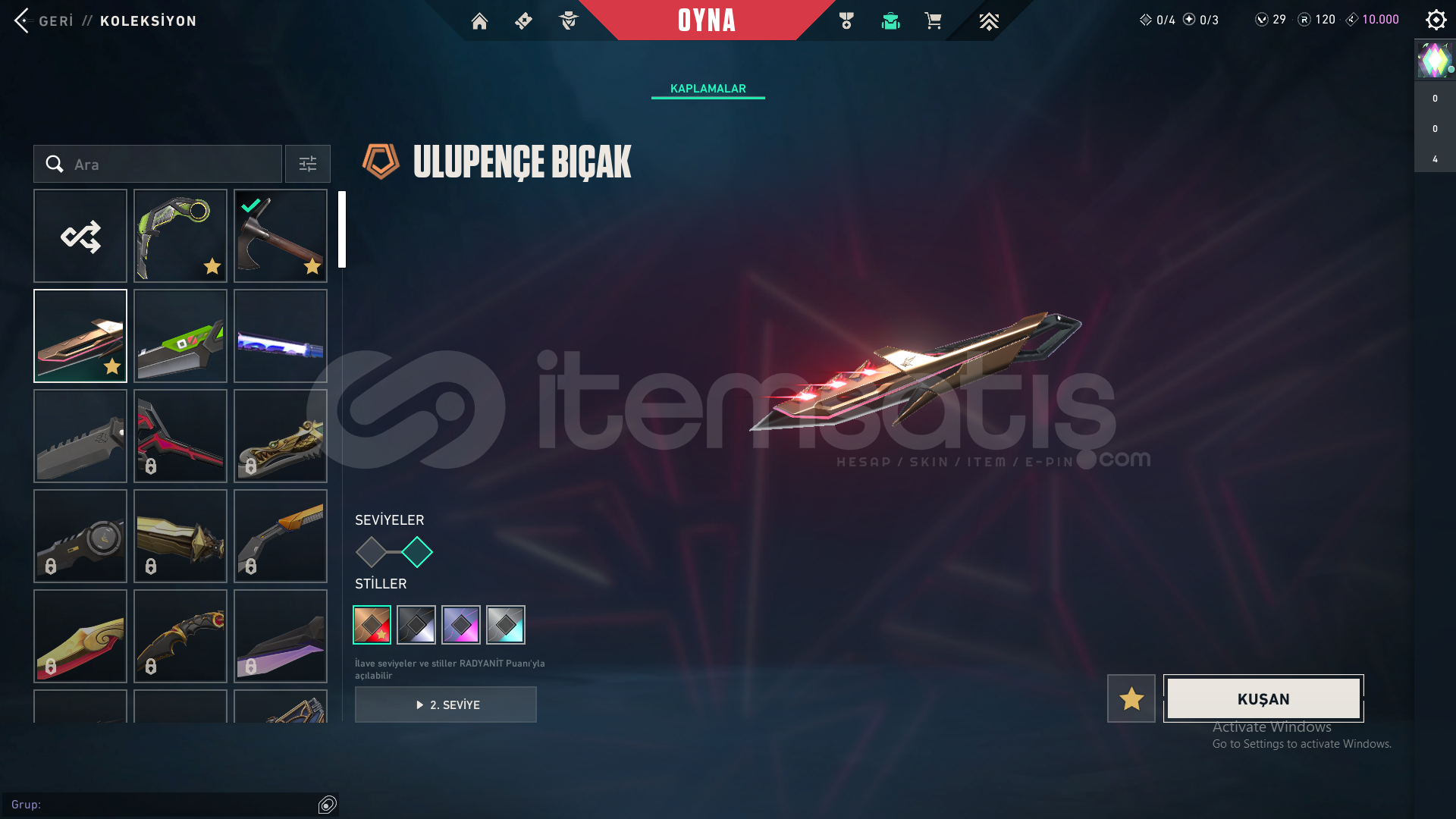 -RGX 11Z Pro Karambit-Seri Balta-Ulupençe Bıçak-Yağmacı Vandal-Zamanın Ötesi Vandal-Asil 2.0 Phantom-Fatih Ghost+battlepass skinleri mevcuttur.Hesabın ilk maili vardır hesabı kurtarmayı deneyerek kanıtlayabilirim.Telefon numarası bağlı değildir.