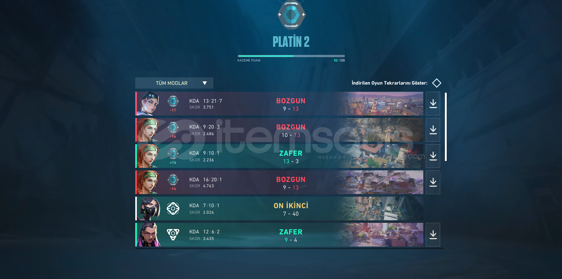 Hesapta ban sorunu yok İsim değiştirme hakkı vardır İlk mail ile verilicektir hoşgeldin maili vardır Hesap bölüm 6 2. kısımdan beri açıktır Max elmas 1 e kadar çıkmıştır güncel rankı platin 2 Skinler Zamanın Ötesi VANDAL Faz Koruyucu VANDAL İyon VANDAL Exo VANDAL Gaia PHANTOM Protokol SHERİFF Cesur Yürek GHOST Uzaylı Avcısı Bıçak K&...