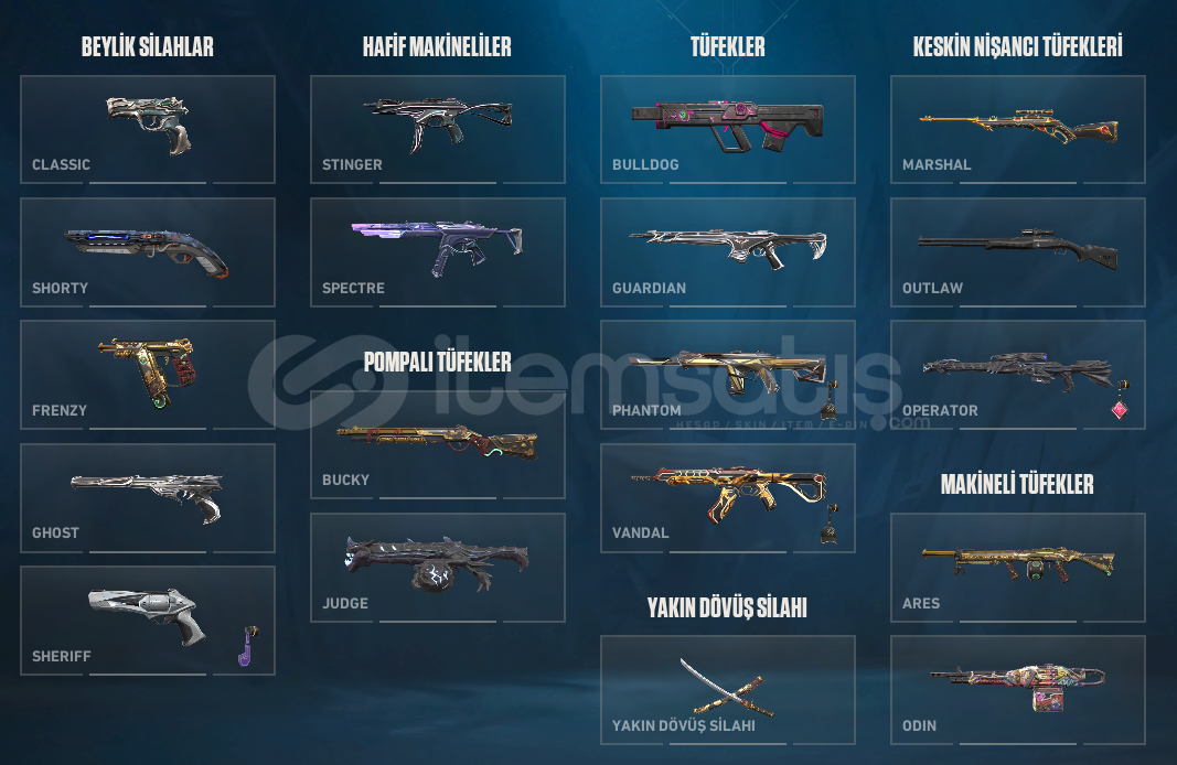 Vandal : Oni , Delipop , Champions 2021 , Yağmacı // Phantom : Asil , Oni // Operator : Ejder , İon // Bıçak : Oni Katana// Bulldog : Oni , Spectrum // diğer : Kaos Shorty , Yitik Classic , Oni Frenzy , Fatih Ghost , İon Sherrif , Oni Bucky , Ejder Judge , Işık Muhafızı Spectra, Fatih Stringer , Fatih Guardian , Oni Ares+9 Battlepass