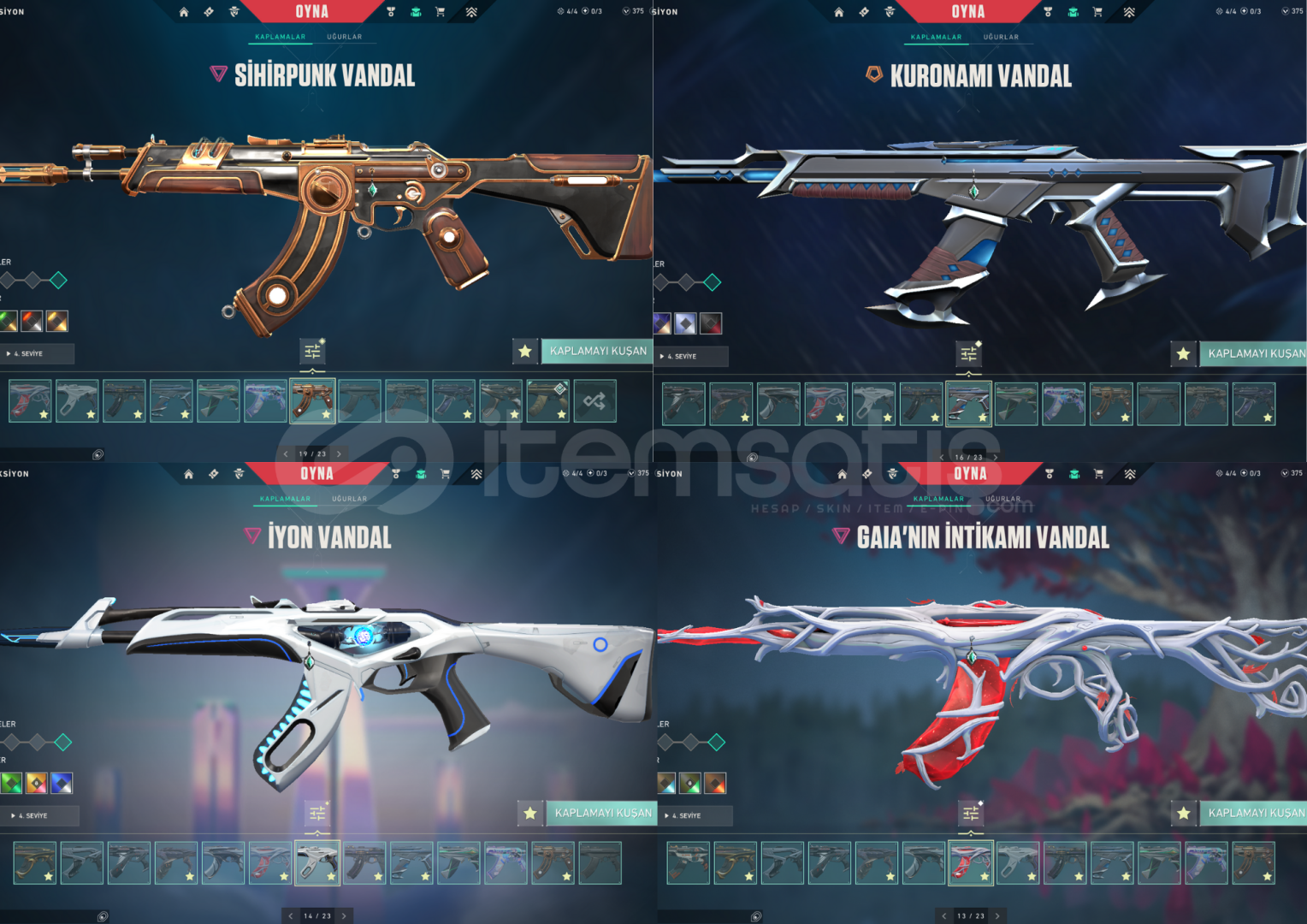 • Yıldız belası vandal, Zamanın ötesi vandal, Yağmacı vandal, sihirpunk vandal, Kuronomi vandal, kaosun başlangıcı vandal, iyon vandal, Gaıanın intikamı vandal, Evrim vandal, ejder ateşi vandal, cyrax vandal, Cesur yürek vandal, Asil vandal, Arcane vandal, Aemondırvandal ve bp skinleri vardır.