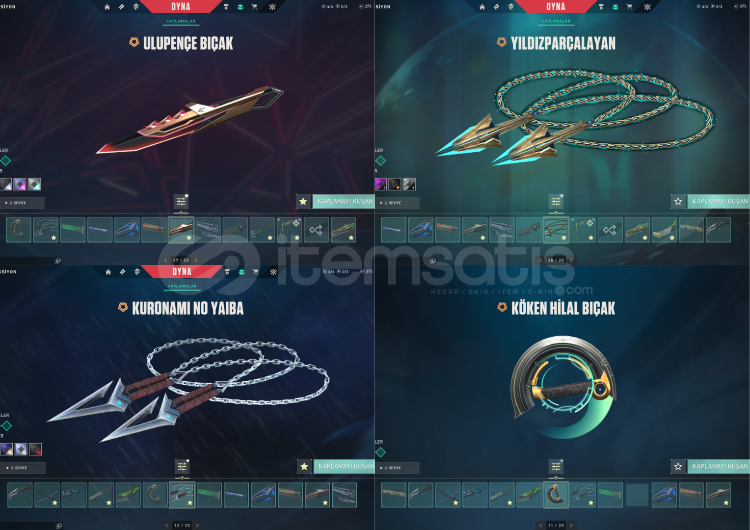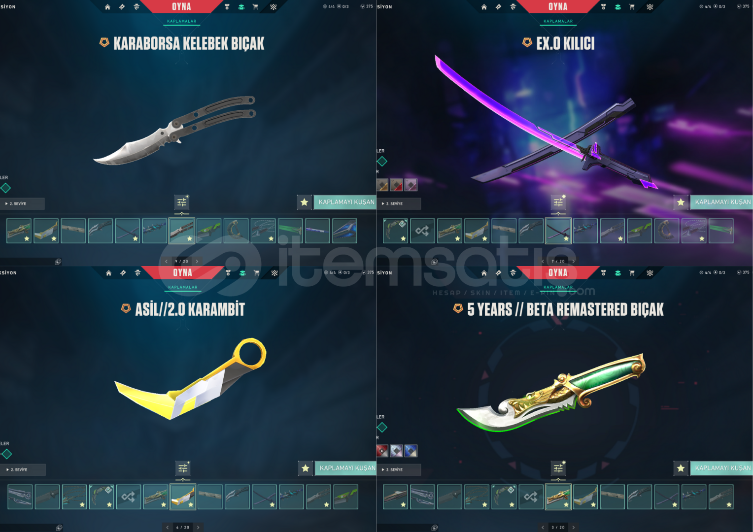 • Rgx11z pro karambit, Yıldızparçalayan, Ulupençe Bıçak, Kuronomı no yaıba, Köken hilal bıçak, Karaborsa kelebek bıçak, Ex.o kılıcı, Asil 2.0 karambit, 5 years beta remastered bıçak ve bp skinleri vardır.