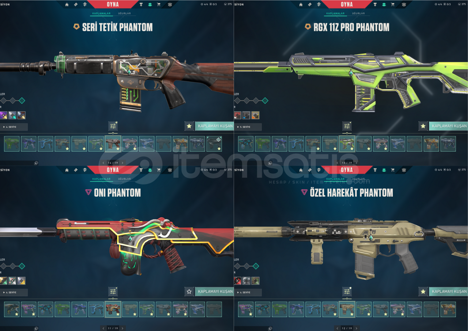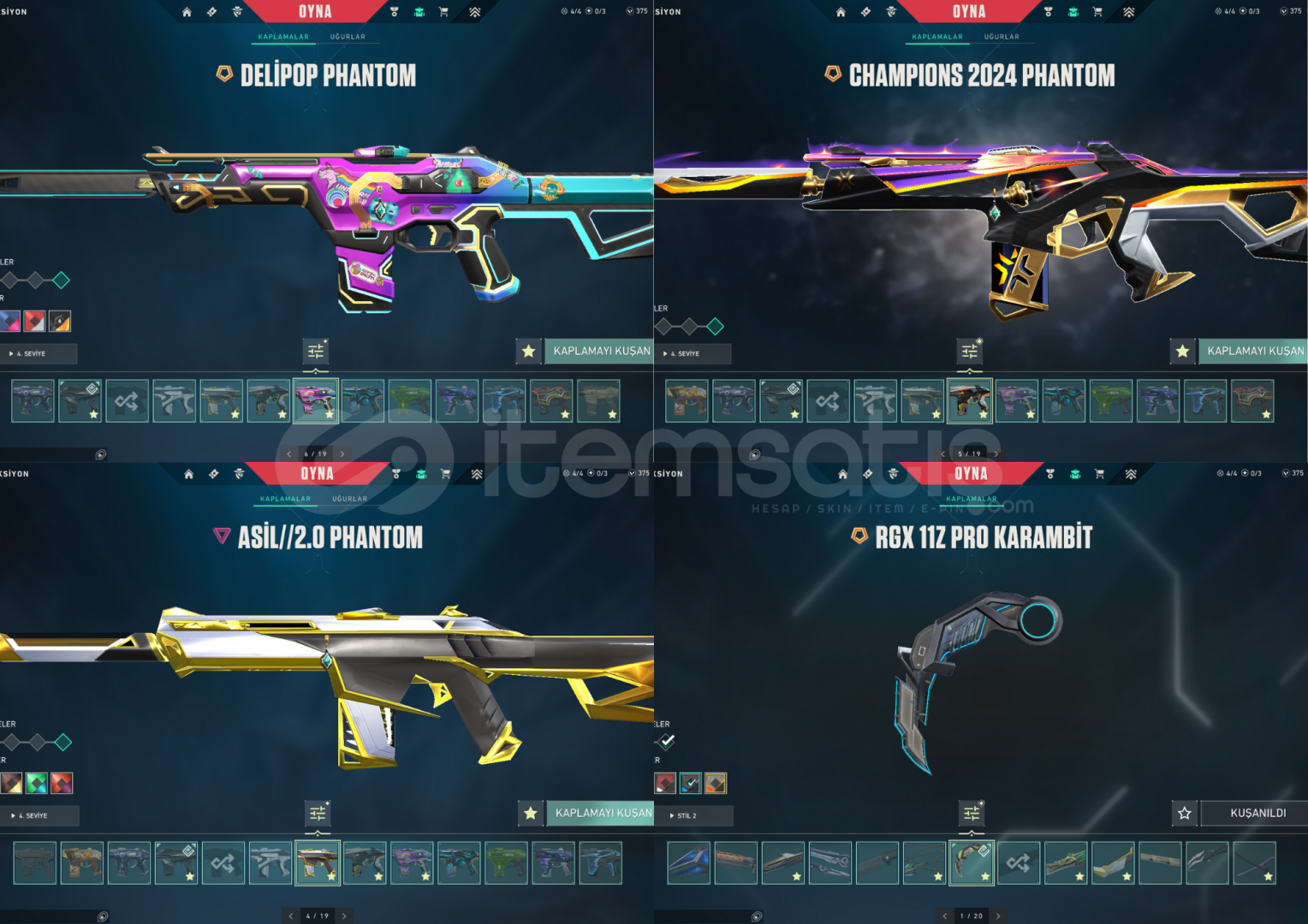• Anomali phantom, Sırçiçeği vandal, seri tetik phantom, Rgx 11z pro phantom, özel harekat phantom, onı phantom, delipop phantom, Champıons 2024 phantom, Asil 2.0 phantom ve bp skinleri vardır.