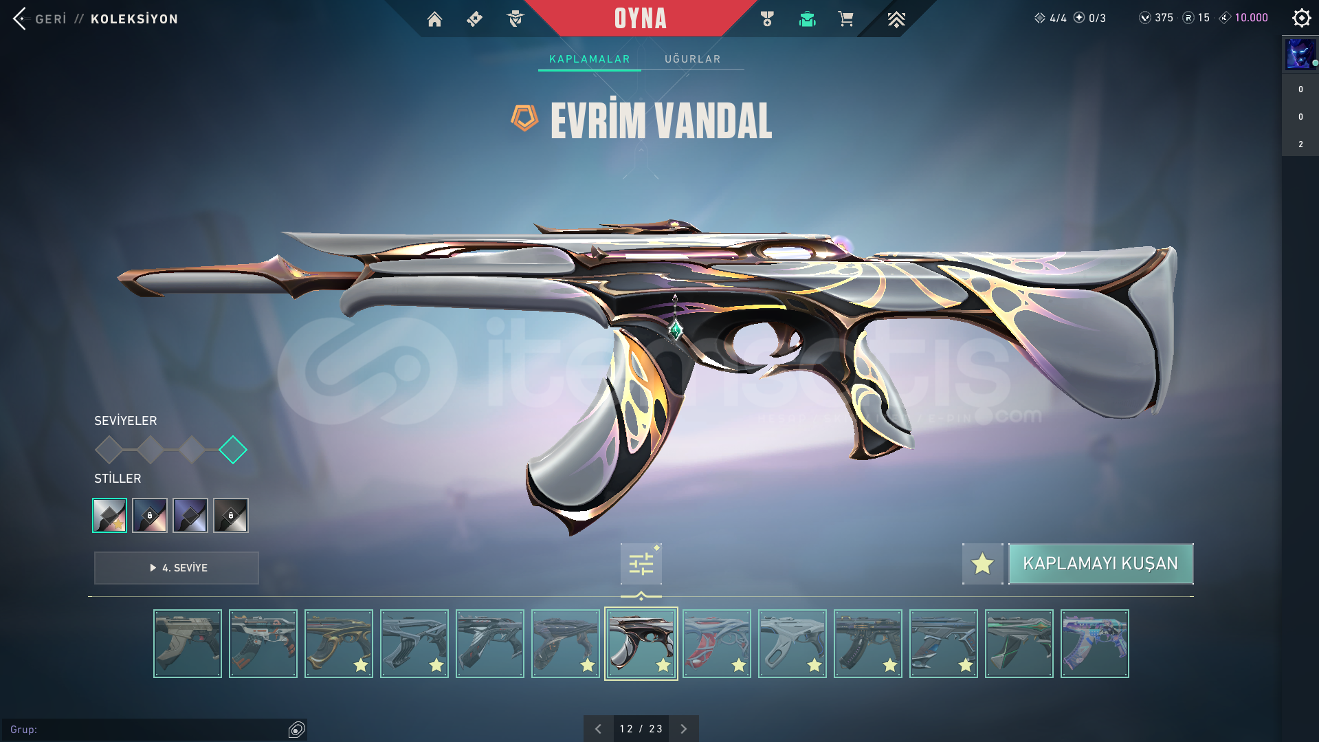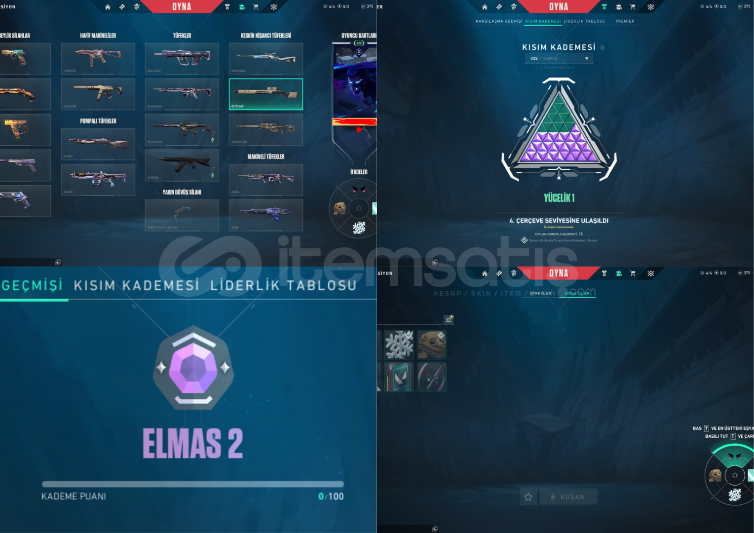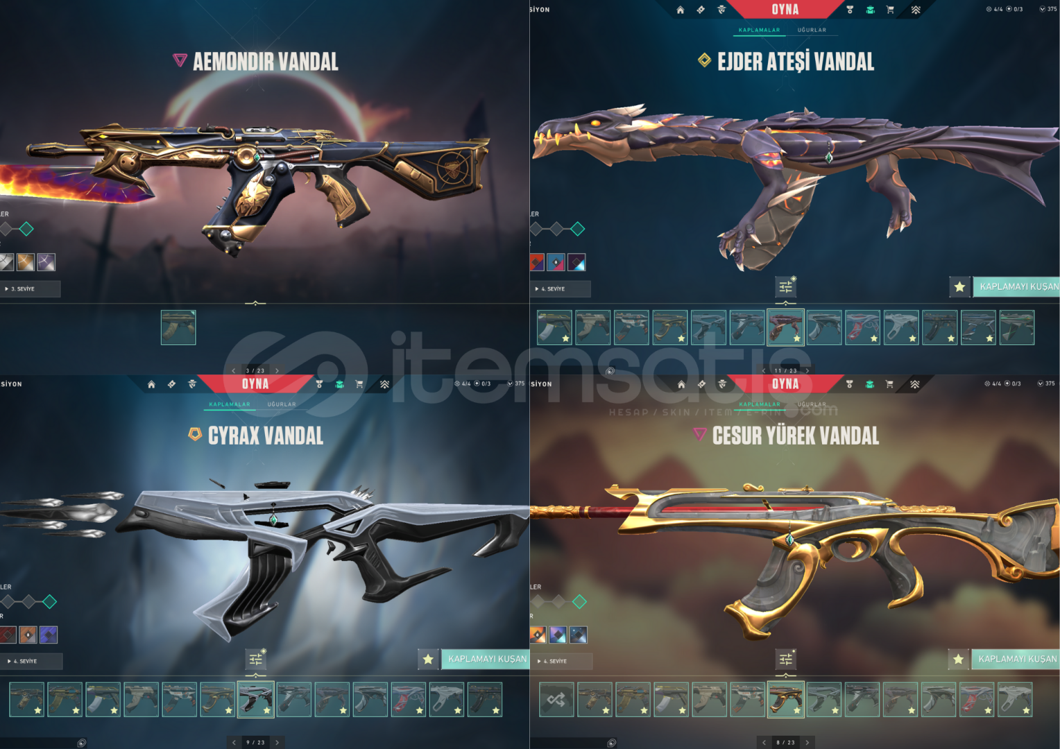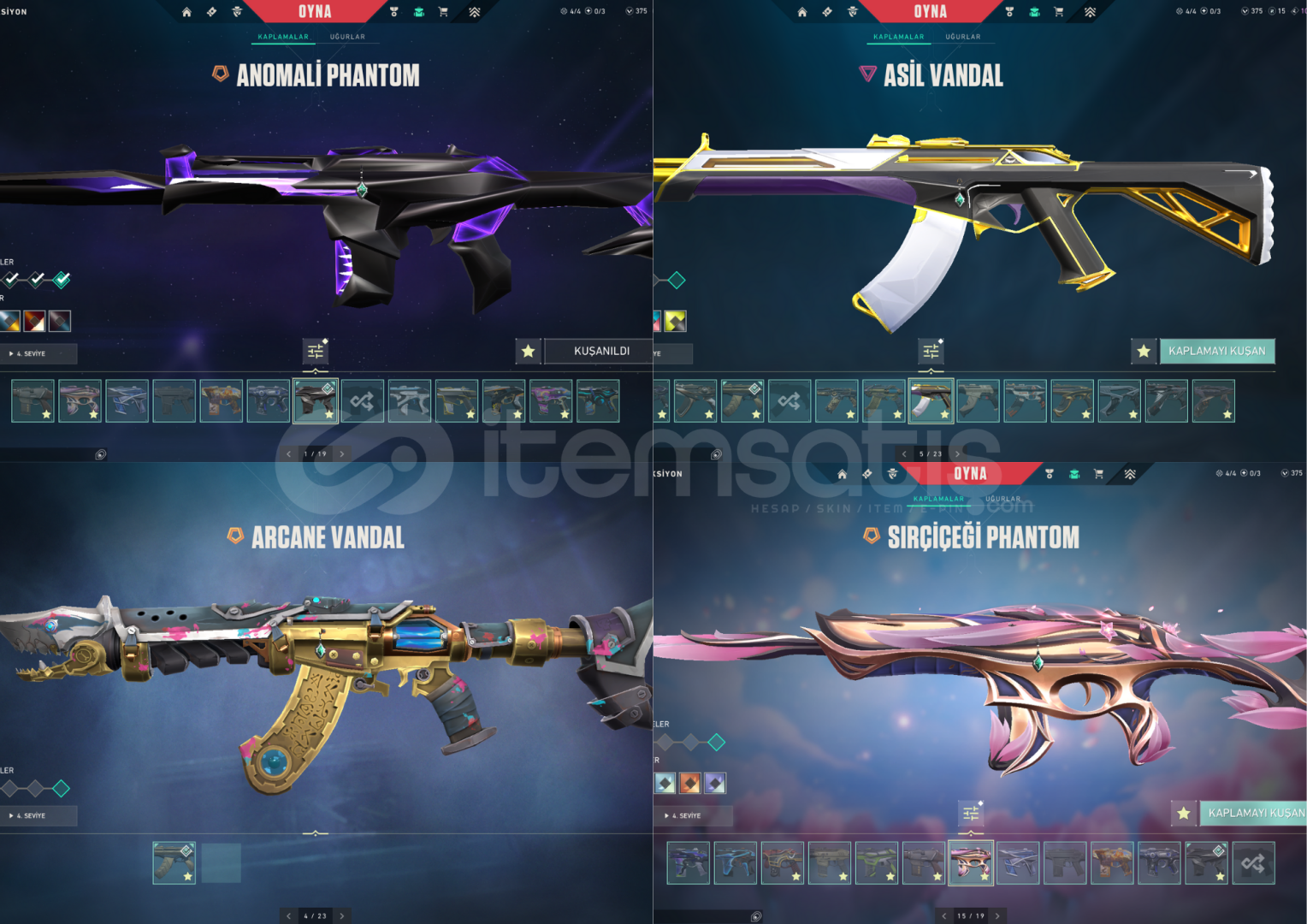 Vandallar;Yıldız belası vandal, Zamanın ötesi vandal, Yağmacı vandal, sihirpunk vandal, Kuronomi vandal, kaosun başlangıcı vandal, iyon vandal, Gaıanın intikamı vandal, Evrim vandal, ejder ateşi vandal, cyrax vandal, Cesur yürek vandal, Asil vandal, Arcane vandal, Aemondırvandal ve bp skinleri vardır.Phantomlar;Anomali phantom, Sırçiçeği vandal, seri tetik phantom, Rgx 11z pro phantom, &o...