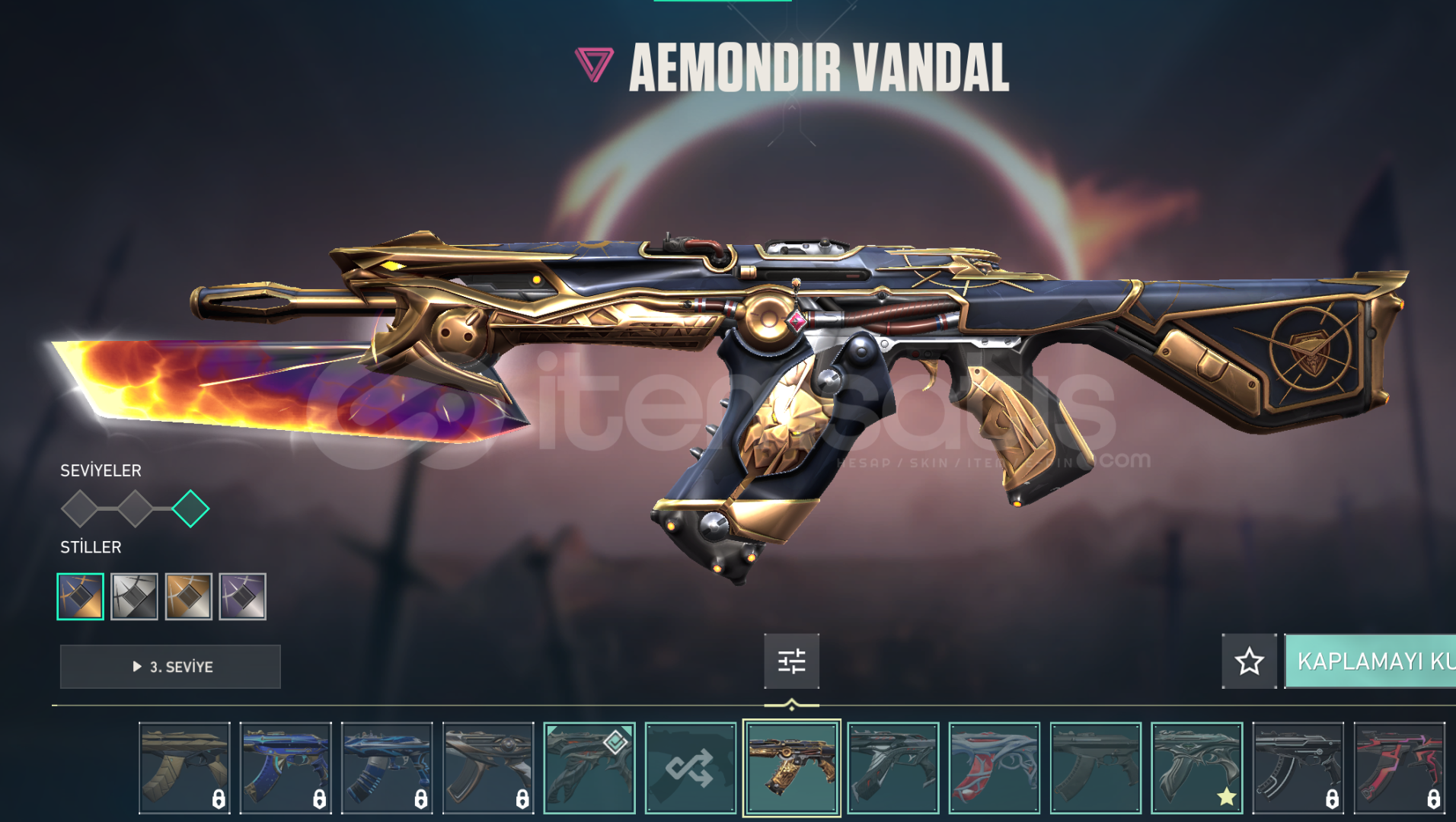 içinde 4 tane vandal (Felaketin kalbi, Gaia, Yitik, Aomendır), 1 bıçak (Jett Bıçağı go1 cilt), 1 battlepass ve oyuncak ayı var.