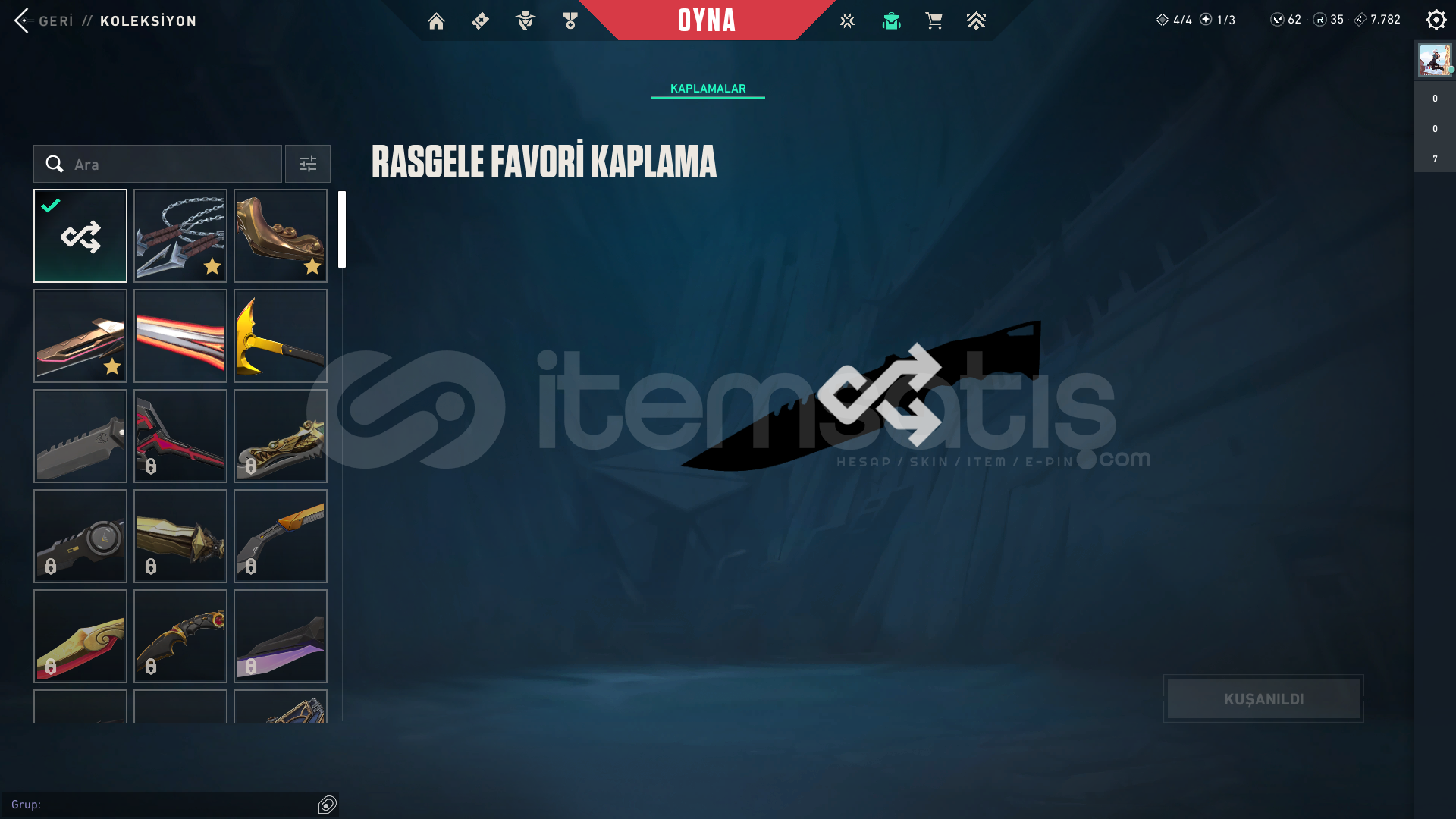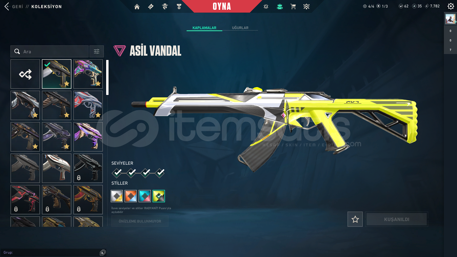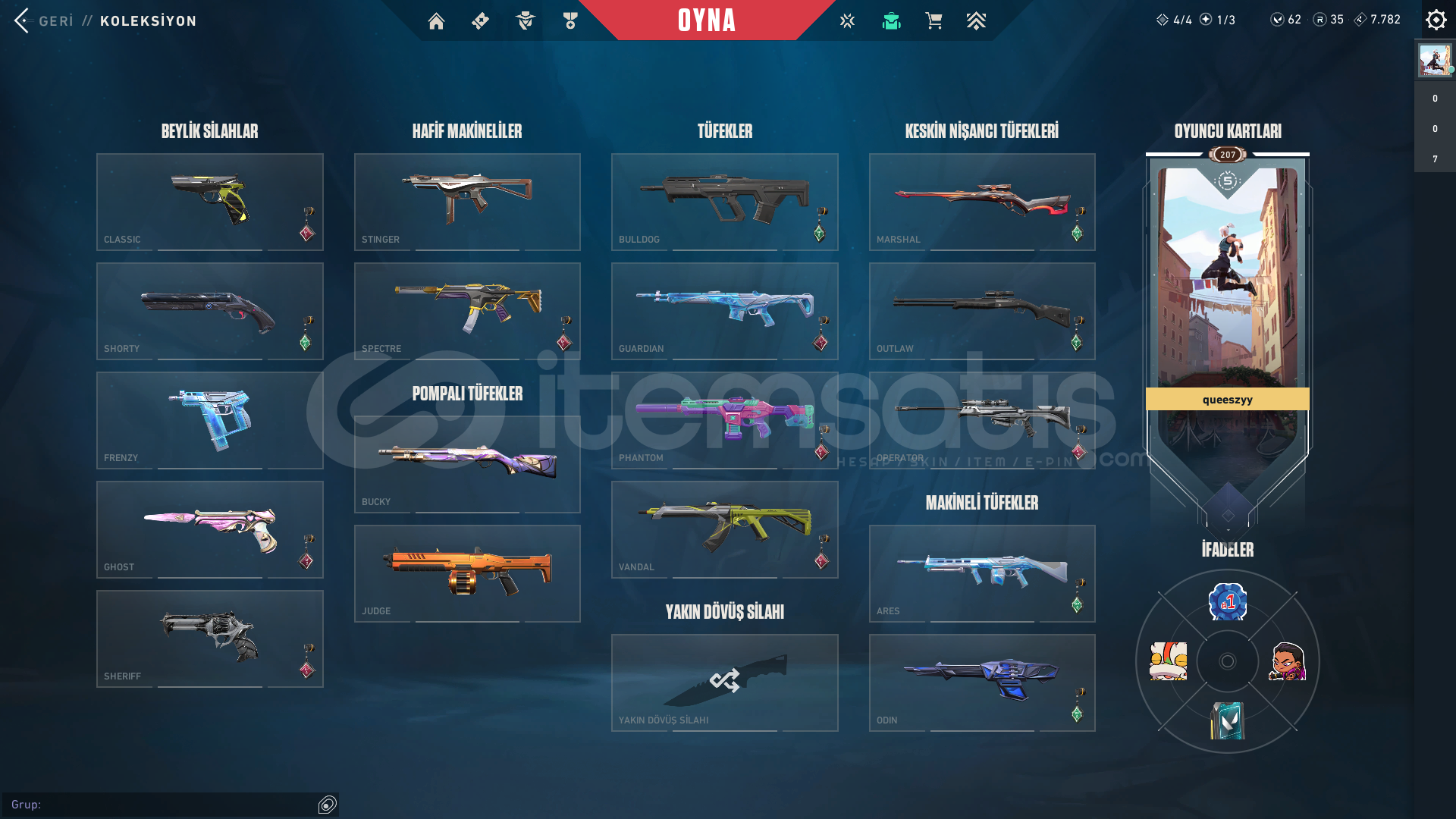 hesap immo gördü güncel rank dia 1 hesaptaki skinler şu şekilde classic: asil ghost: evori sheriff: yağmacı spectre: asil phantom: blastx vandal: asil, delpop, yağmacı, kaos, gaia, faz koruyucu, evrim bıçak: yelpaze, kuronami bıçak, ulupençe operator: yağmacı