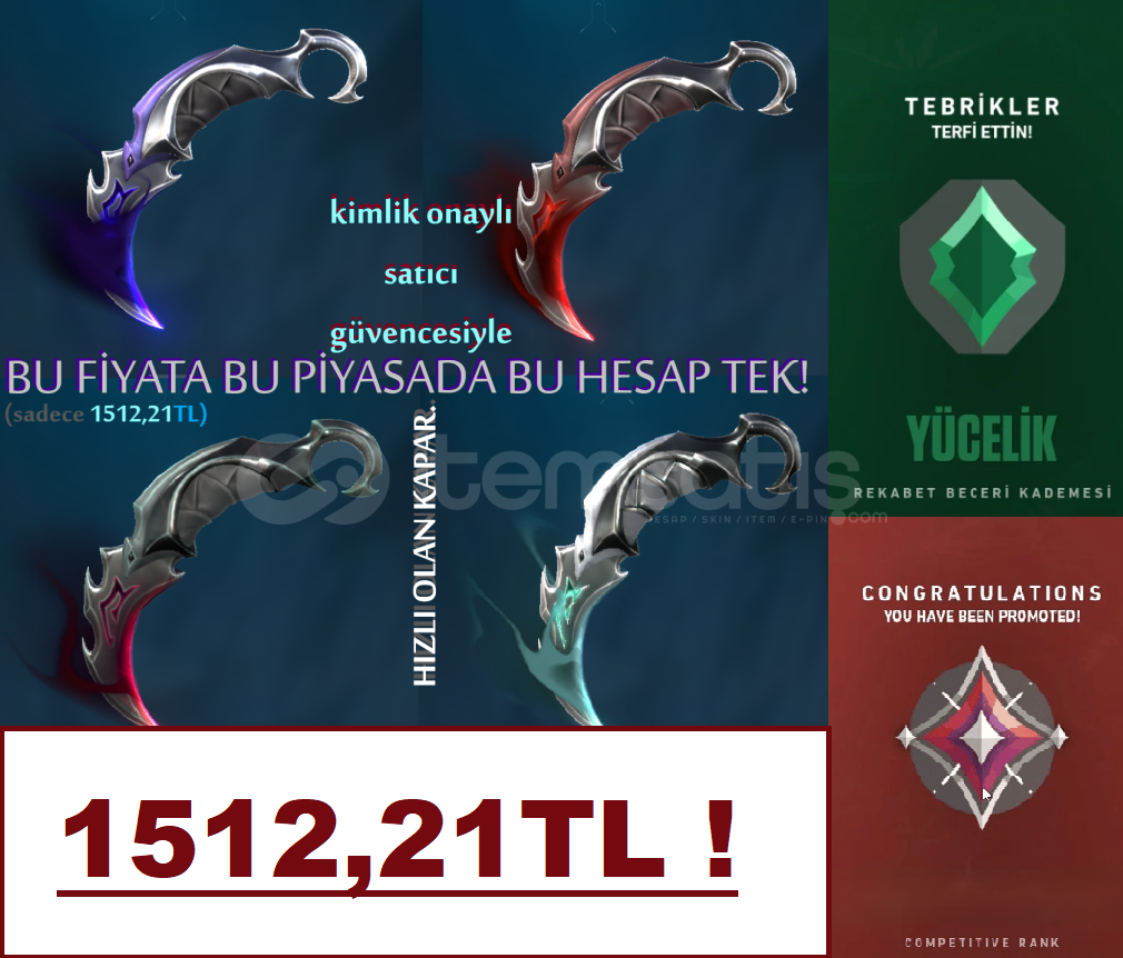 SORULARINIZ İÇİN DM GELEBİLİRSİNİZ :)HESAP ÖZELLİKLERİ:=Hesap rankımız Yücelik 1'dir.=Hesapda fazla fazla skin bulunmaktadır.=Hesapda kesinlikle ban, ceza gibi birşey söz konusu değildir.=TR sunucusuna kayıtlıdır.=Hesap daha çok skinleriyle değil rankıyla öne çıkıyor, fiyat ona göre belirlenmiştir.=Hesap tam bir ...
