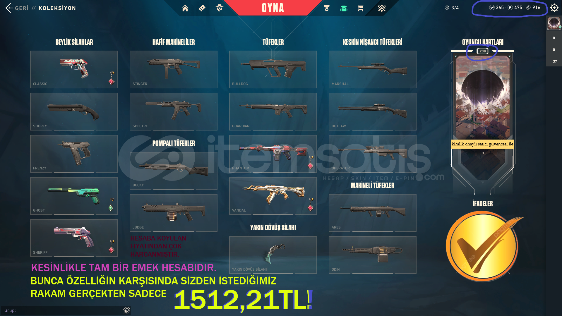 SORULARINIZ İÇİN DM GELEBİLİRSİNİZ :)HESAP ÖZELLİKLERİ:=Hesap rankımız Yücelik 1'dir.=Hesapda fazla fazla skin bulunmaktadır.=Hesapda kesinlikle ban, ceza gibi birşey söz konusu değildir.=TR sunucusuna kayıtlıdır.=Hesap daha çok skinleriyle değil rankıyla öne çıkıyor, fiyat ona göre belirlenmiştir.=Hesap tam bir ...