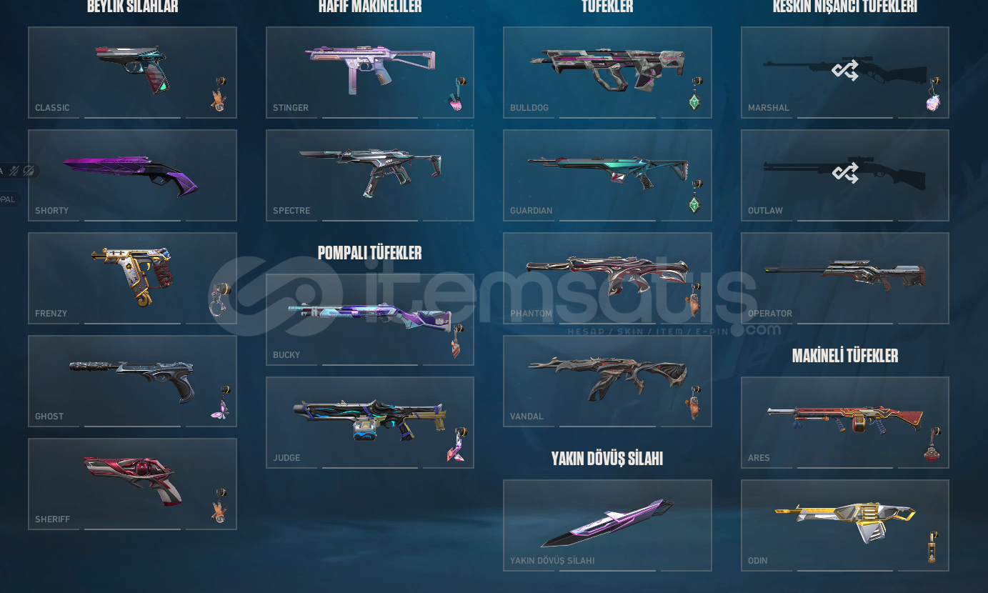 asil classic, yıldız belası shorty, oni frenzy,cesur yürek ghost,zamanın ötesi şerif,protocol buldog ,oni buldog,asil guardian,kaos op,asil odin ve fotoğraflarda gözüken vandal phantom bıçak skinleri mevcuttur.Beş yıllık hesap olup ilk sahibinden satılıktır.İlgilenen kişiye discord üzerinden yayın açarak hesabı gösterebilirim.