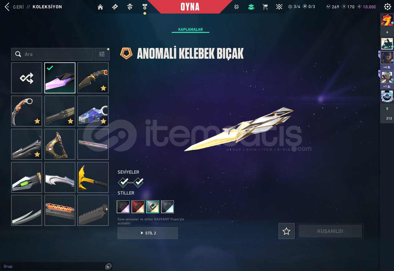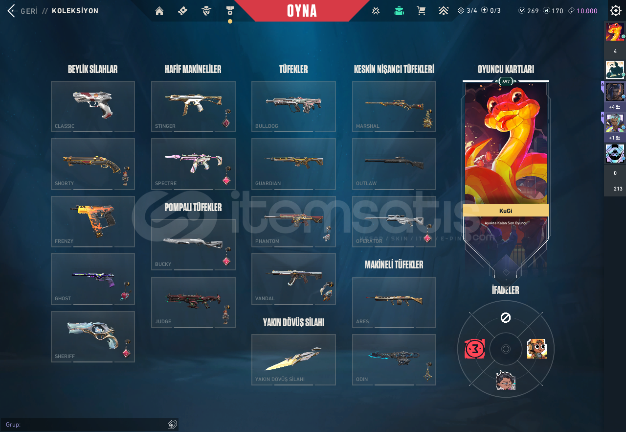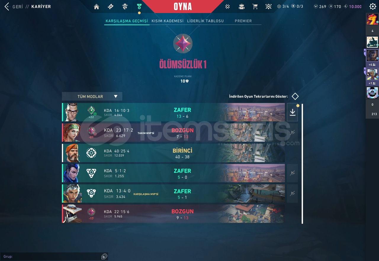 Hesap betadan beri kullanılmaktadır . Şu an Immortal rankındadır. Oyunu az çok bilen biri zaten hesabın değerini bilir . Skin ayrıntılarını ekstra olarak ekliyorum . Şimdiden alıcısına hayırlı uğurlu olsun. Hesap hep immortal eloda durmuştur. Ömurluk güzel hesap . Vandal : Aeomondir Vandal - Arcane Vandal - Gaia - Asil - Yagmaci - Rgx 11z pro - İon - Kuronomi - Yağmacı Phantom : Champions 2022 - Ion - Oni - Afet Bicaklar : Anomali - Altın Afet - Özel harekat - Valorant Go 1 - Yağmacı Ghost : Battlepass Frenzy : Battlepass Shorty : Battlepass Classic : Battlepass Sheriff : Sırçiçeği - Yıkım Elçisi Stinger : Fatih Spectre : Evori Rüyakanatlar - Blast X Bucky : İon Judge : Yıkım Elçisi Bulldog : Oni Guardian : Rgx 11z pro Marshal : Battlepass Operator : İon - Köken Odin : Yıkım Elçisi Pazarlık vardır . Hesaba yatırılan miktar totalde 9828 TL’dir .