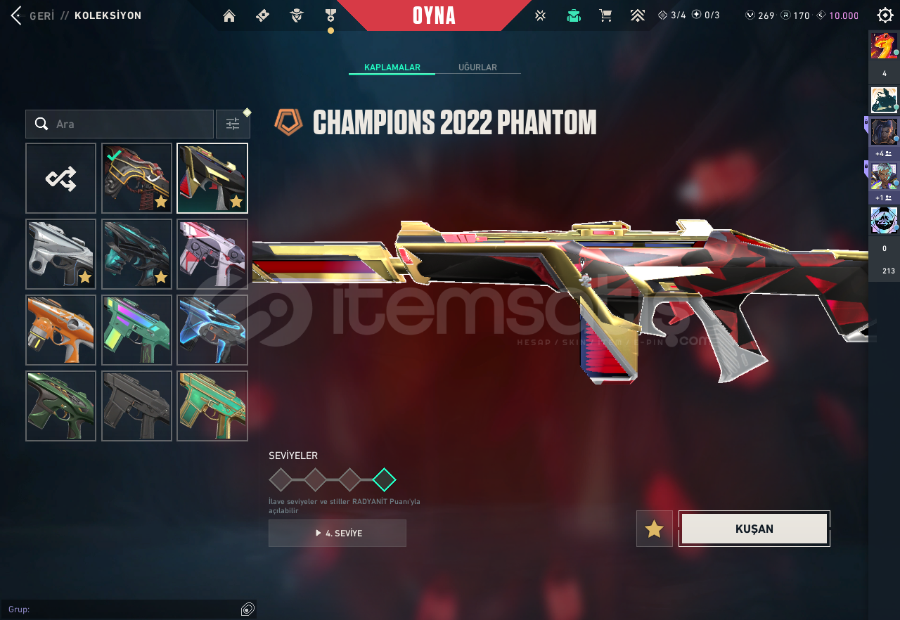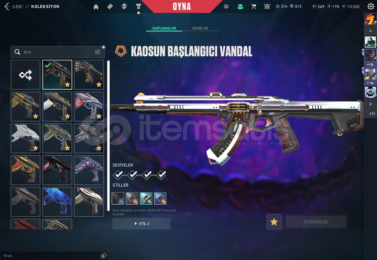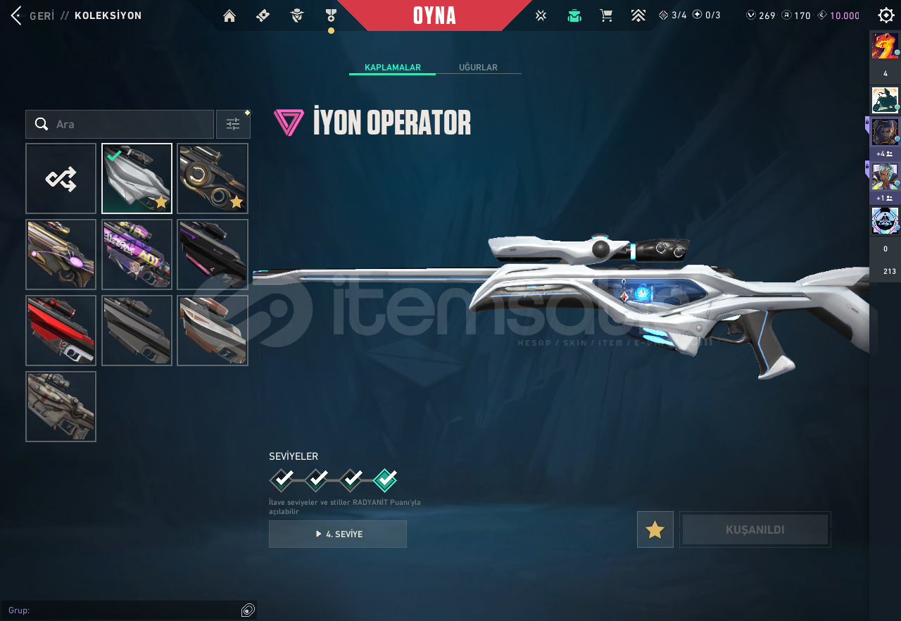 Hesap betadan beri kullanılmaktadır . Şu an Immortal rankındadır. Oyunu az çok bilen biri zaten hesabın değerini bilir . Skin ayrıntılarını ekstra olarak ekliyorum . Şimdiden alıcısına hayırlı uğurlu olsun. Hesap hep immortal eloda durmuştur. Ömurluk güzel hesap . Vandal : Aeomondir Vandal - Arcane Vandal - Gaia - Asil - Yagmaci - Rgx 11z pro - İon - Kuronomi - Yağmacı Phantom : Champions 2022 - Ion - Oni - Afet Bicaklar : Anomali - Altın Afet - Özel harekat - Valorant Go 1 - Yağmacı Ghost : Battlepass Frenzy : Battlepass Shorty : Battlepass Classic : Battlepass Sheriff : Sırçiçeği - Yıkım Elçisi Stinger : Fatih Spectre : Evori Rüyakanatlar - Blast X Bucky : İon Judge : Yıkım Elçisi Bulldog : Oni Guardian : Rgx 11z pro Marshal : Battlepass Operator : İon - Köken Odin : Yıkım Elçisi Pazarlık vardır . Hesaba yatırılan miktar totalde 9828 TL’dir .