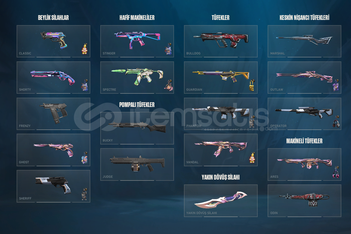 Hesapta bir çok skin vardır skinlerNOT: YENİ GELEN KURABİYADE ALINMIŞTIRClassic: DelipopGhost: Sır ÇiçeğiSherif: OneTap'ten OraSpectra: EvoriGuardian: AsilMarshal: KuronomiAutlow: Sır ÇiçeğiOperetör: OneTap'ten OraPhantom: OneTap'ten OraVandal: SırÇiçeği,OneTap,AsilAres: Sır ÇiçeğiBıçak: SırÇiçeği Yalpaze,Onetap'ten Ora Bıç...