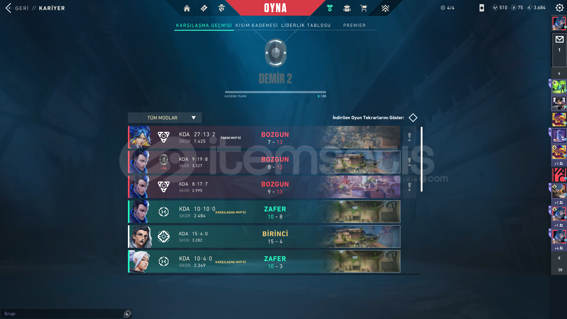 Ürün Hakkında Bilgi;İLANI SATIN ALDIĞINIZDA 7/24 OTOMATİK OLARAK TESLİM EDİLİR.RANK - DEMİR 2HESAP SEVİYESİ - 29SKİN SAYISI - 2VP SAYISI - 510+ 100.000 BAŞARILI İŞLEM İLE GÜVENLE ALIŞVERİŞ YAPABİLİRSİNİZ