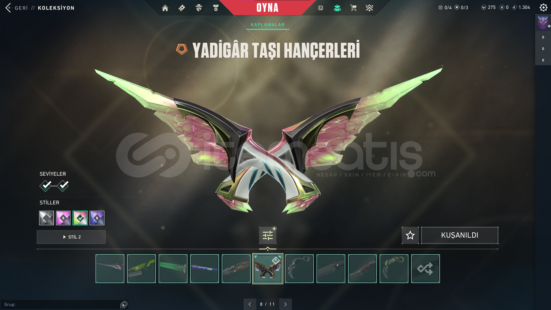 ⭐ Hesapta RGX 11z Pro Karambit , Yağmacı Karambit , Zifiri Tırpan , Sihirçakı , Yadigar Taşı Hançerleri , Kuronami Vandal , Zamanın Ötesi Vandal , Ejderin Buyruğu Vandal , Işık Muhafızları Operator , Tork Operator , İğnekabuk Kılıç , Kartuş Hançeri , Kuyrukluyıldız Kılıcı , Pop Star Işık Çubuğu , Protokol Sheriff , Gaia'nın İntikamı Ghost , Kuronami Marshal , Felaketin Kalbi Spectre , Popstar Vandal , Kuyrukluyıldız Vandal , Zifiri Phantom , Fatih Phantom , Ahenk Phantom , Kartuş Phantom , İğnekabuk Phantom , Yağmacı Guardian , Zifiri Bulldog ve Zifiri Classic gibi skinler bulunmaktadır. Görsellerde tüm skinleri görebilirsiniz.