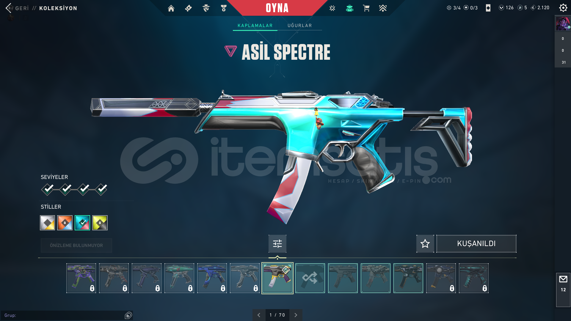 KURONAMI VANDAL, ONİ VANDAL, EVORİ VANDAL, YİTİK VANDAL, ULUPENÇE VANDAL, EJDER VANDALASİL PHANTOM, ZİFİRİ PHANTOMYAĞMACI KARAMBİT, KARABORSA KELEBEK, KARTUŞ HANÇERİ, İS KARASI ELDİVENYAĞMACI SHERİFF, ASİL SPECTREBUNLAR DIŞINDA DİĞER SİLAHLARDA DA BATTLEPASS SKİNLERİ VARDIR.