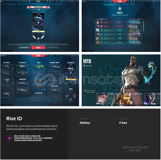 yağmacı vandal yoktur102 vp ve 20 radyanit vardır hesap içinderesimlerde sadece önemli skinler var diğer silahlarda da bp skinleri vardır dolu hesaptır4 ajan dışında hepsi açıkgümüş 2 81 kphiçbir banı yoktur gayet temiz hesap229 seviyeisim değiştirme şubat ayında geliyor