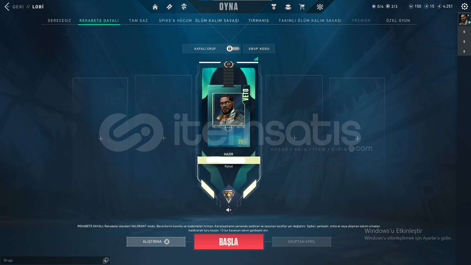 Rank: Bronz 3Hesap Seviyesi: 27Skin Sayısı: 1Vp Sayısı: 150E-posta ve şifre olarak otomatik teslim edilir aldığınız an.