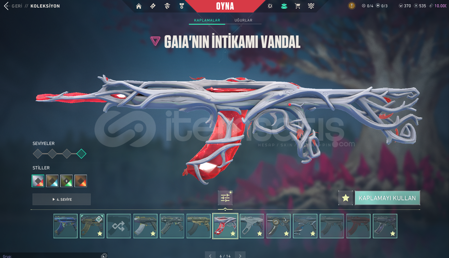 • Arcane Vandal + Kuronami Vandal + Gaia Vandal + İyon Vandal + Köken Vandal + Yıldız Belası Vandal + Yağmacı Vandal + Asil Vandal + Oni Phantom + İyon Phantom + Yitik Op + Asil Classic + İyon Sheriff + Seri Tetik Sheriff + RGX Sheriff + Özel Harekat Ghost + Delipop Balta olmak üzere toplamda 81 Skin var.
