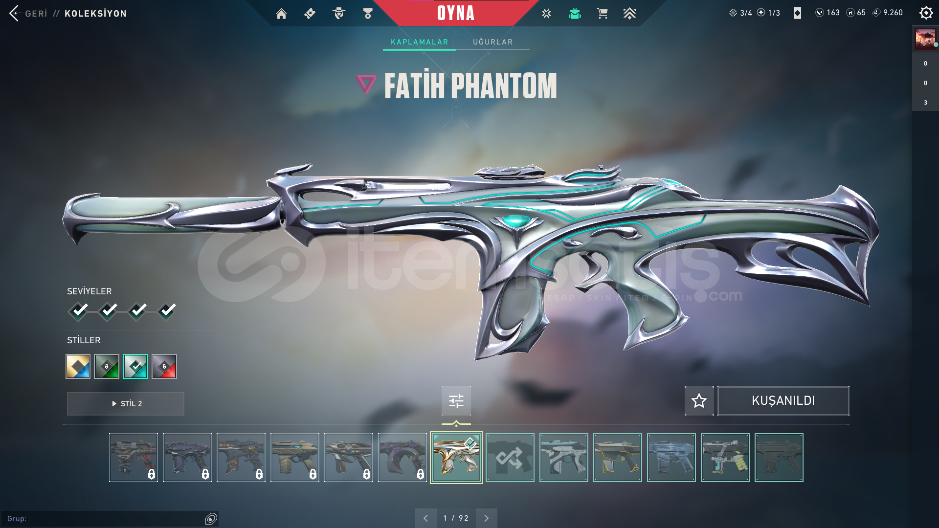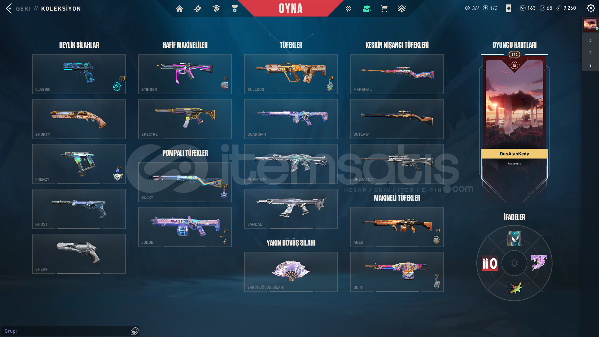 mail devri yaplıcaktir 132 level takıldıgınız merak etdiginiz soru varsa dmdenVandallar :Aemondir Vandal Araxys Vandal Champiosn 2023 Vandal Kuronami Vandal Oni Vandal Neptune Vandal Phantomlar : Prime Phantom Sovereign Phantom Bicaklar : Xenohunter , Ignite Fan , Xerofang Operator : Reaver Operator Spectre : Prime Spectre Sheriff : Ion Sheriff Ghost : Valiant Hero Ghost Frenzy : Prime Frenzy Clasicc : Vct X Lev Clasicc Digerleri Bp Ile Doludur Klasik Skin Olan Silah Yok...