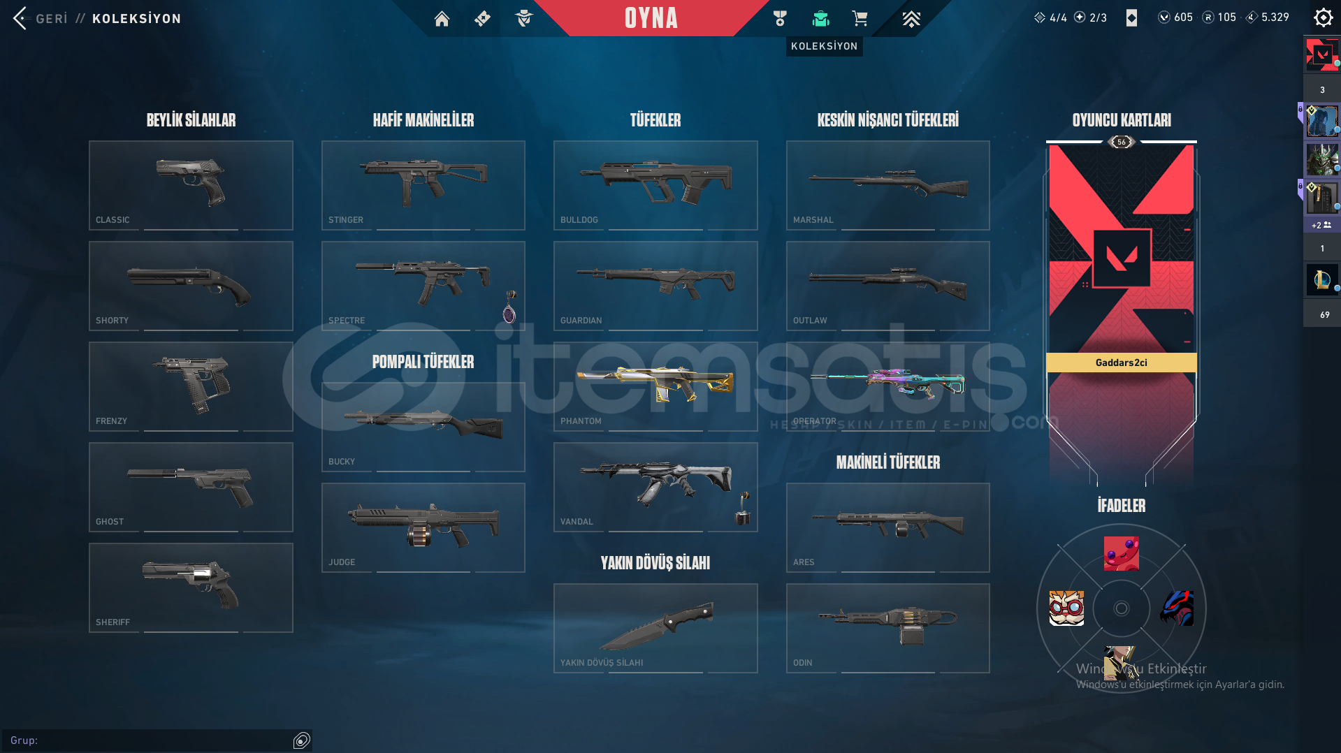 Hesapta asil phantom yağmacı vandal delilop operator skinleri mevcut ve hesapta 605vp var