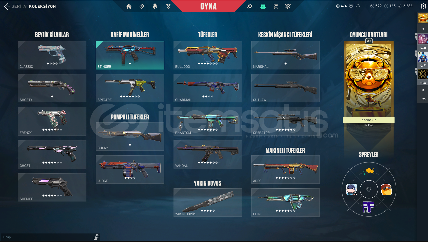 Hesap bölüm 02 kısım 2 açılmıştır max dia 2 ye çıkmıştır.Güncel rank gold 3283 lvl579 vp165 rp vardır 2 battle passClassic - 5 adet normal skinShorty - 4 normal skinFrenzy - oni - 4 normal skinGhost - fatih - 6 normal skinSherrif - anomali - 6 normal skinStinger - 1 normal skinSpectre - asil - viran - 1 normal skinBucky - 1 normal skinJudge - 2 normal skinBulldog - oni - 2 normal skinGuardian - 2 normal...