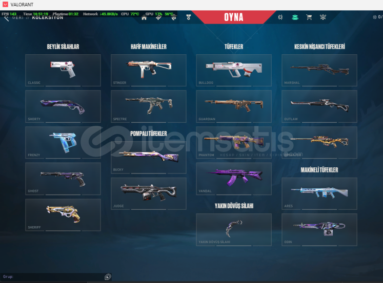 Hesaptaki Skinler​Spectrum ClassicYağmacı GhostEjderin Buyruğu SheriffYitik SpectreSpectrum BulldogSihirpunk GuardianSeri Tetik PhantomKuronami VandalSoğuk Çelik VandalYıldız Belası VandalChampions 2025 VandalDelipop VandalZifiri MarshalDelipop OperatorYağmacı OperatorYağmacı KarambitUzaylı Avcısı Bıçağı (Bayonet)Champions 2025 Kelebek BıçakNot: Hesap içerisinde 9264 Valora...