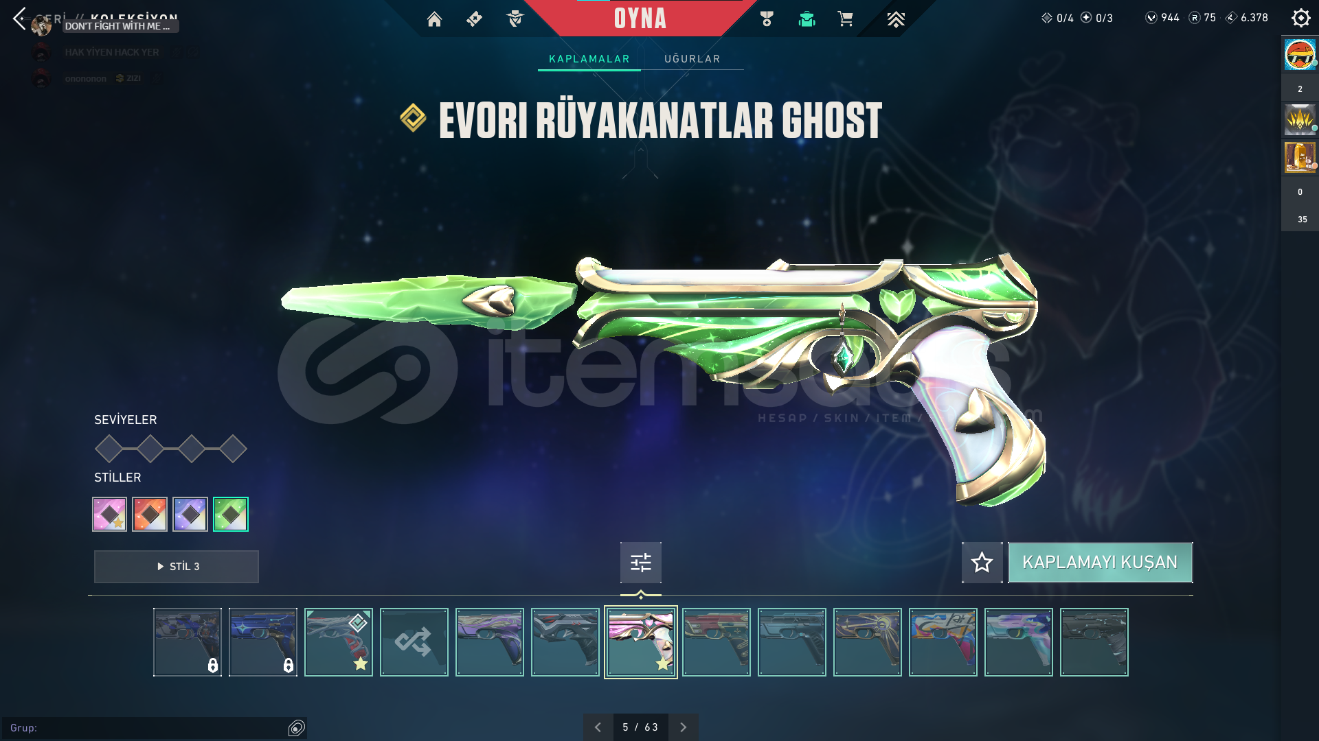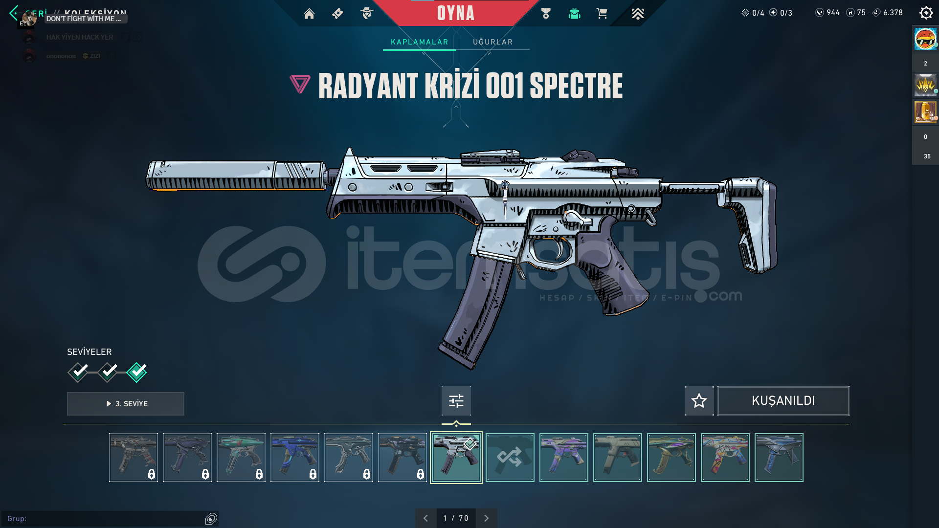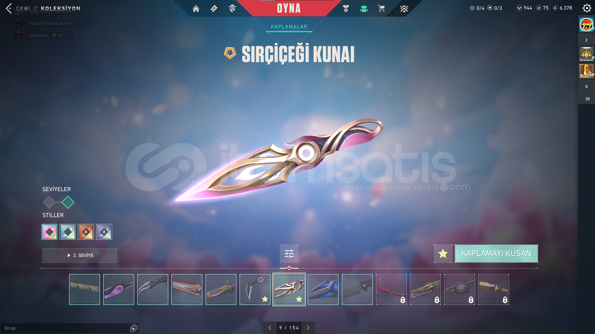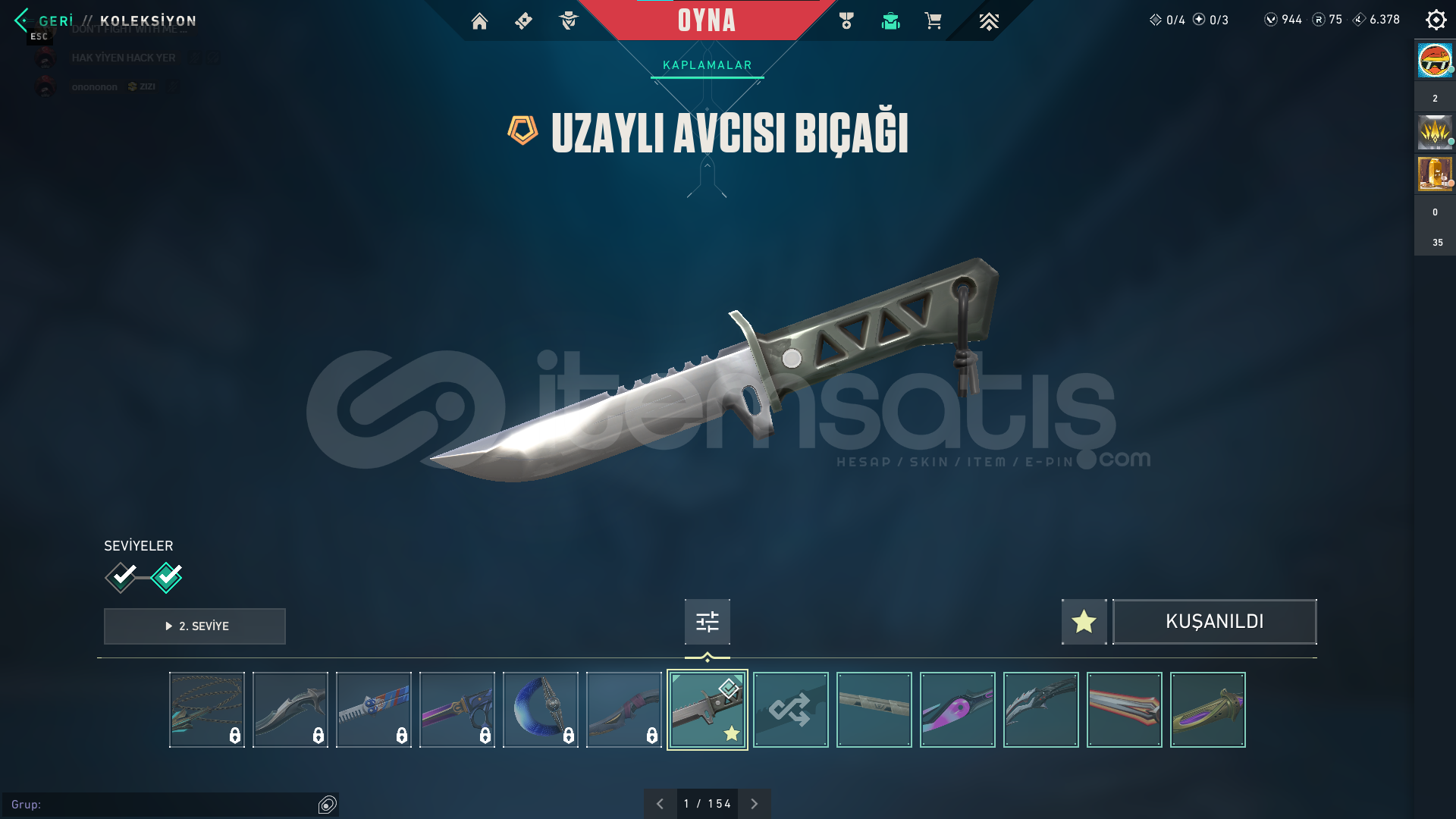 Gold 1Uzaylı Avcısı BıçağıSır Çiçeği KunaiMinima Karambit6 BattlepassYıldız Belası VandalGaia VandalEjder VandalCesur Yürek VandalEgo VandalEvrim VandalOni PhantomYağmacı PhantomÖzel Harekat PhantomRadyant Krizi SpectreEvori GhostGaia GhostSeri Tetik Sherrifİyon SherrifAsil ClassicGaia MarshalCesur Yürek OperatörFatih Guardian Asil OdinYücelik Uğurluğu